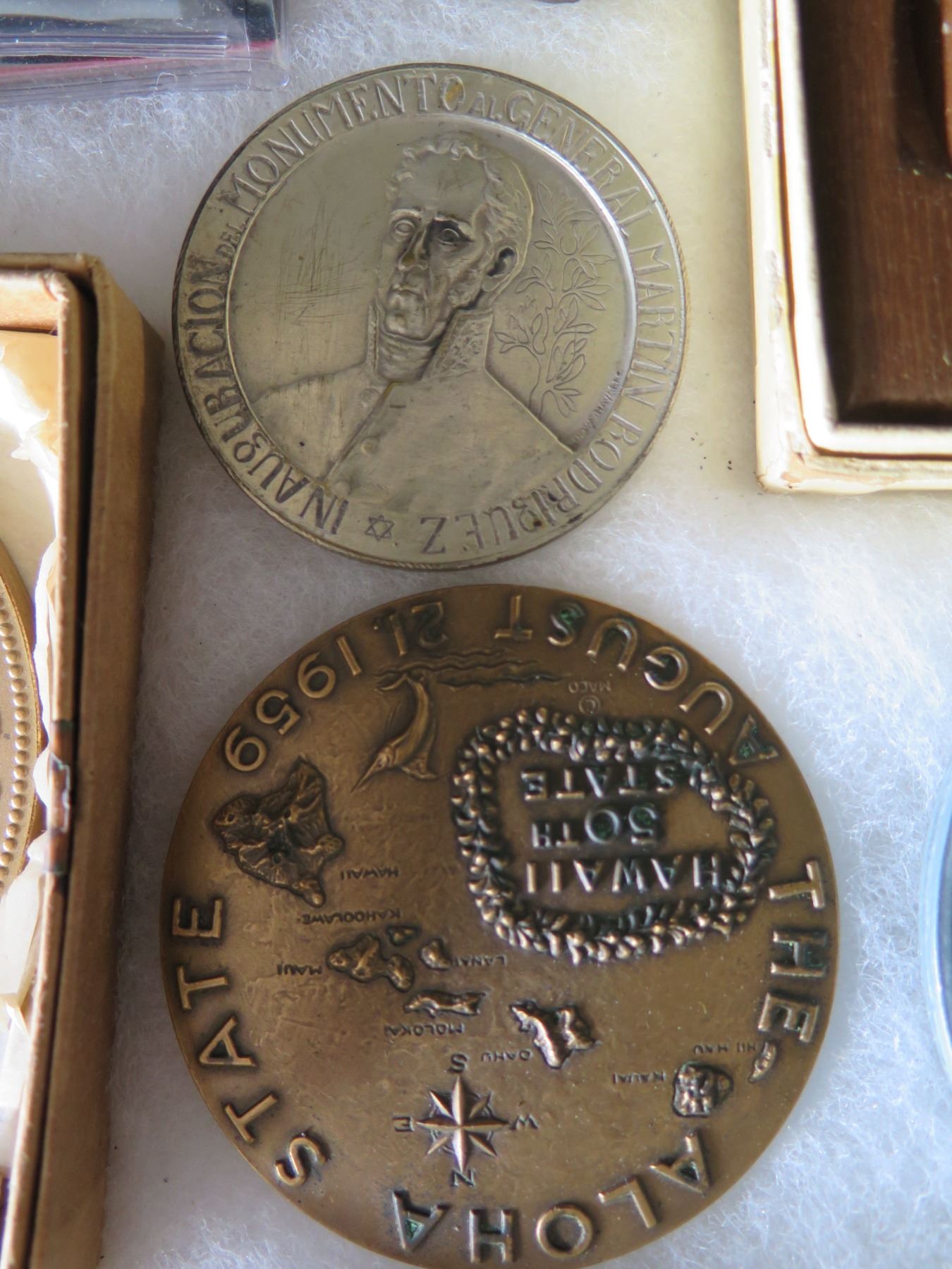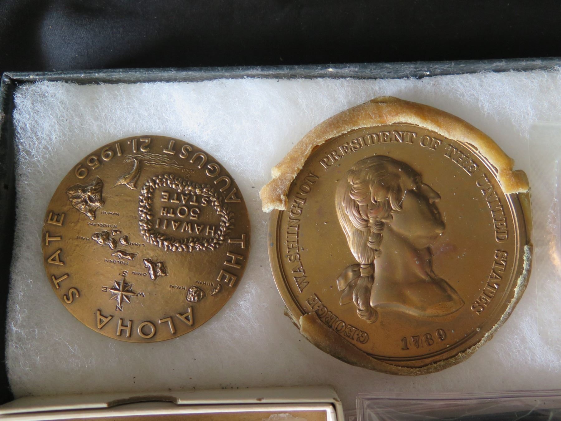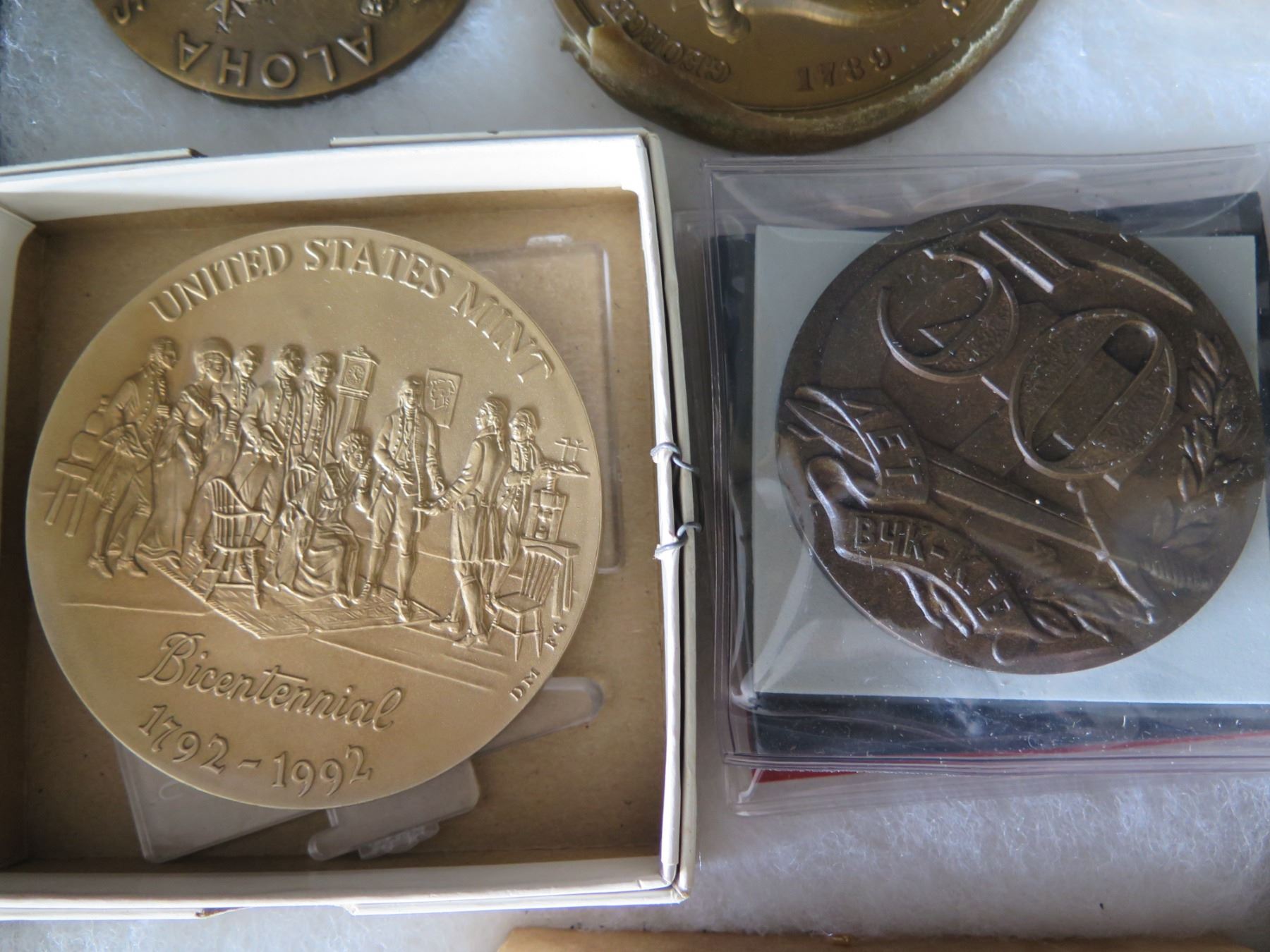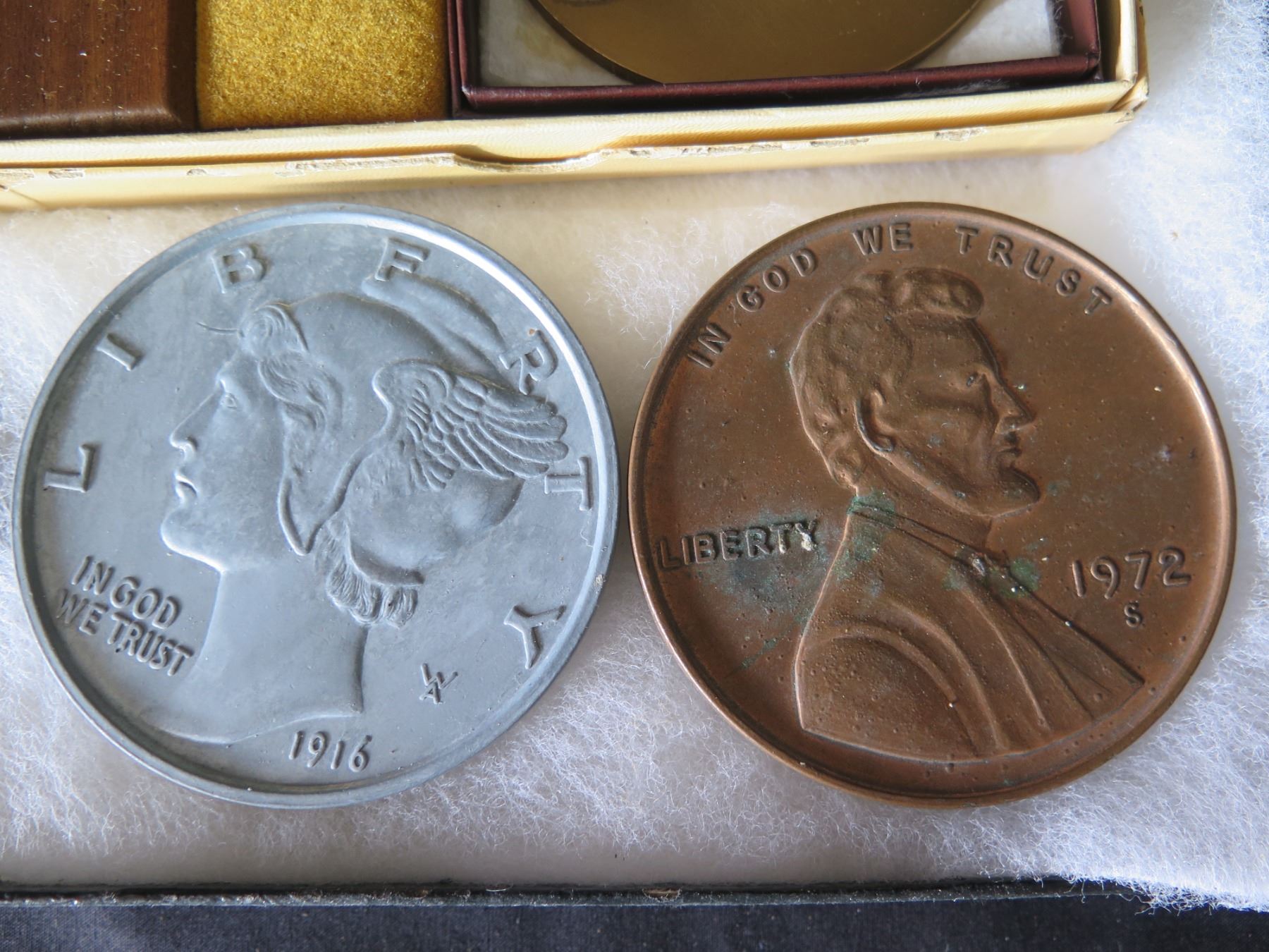 Qty 15 Medals & Coins: Bicentennial, Golden Land, 120 AET, Aloha State, etc in Display Case 16"L
