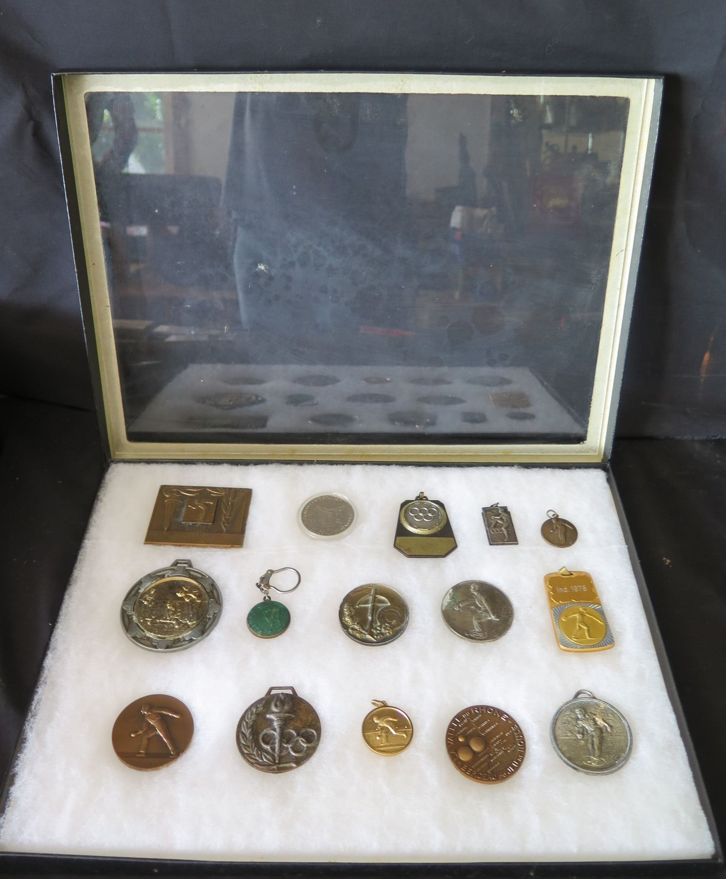 Qty 15 Medals & Coins: Olympics, La Vallee du Rhone, Athletes, etc in Display Case 16"L