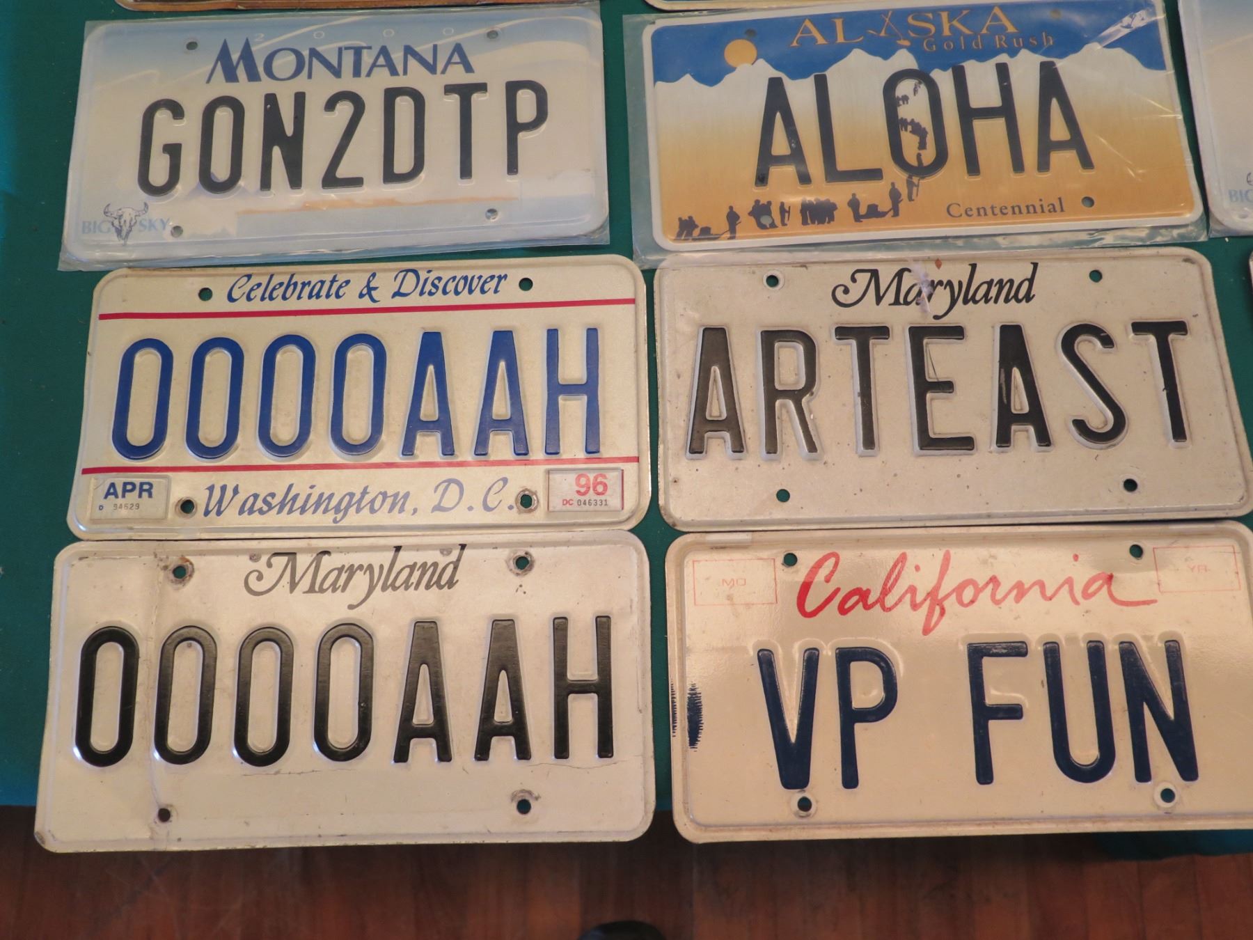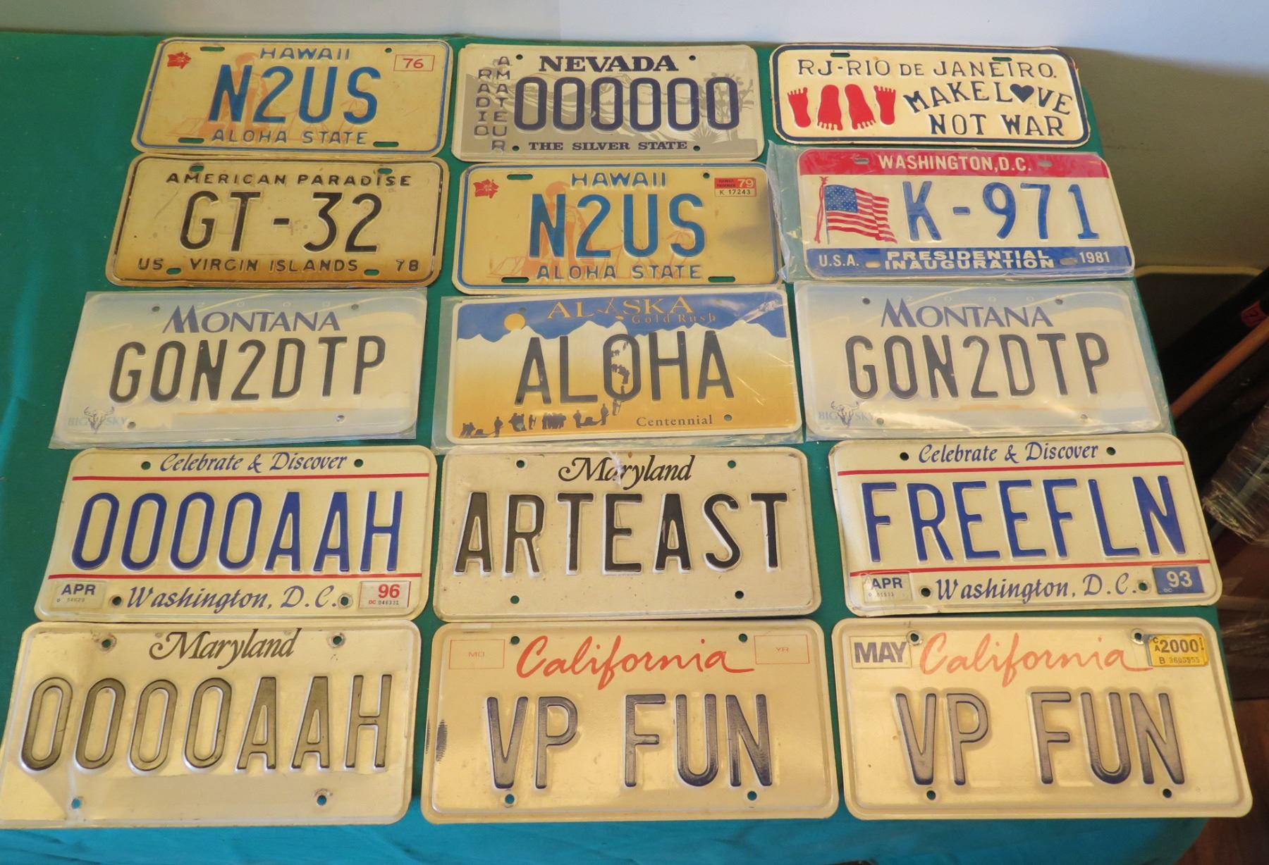 Qty 15 Metal License Plates: VP Fun, Aloha, 0000AAH, ArtEast, etc