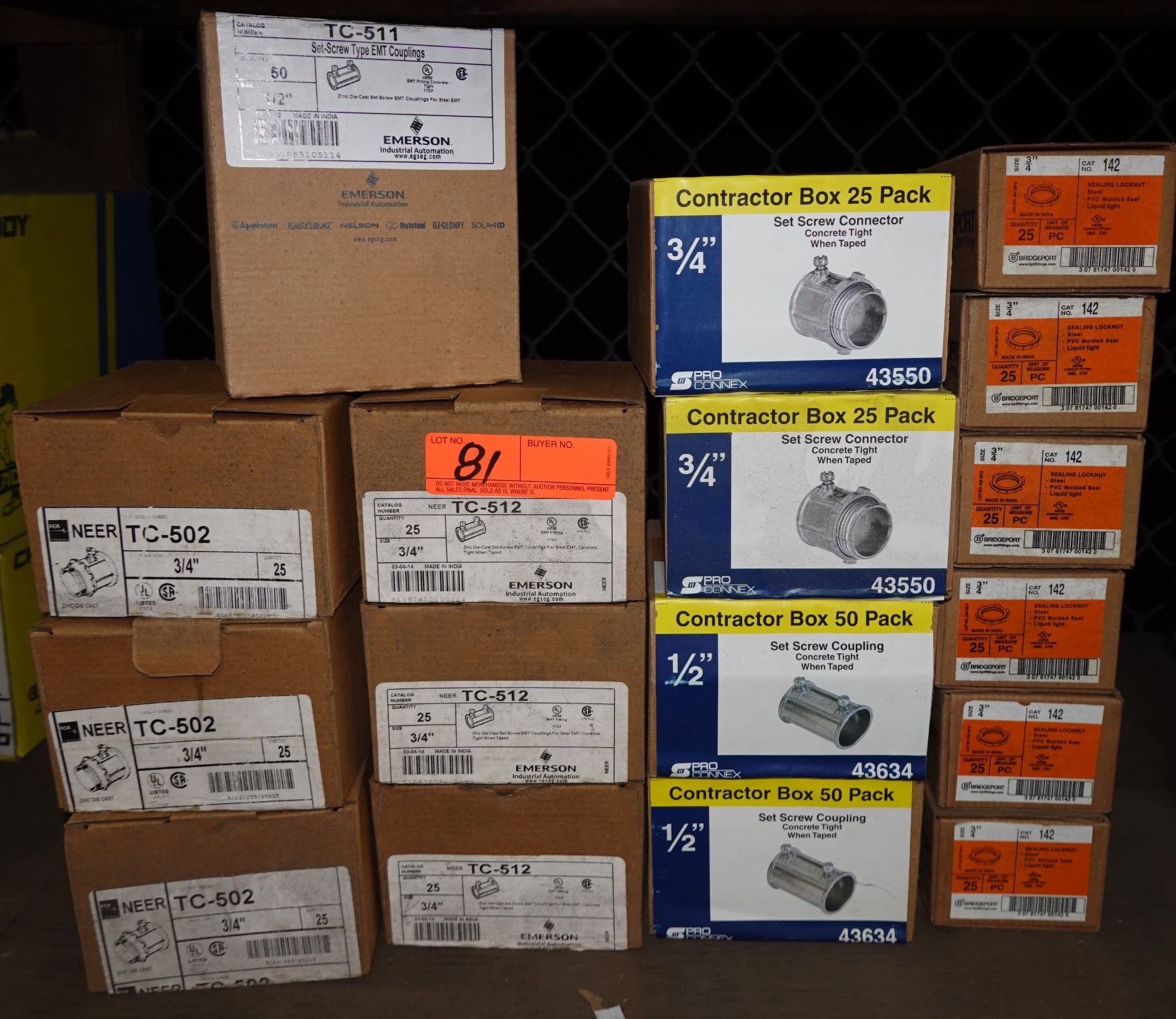 Qty 17 Boxes Emerson Set-Screw Couplings, Neer TC-502 & Pro Connex Connectors, Bridgeport Locknuts, etc