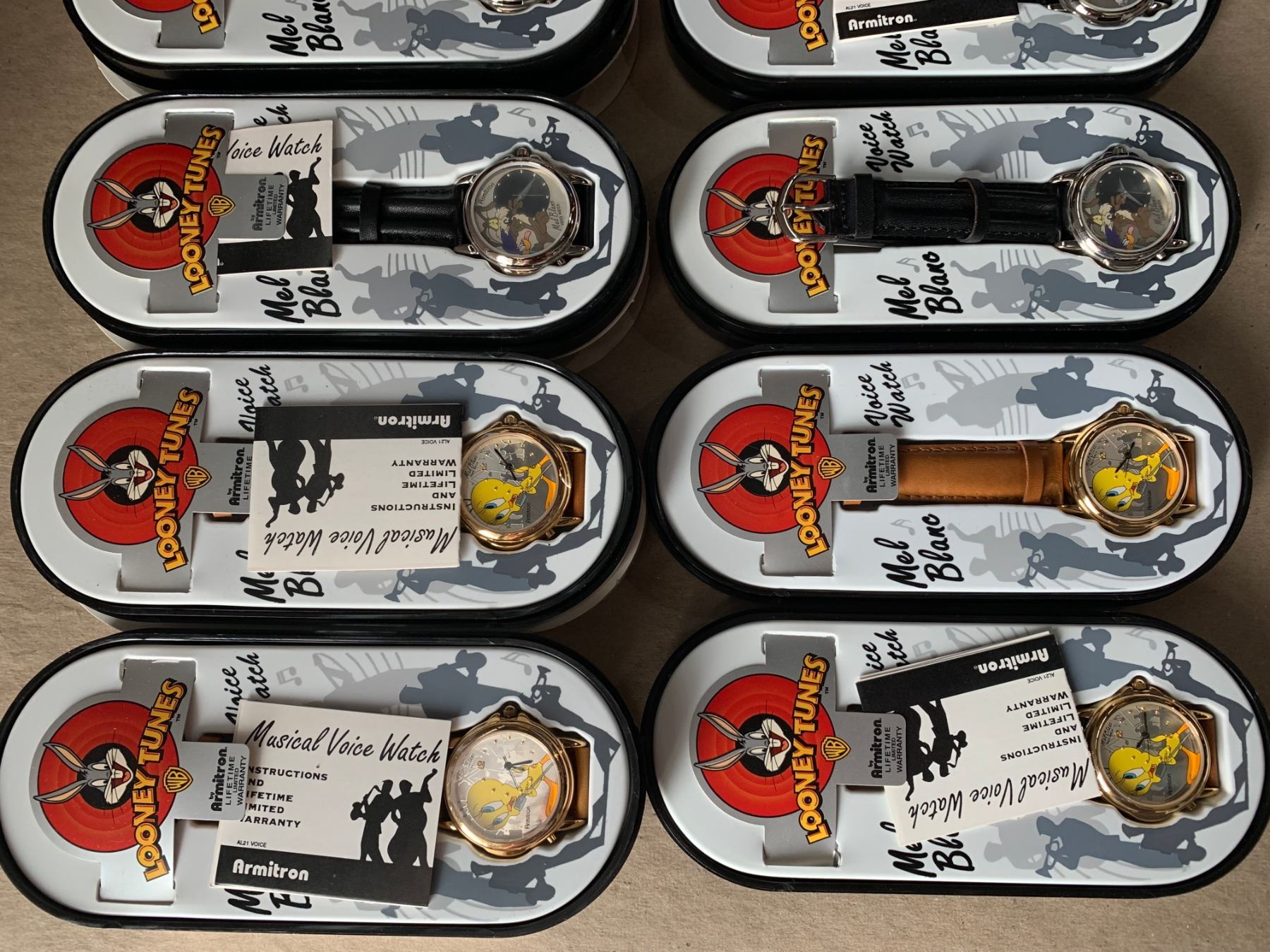 Qty 18 Armitron Looney Tunes Mel Blanc Musical Voice Watches w/ Stand. These were only opened for the picture-taking.