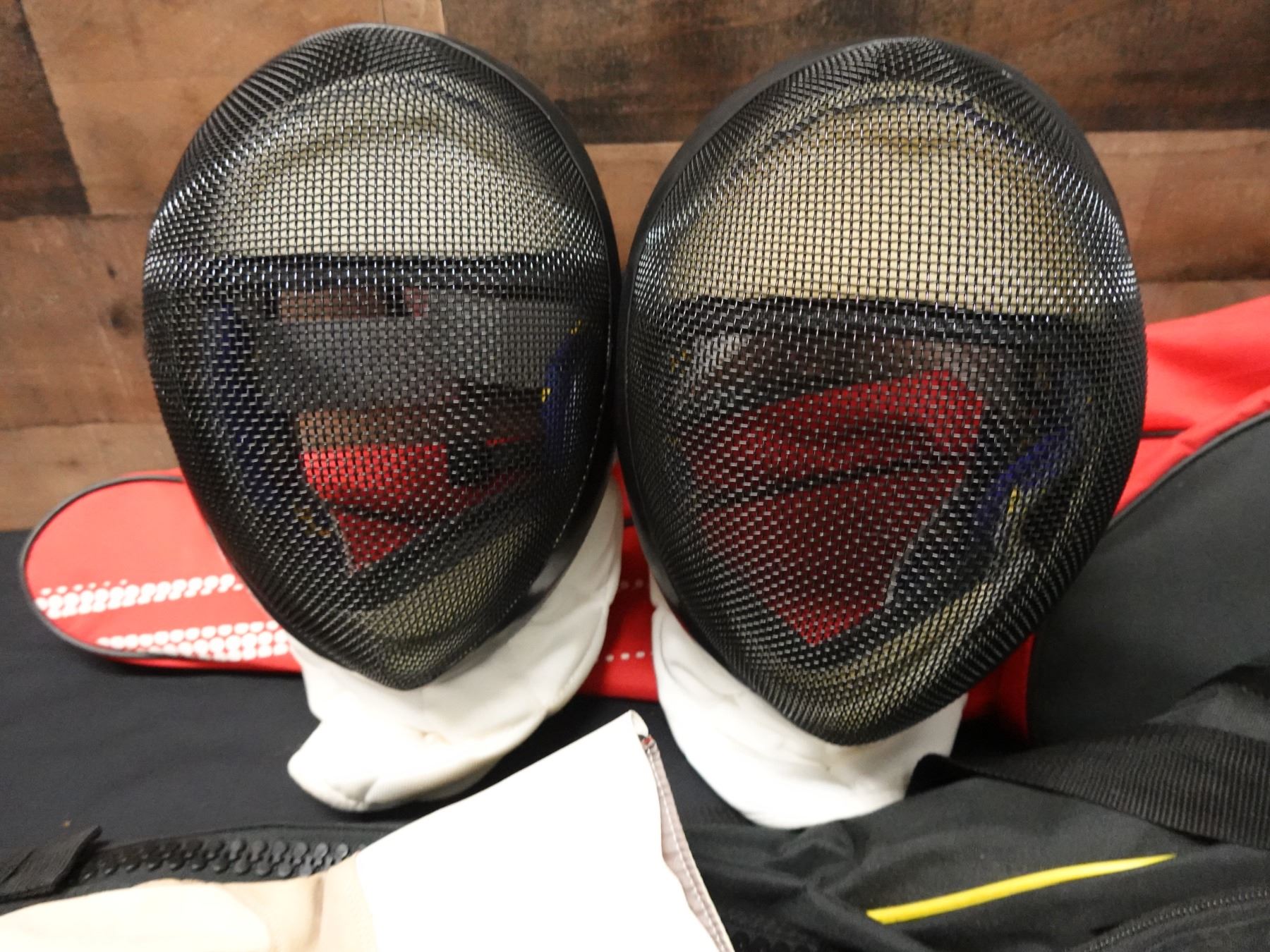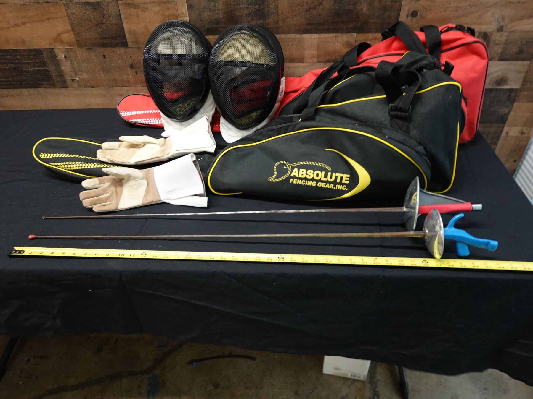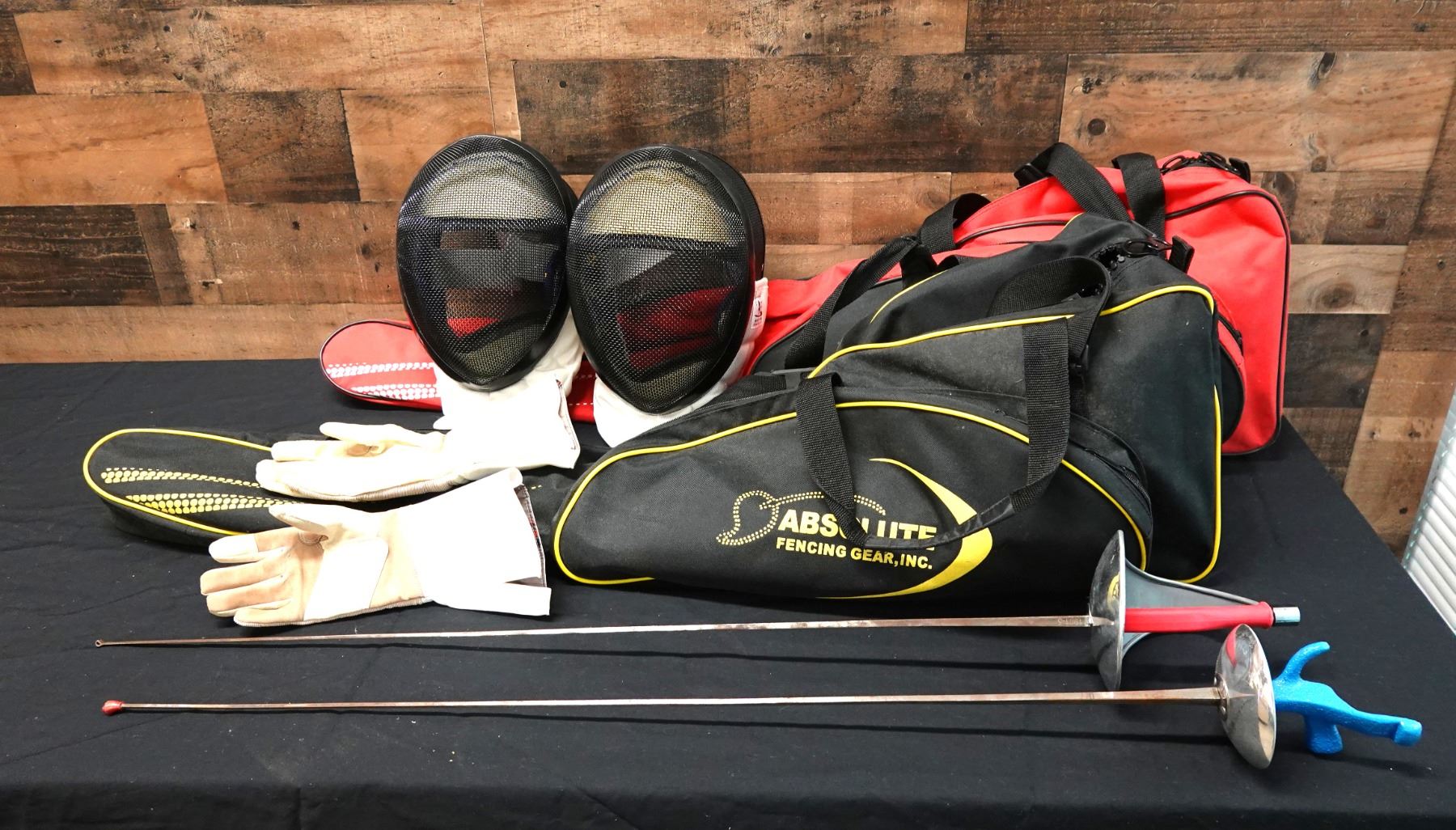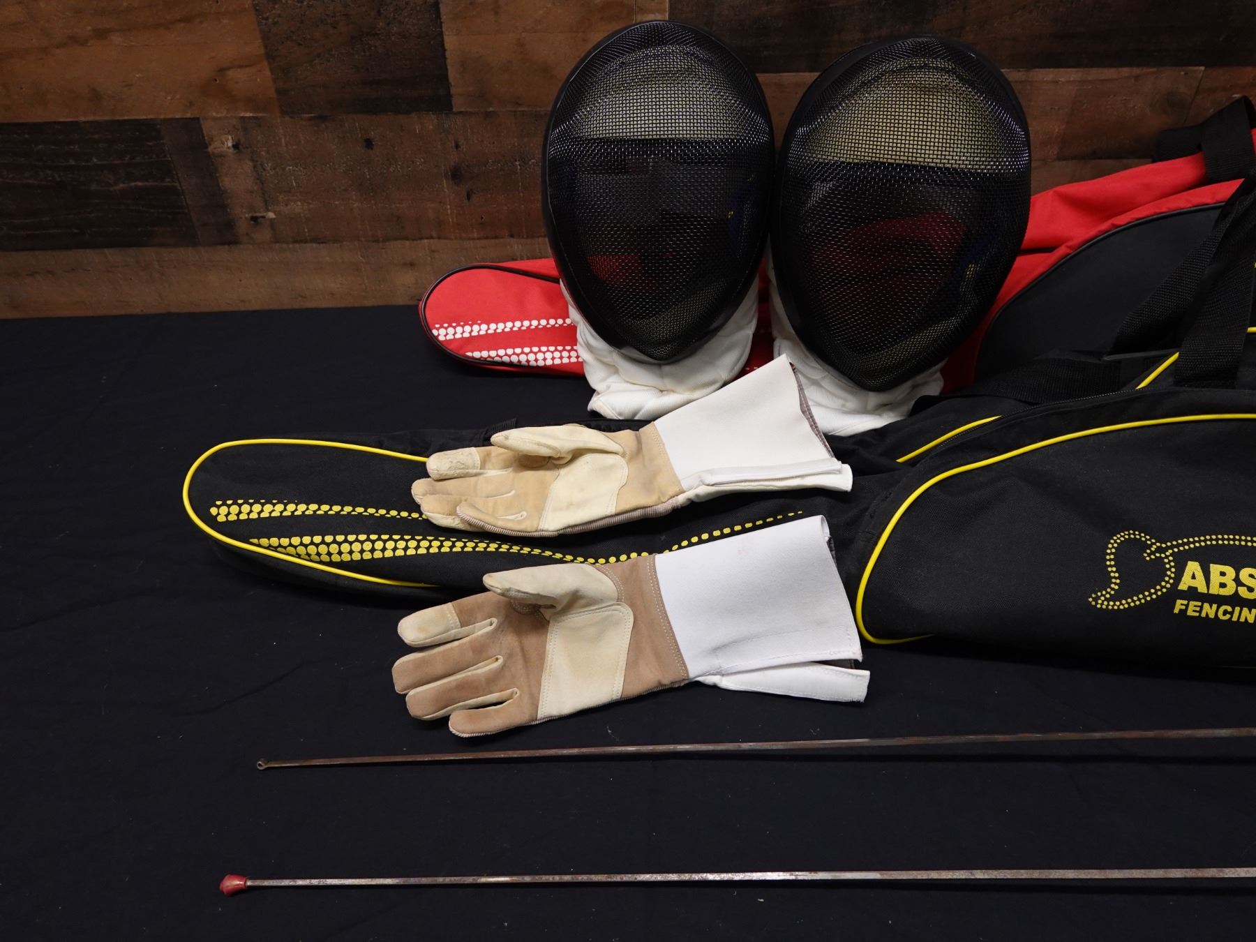 Seller reports two full fencing sets featuring a saber and foil. The foil appears to be fitted with a Russian grip. Includes masks, gloves, and gear bags. Both are right handed.