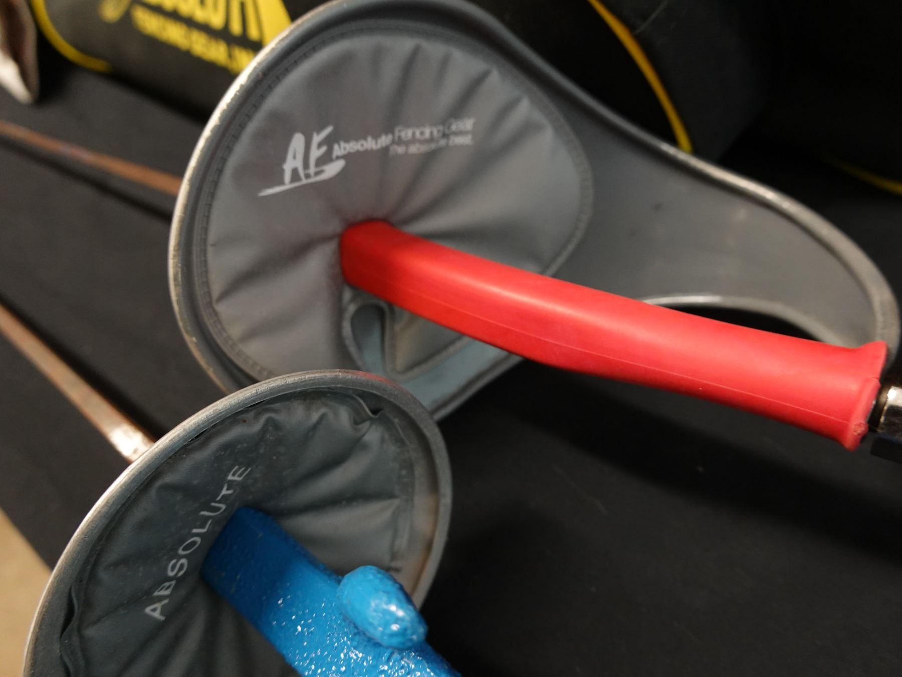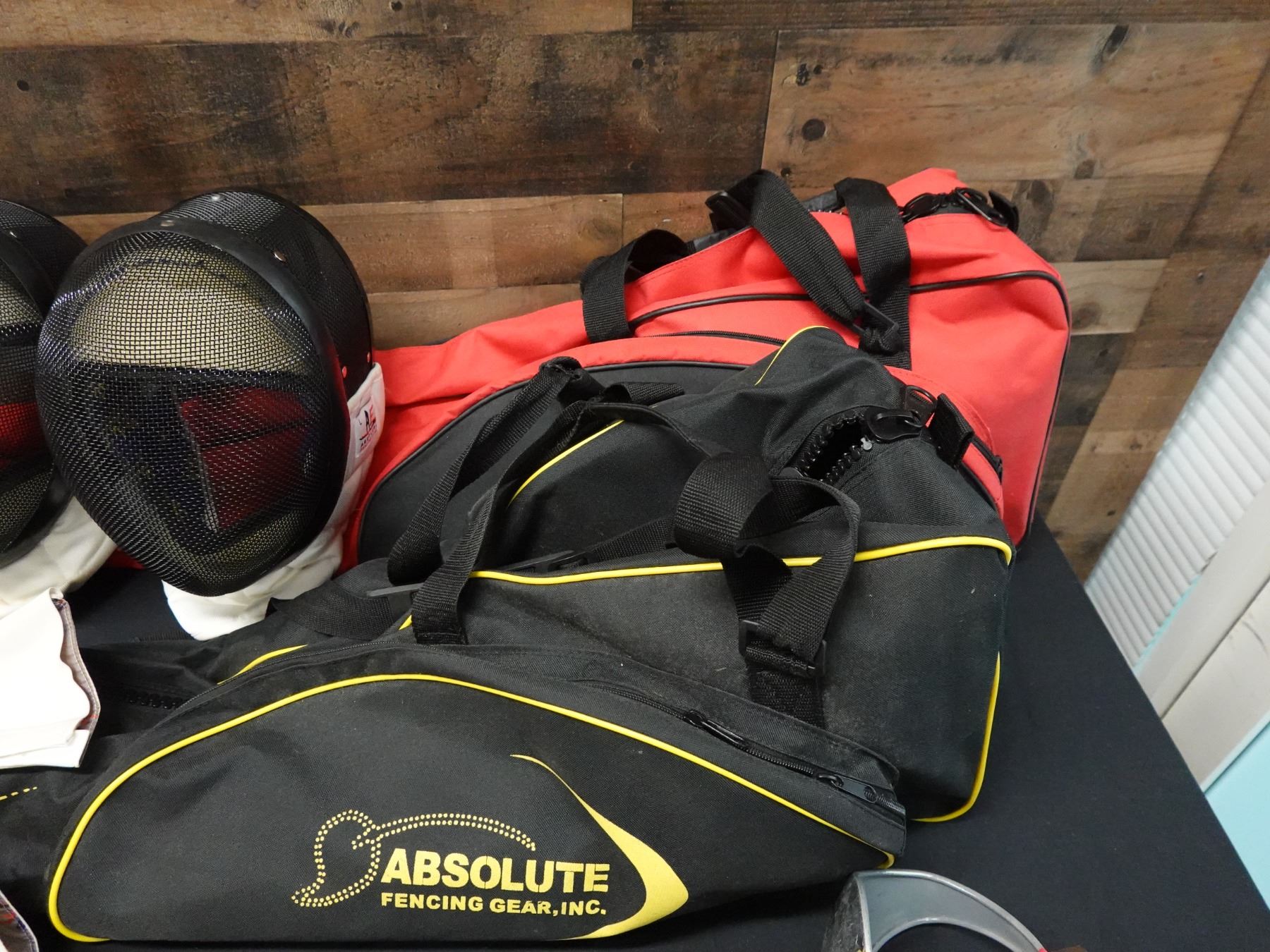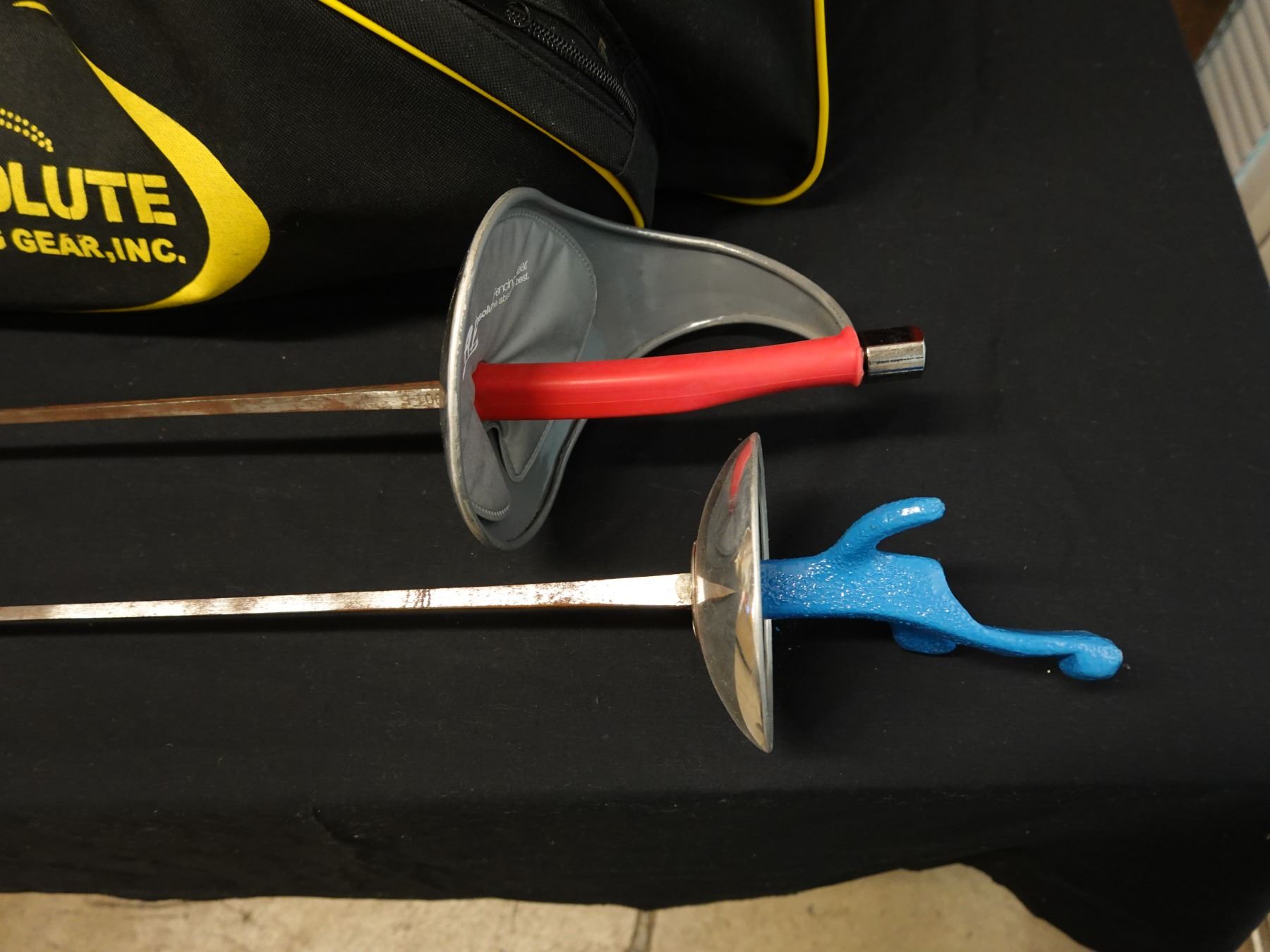 Seller reports two full fencing sets featuring a saber and foil. The foil appears to be fitted with a Russian grip. Includes masks, gloves, and gear bags. Both are right handed.