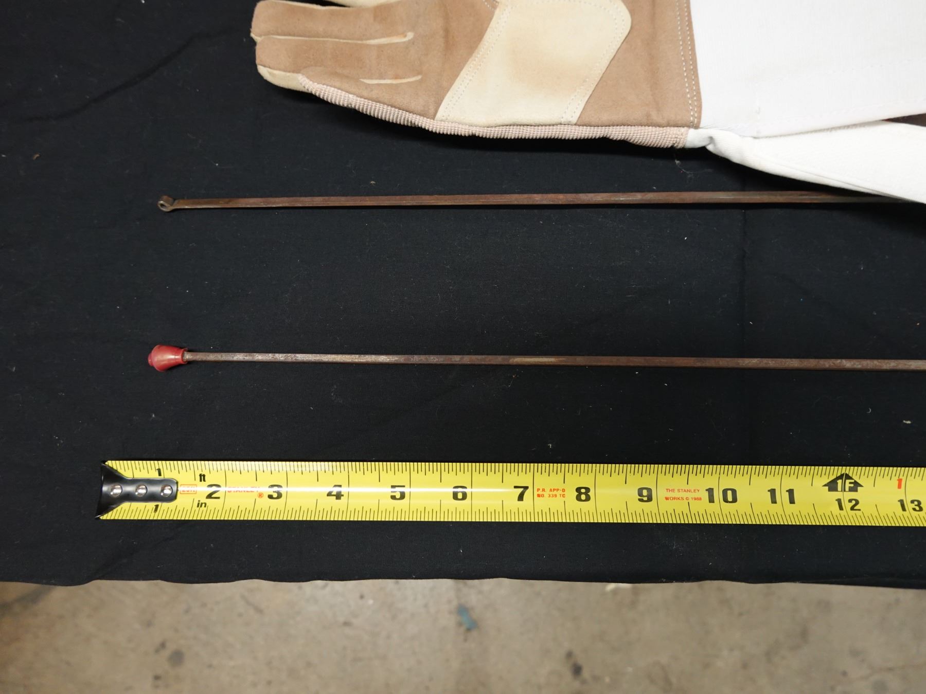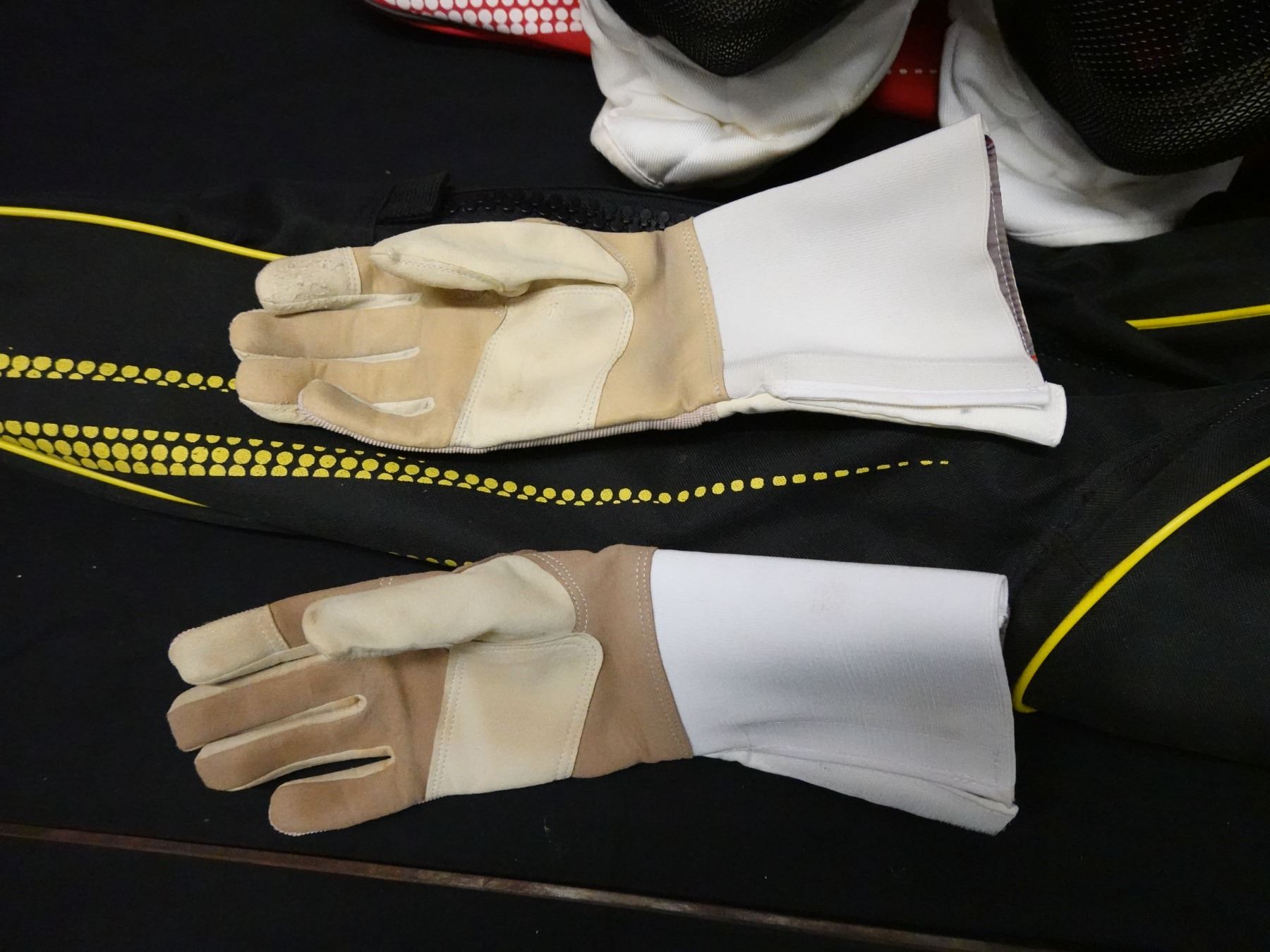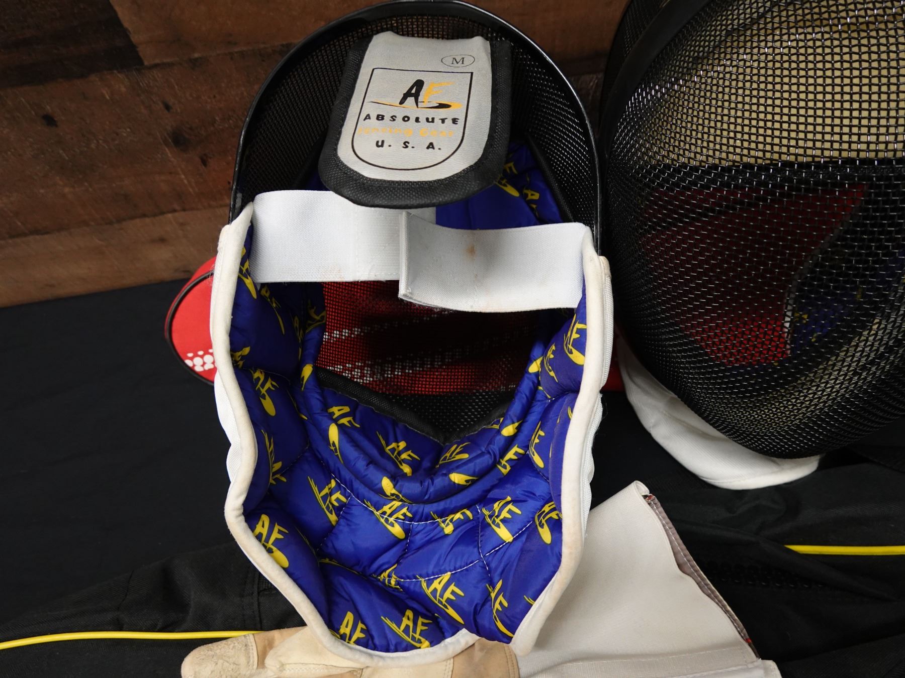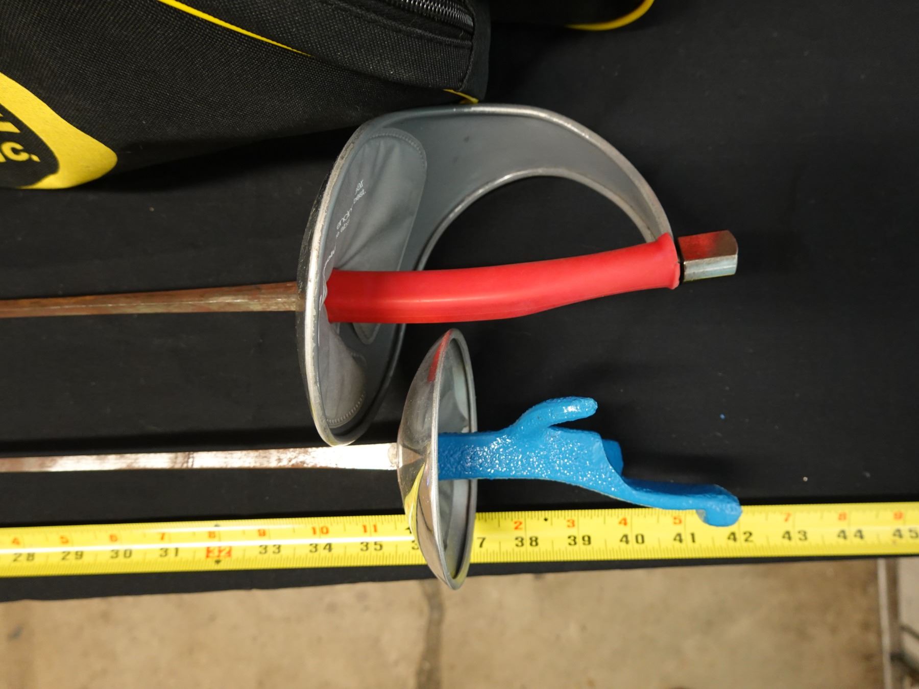 Seller reports two full fencing sets featuring a saber and foil. The foil appears to be fitted with a Russian grip. Includes masks, gloves, and gear bags. Both are right handed.