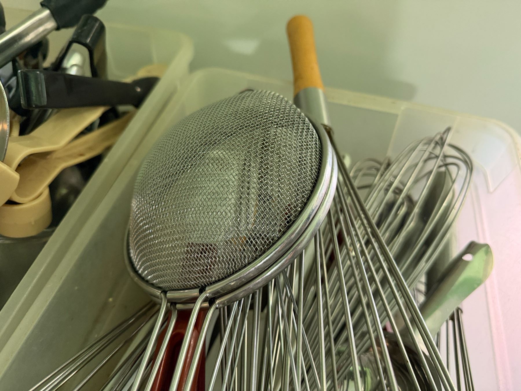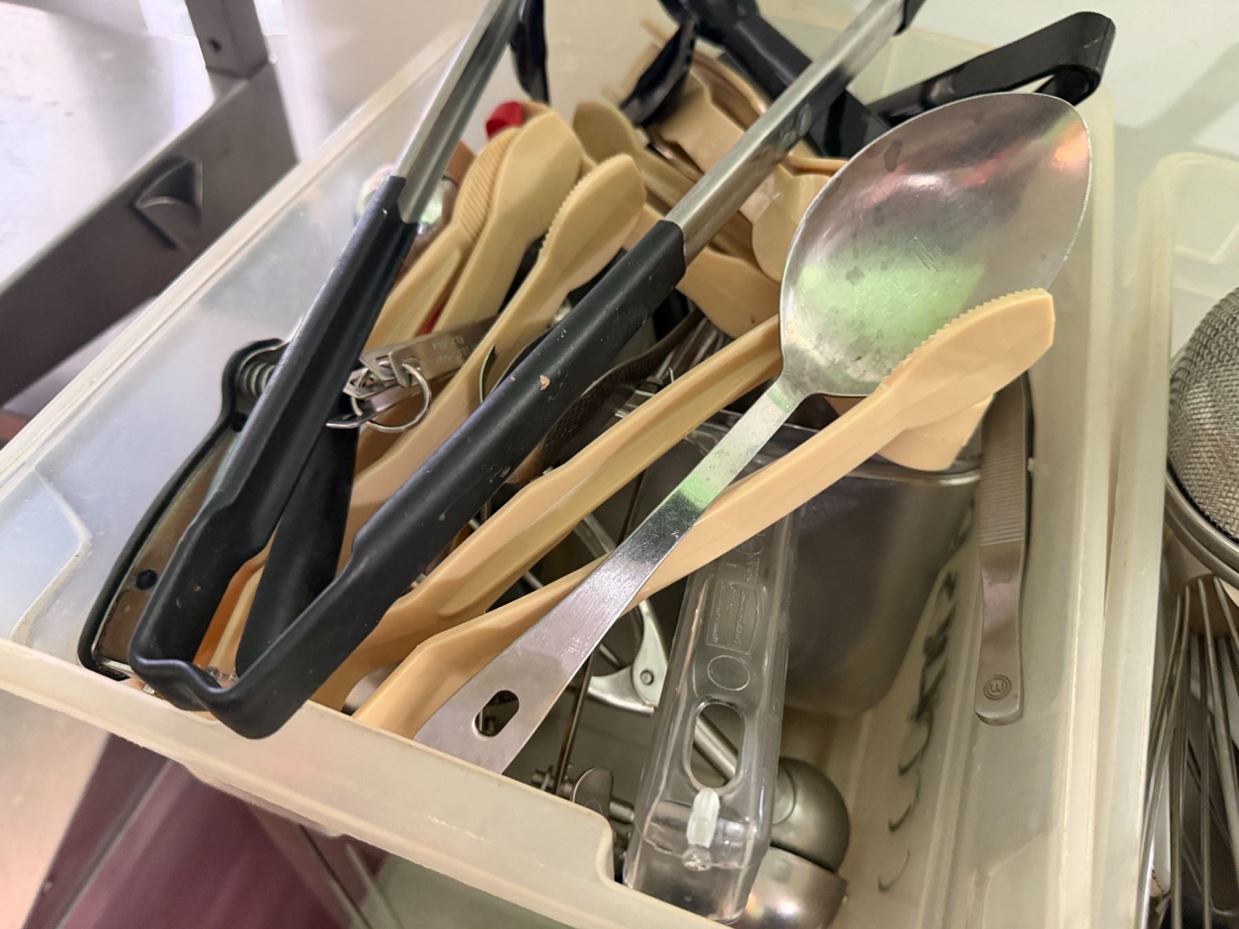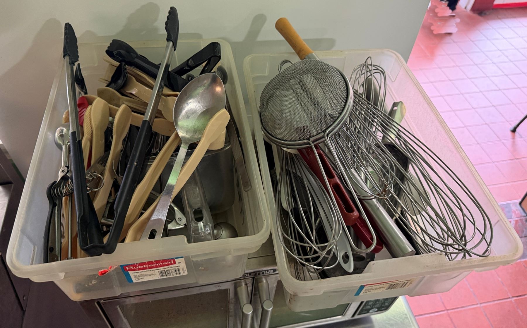 Qty 2 Bins Multiple Kitchen Utensils: Whisks, Strainers, Spatulas, Tongs, Spoons, etc