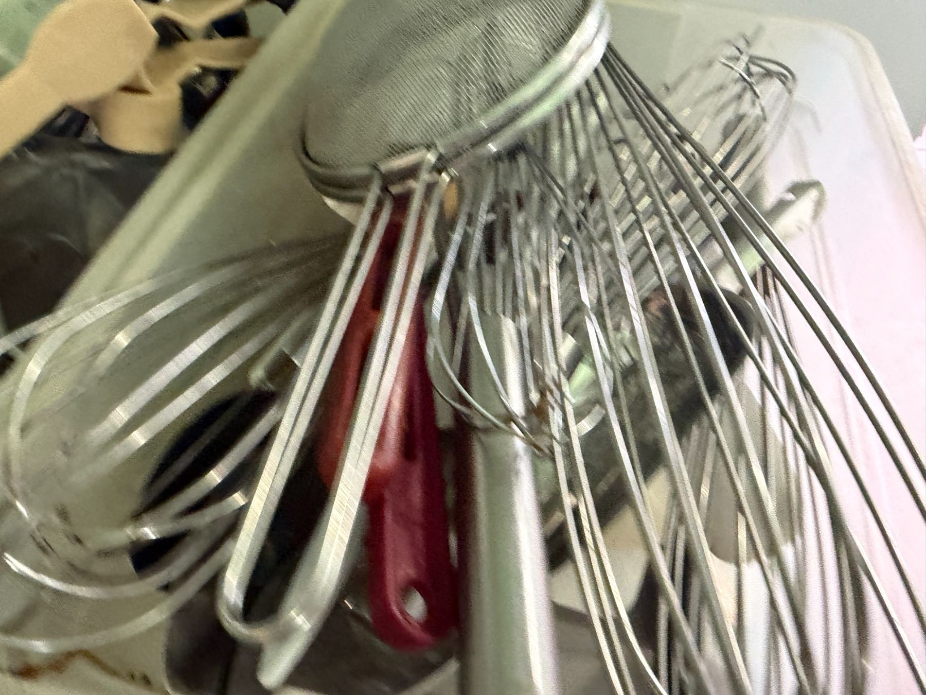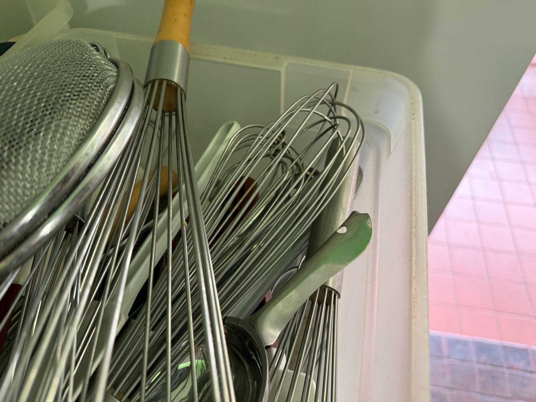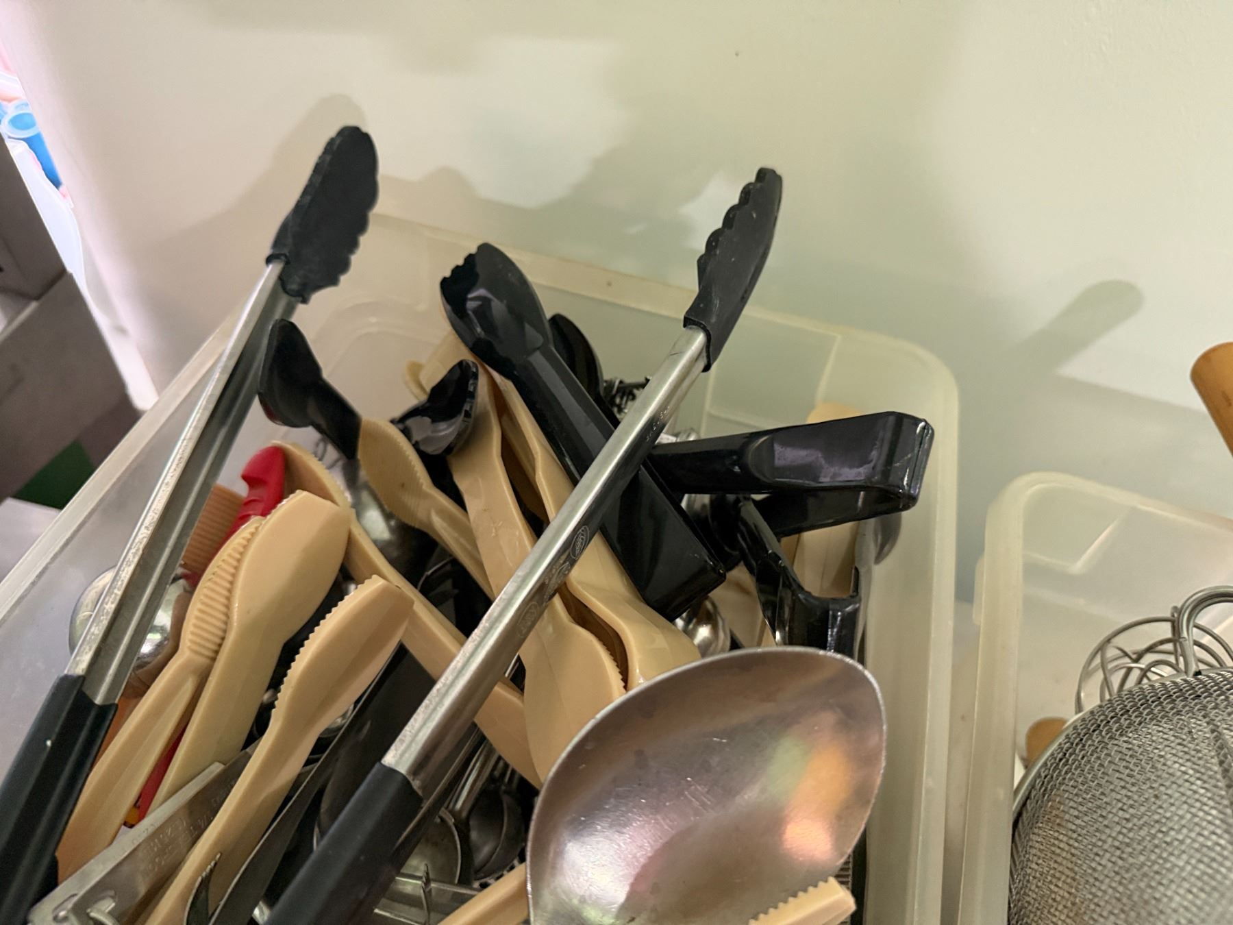 Qty 2 Bins Multiple Kitchen Utensils: Whisks, Strainers, Spatulas, Tongs, Spoons, etc