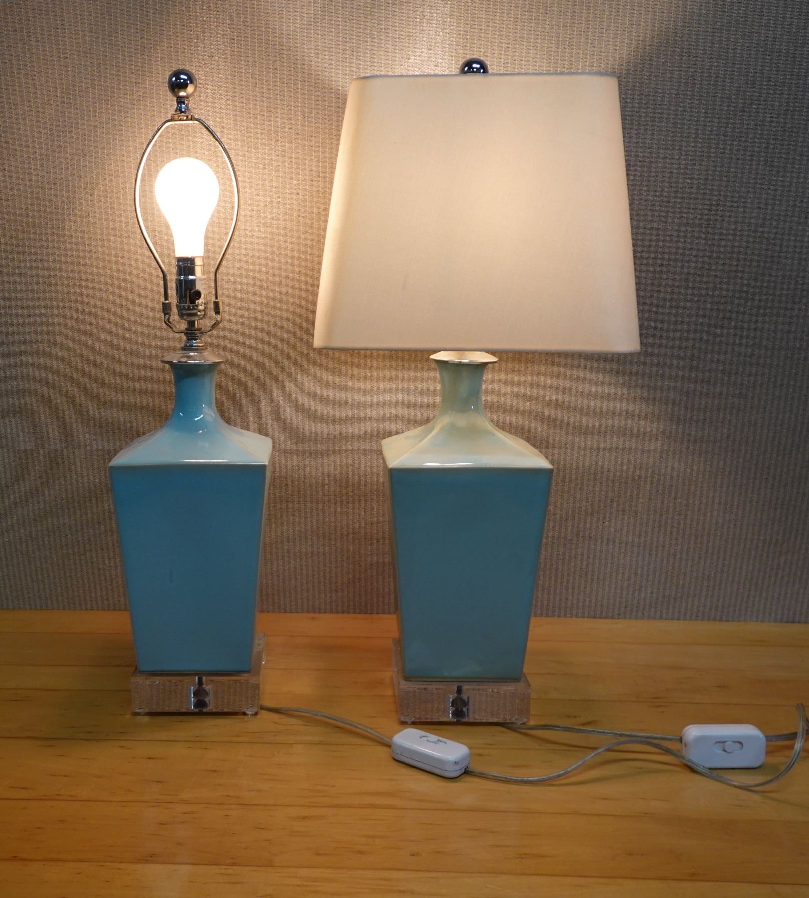 Qty 2 Blue Ceramic Table Lamp Bases w/ 1 Shade 7" x 26.5"H (w/ shade)