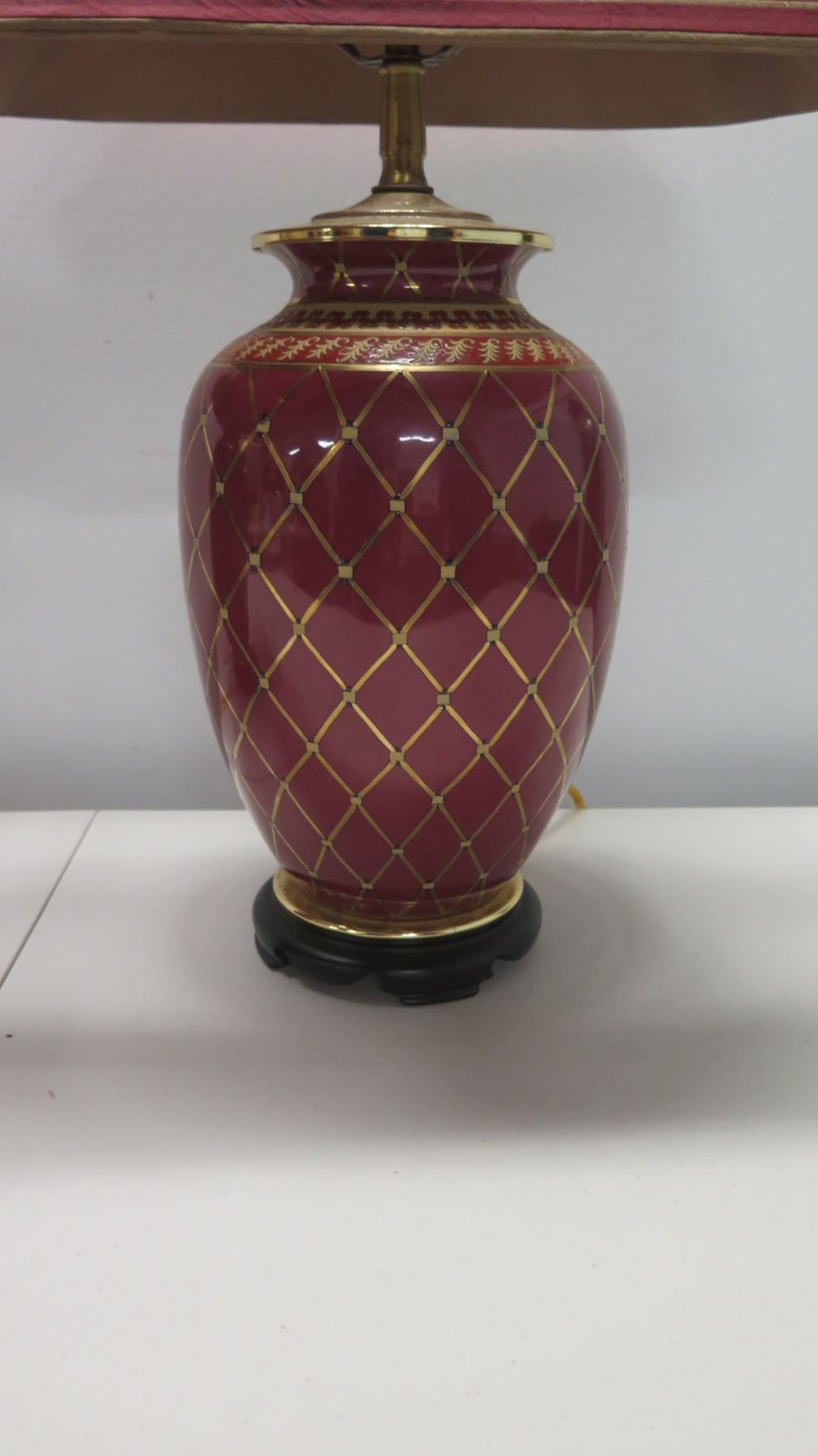 Qty 2 Burgundy Table Lamps w/ Gilt Accents & Matching Lamp Shades