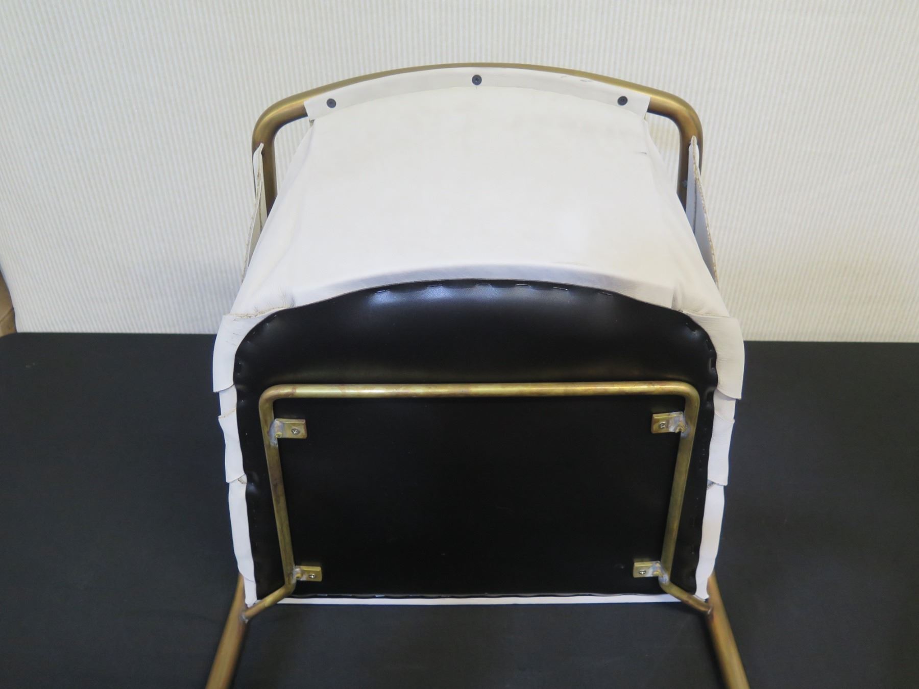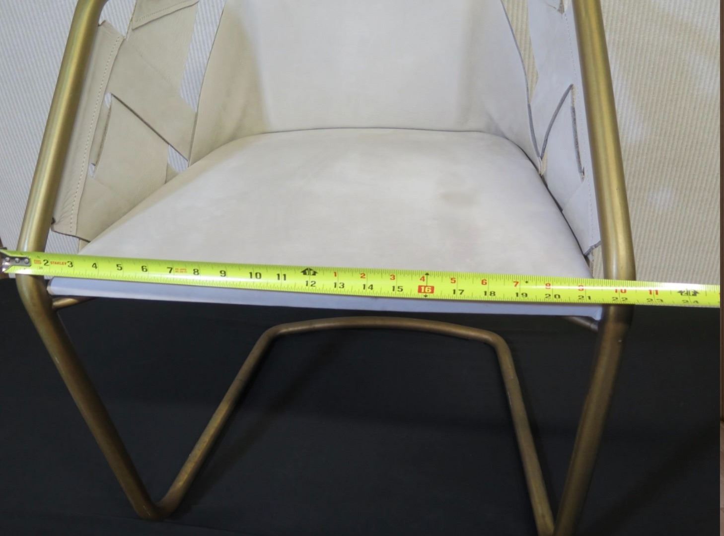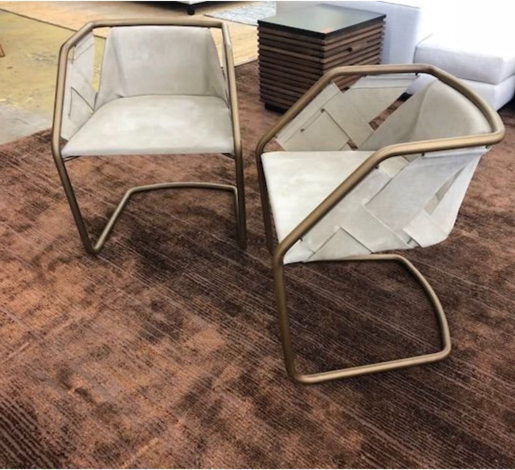Qty 2 Cantilever Chairs, Natural Leather w/ Brass Frame 22"W x 27"H. Please look through the images and note where we show close-ups of areas with discoloration or general damage.