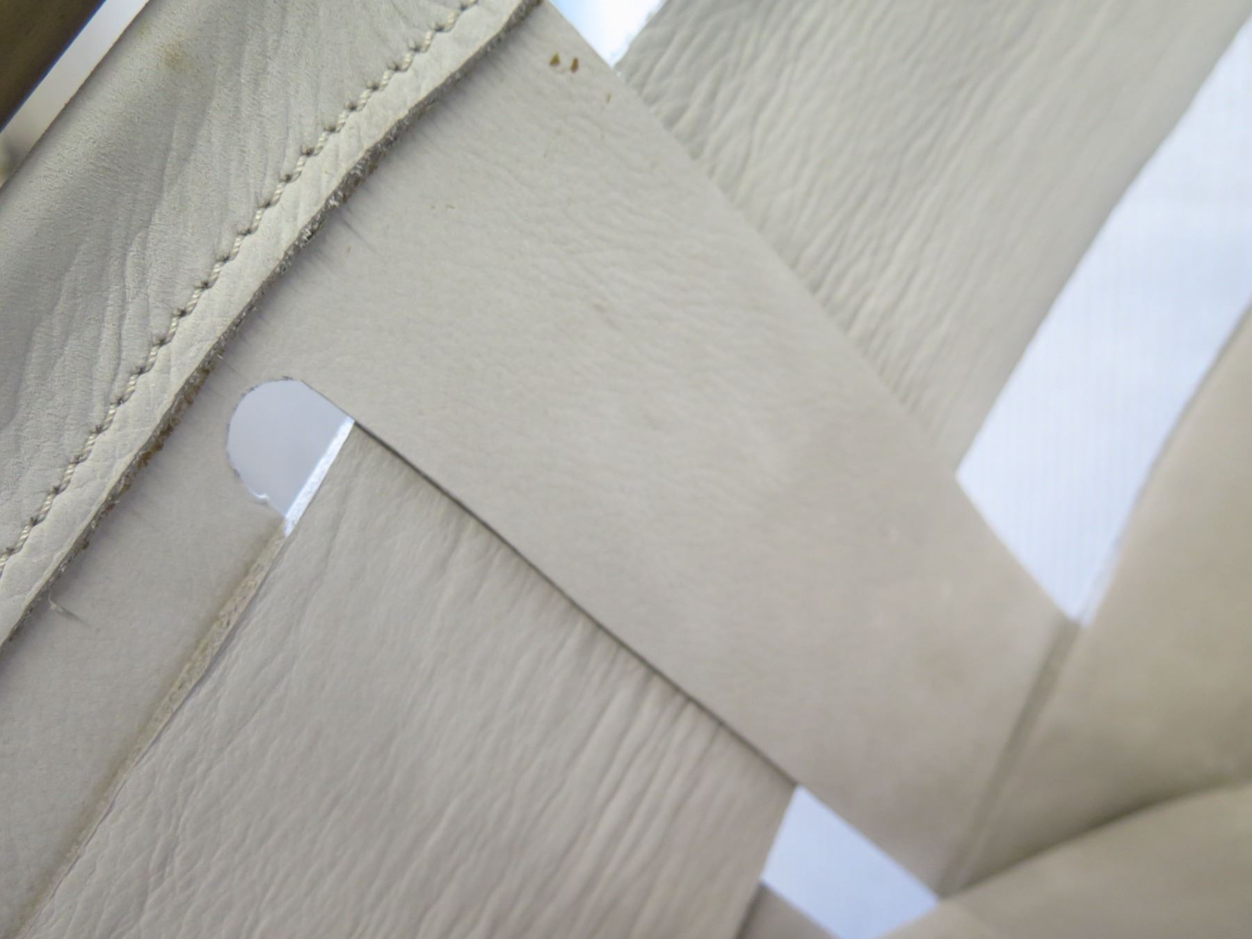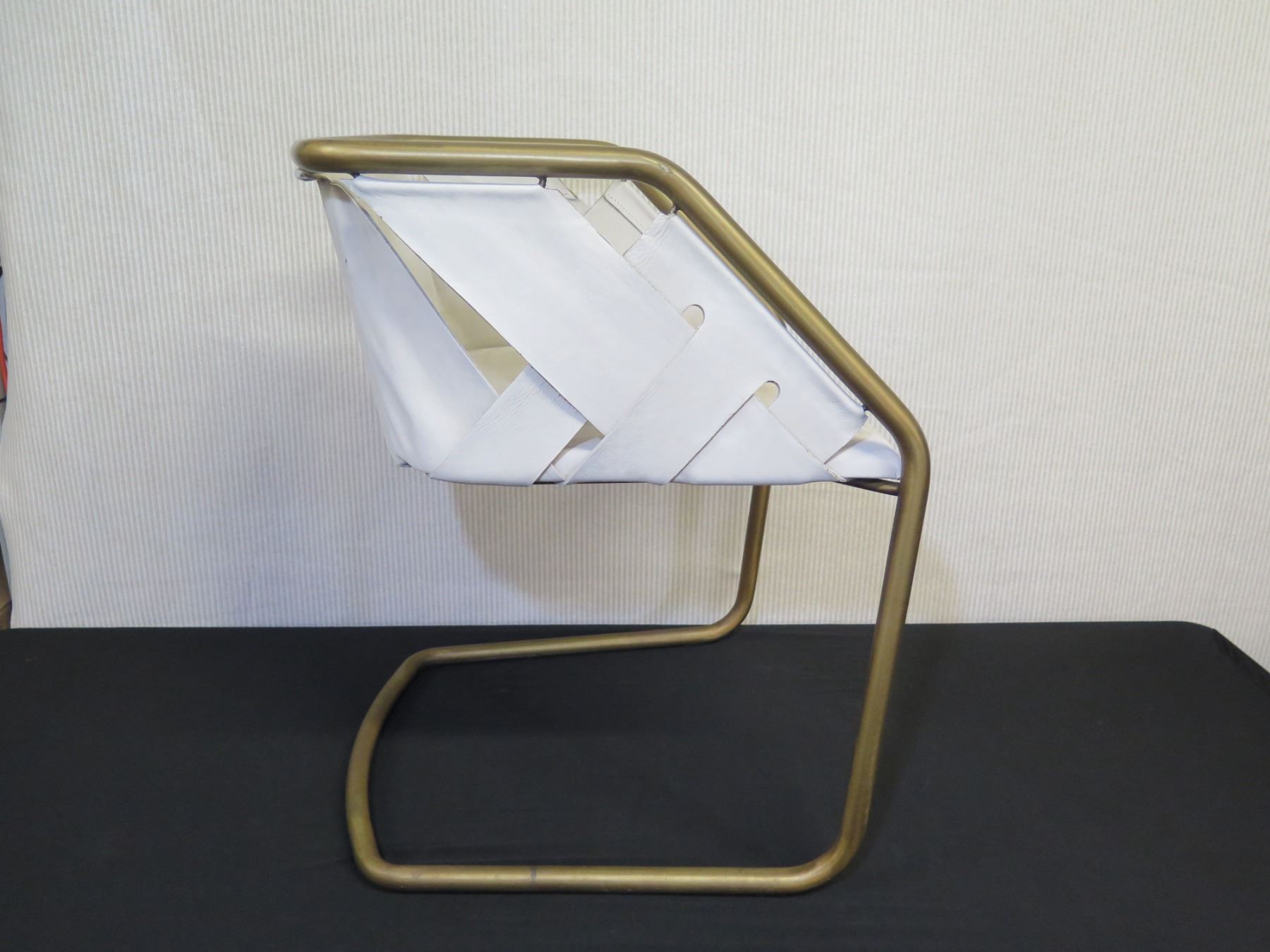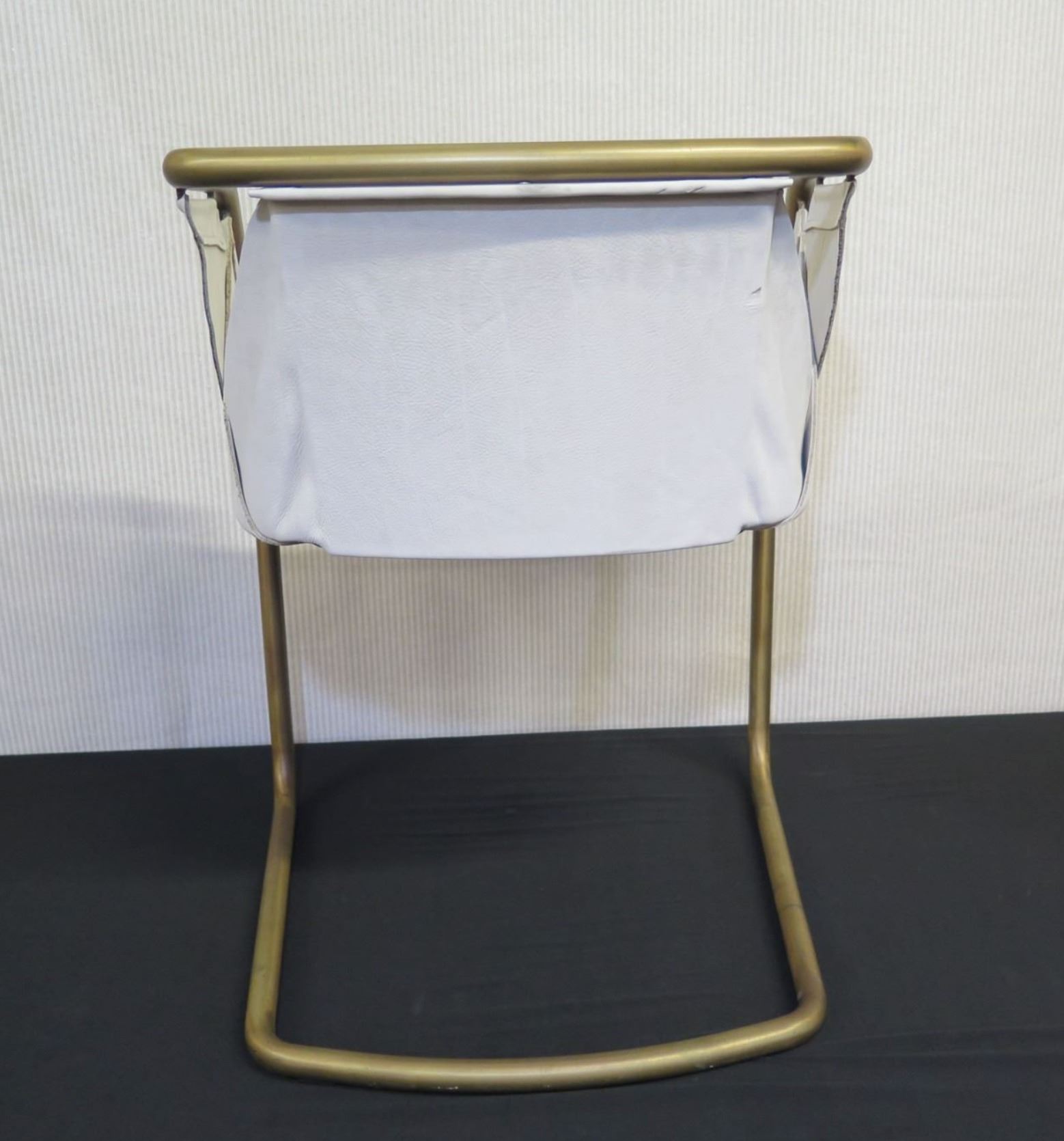 Qty 2 Cantilever Chairs, Natural Leather w/ Brass Frame 22"W x 27"H. Please look through the images and note where we show close-ups of areas with discoloration or general damage.
