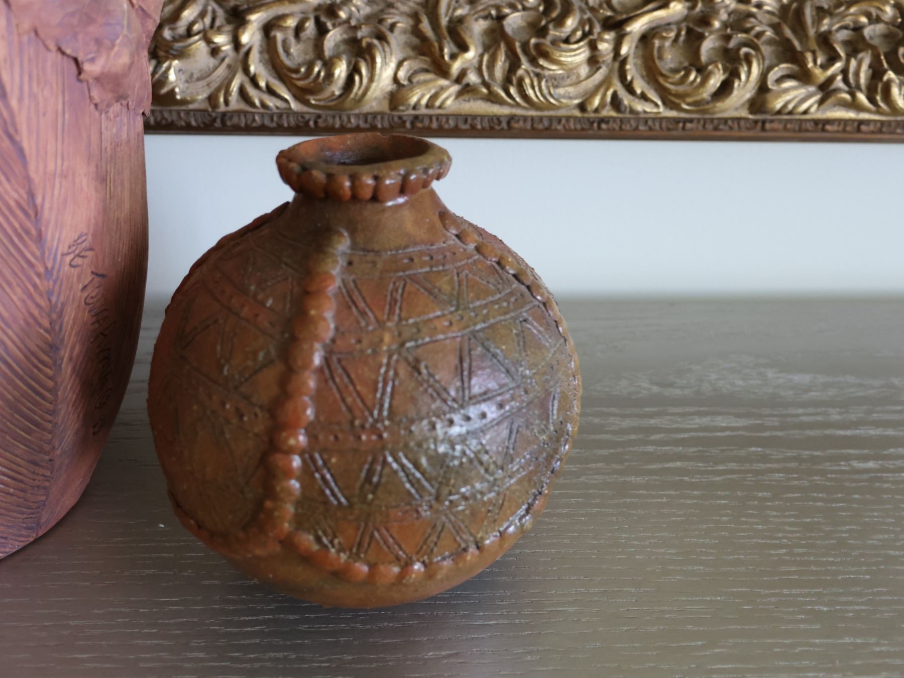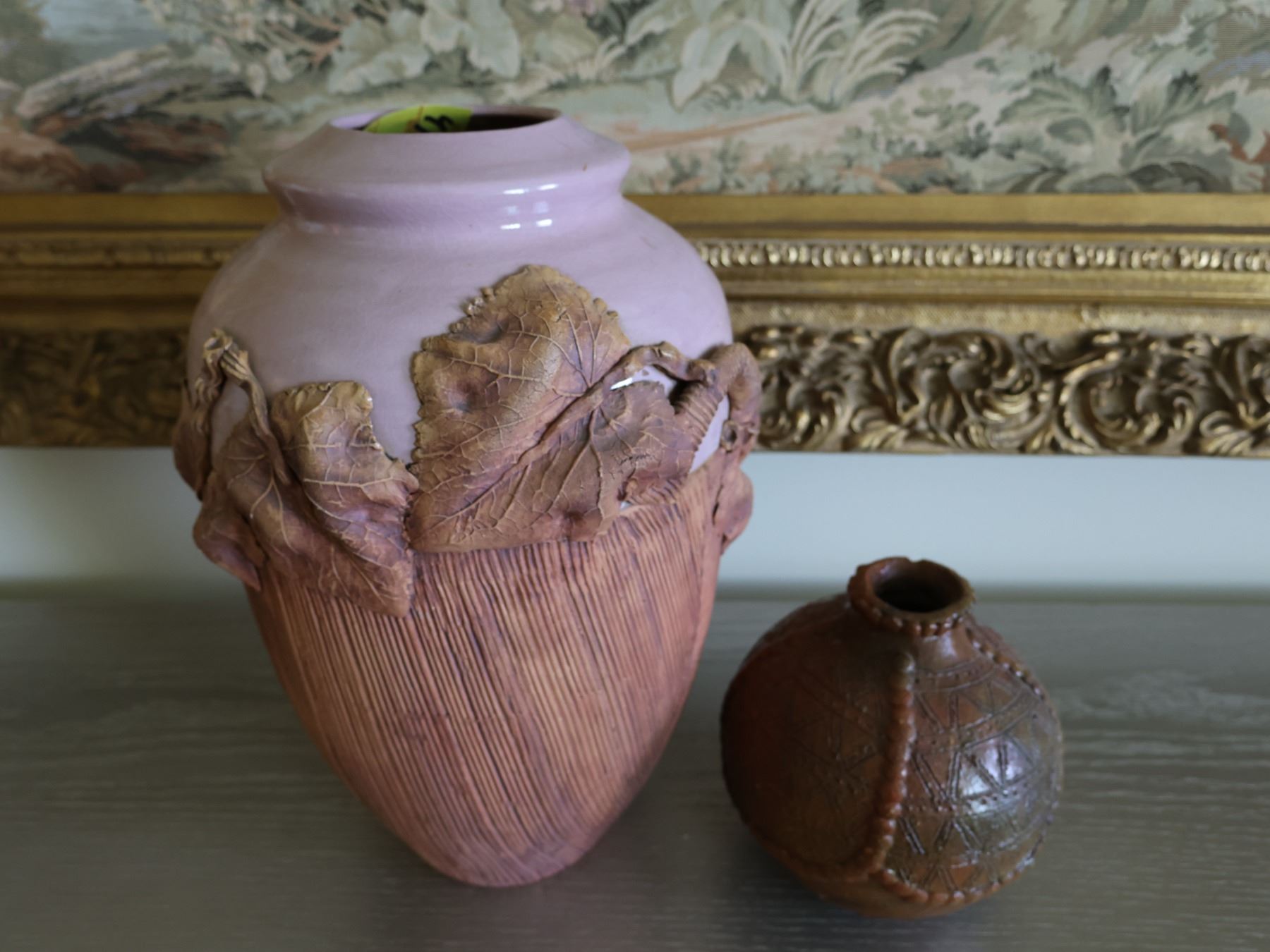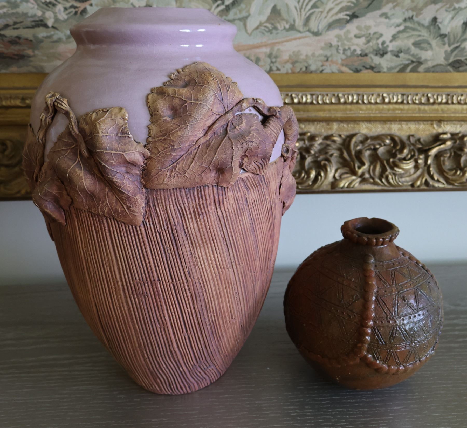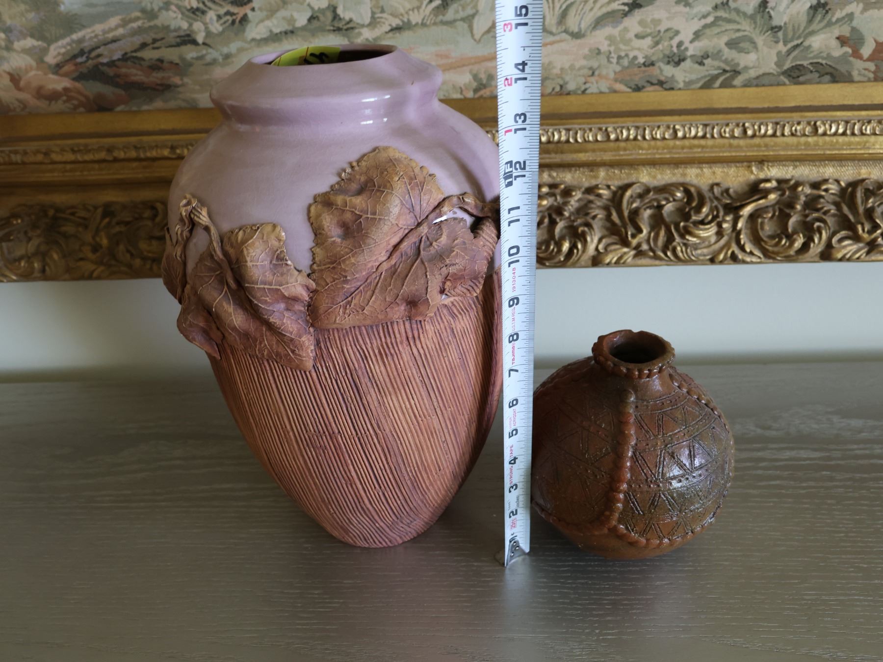 Qty 2 Ceramic Urns: Geometric & Leaf Design, Misc Sizes