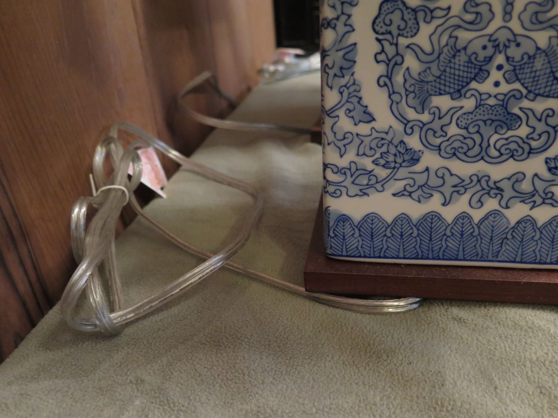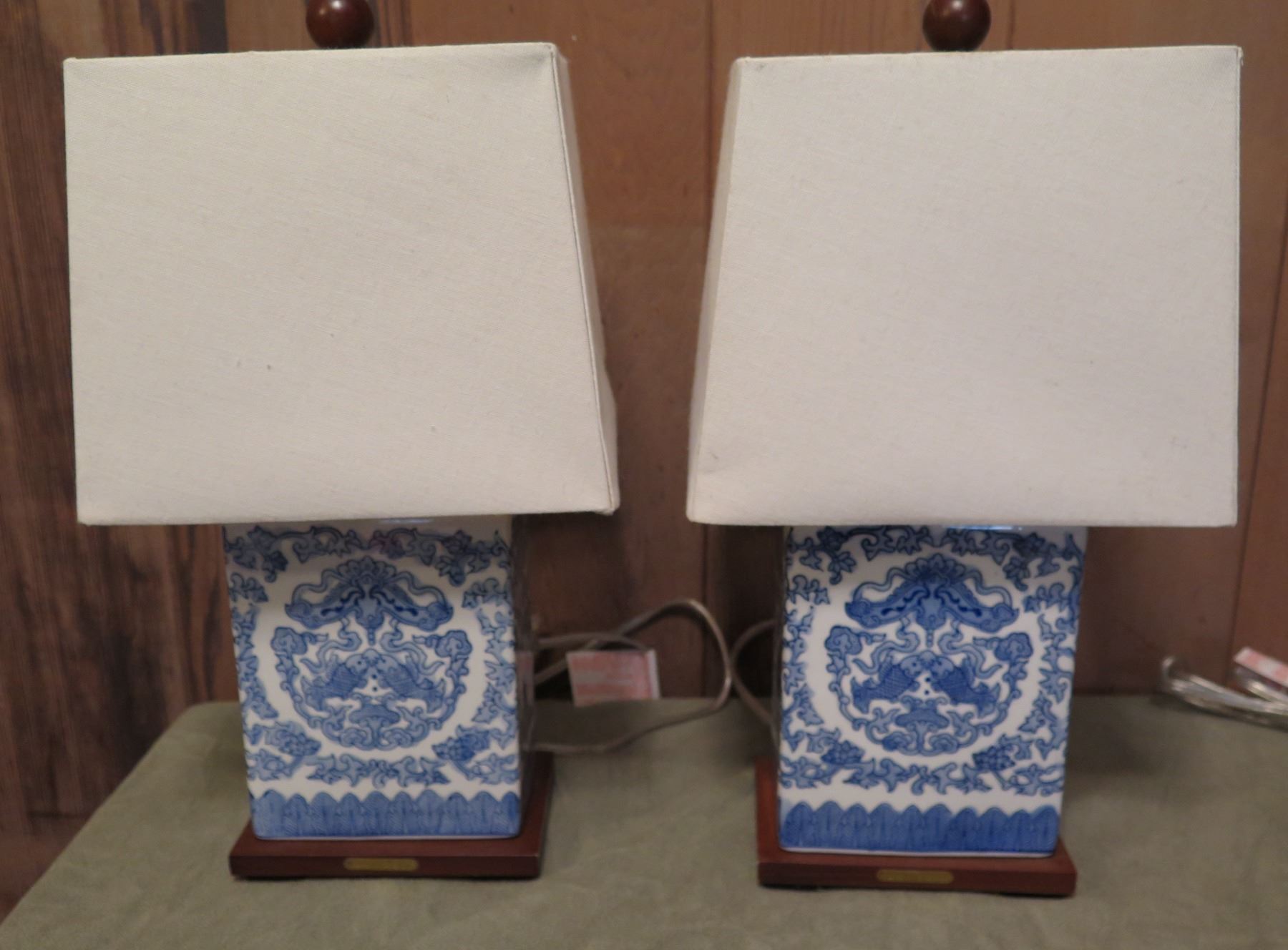 Qty 2 Chinese Porcelain Lamps w/ Lampshades, Rectangular Blue/White Ralph Lauren