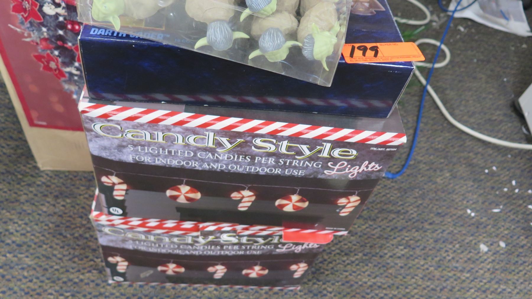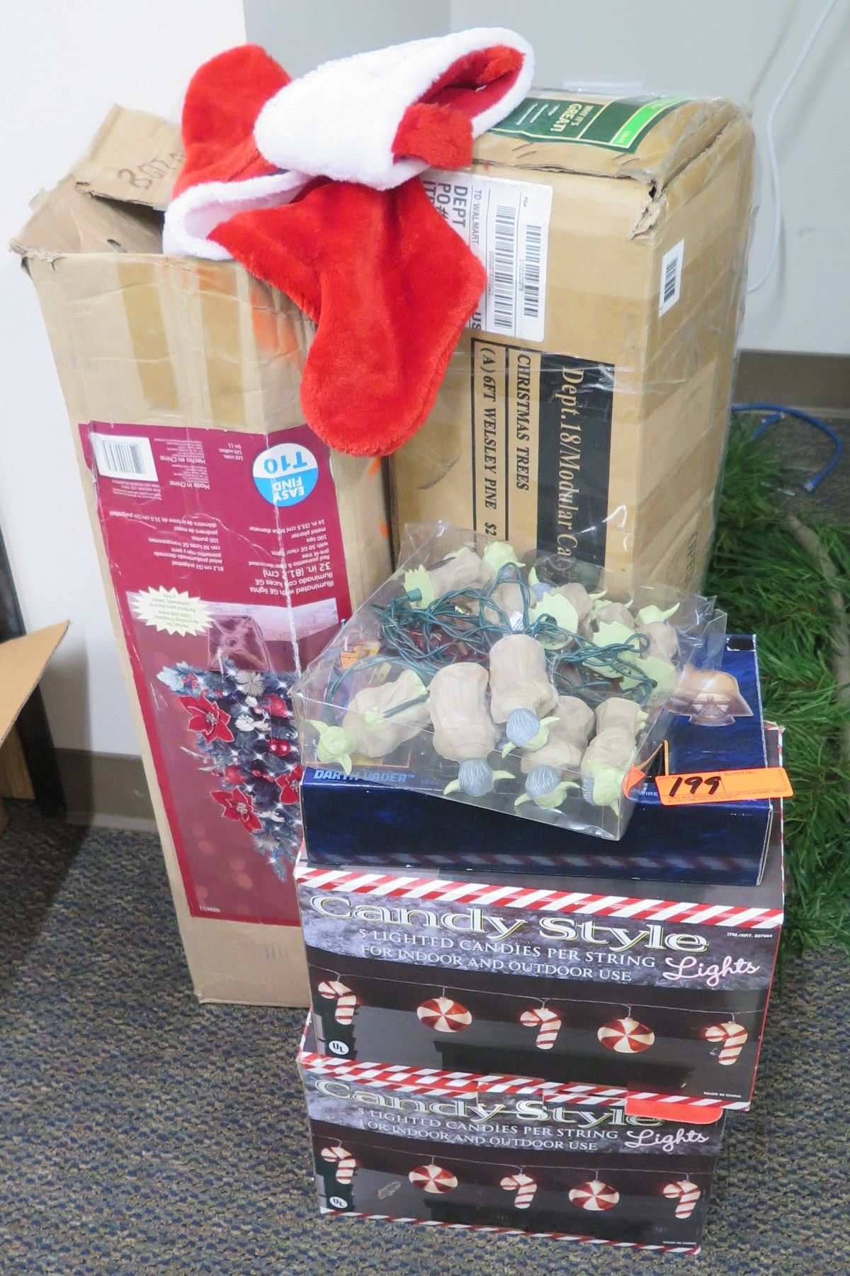 Qty 2 Christmas Trees, Candy Cane Lights, Misc Ornaments & Decorations