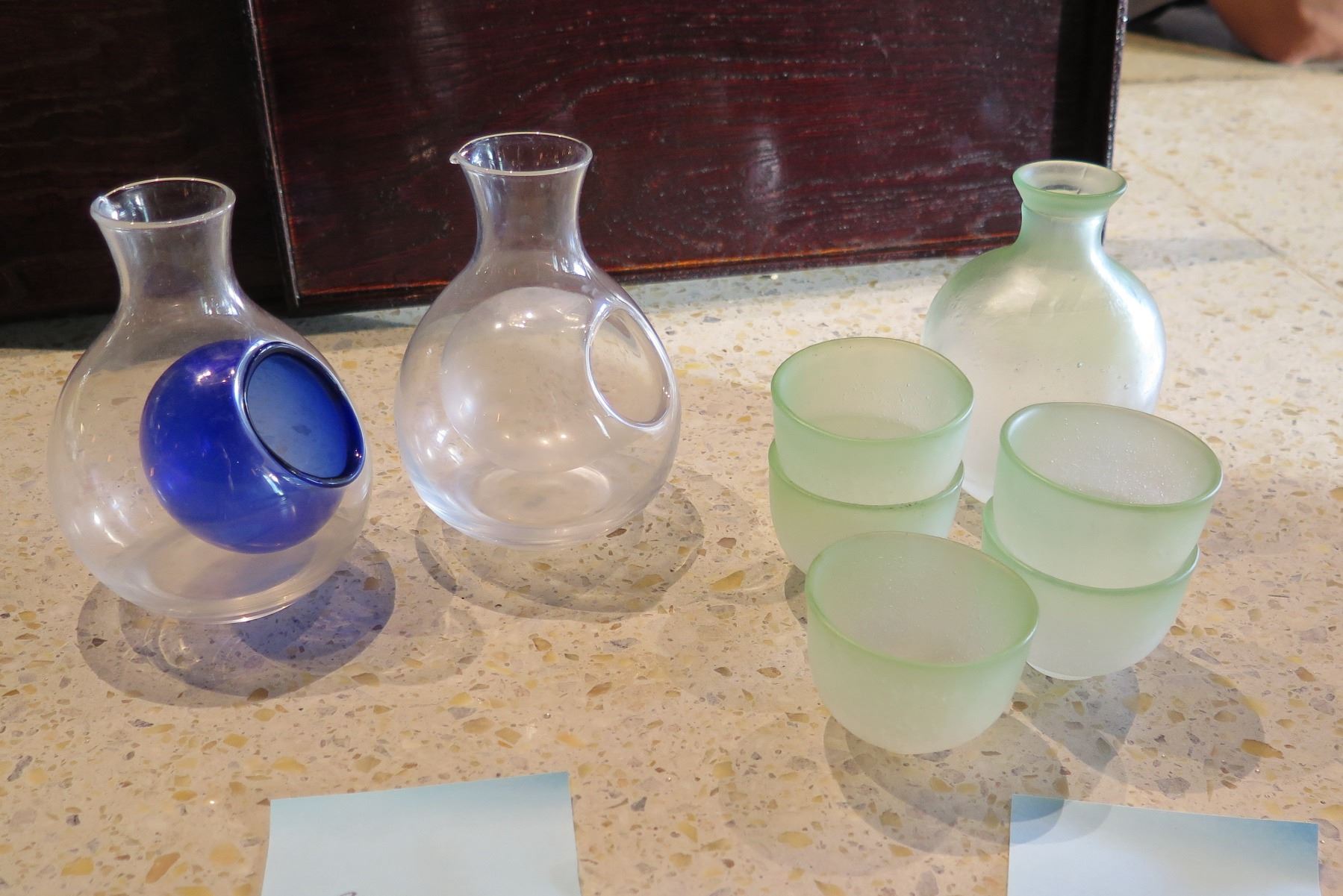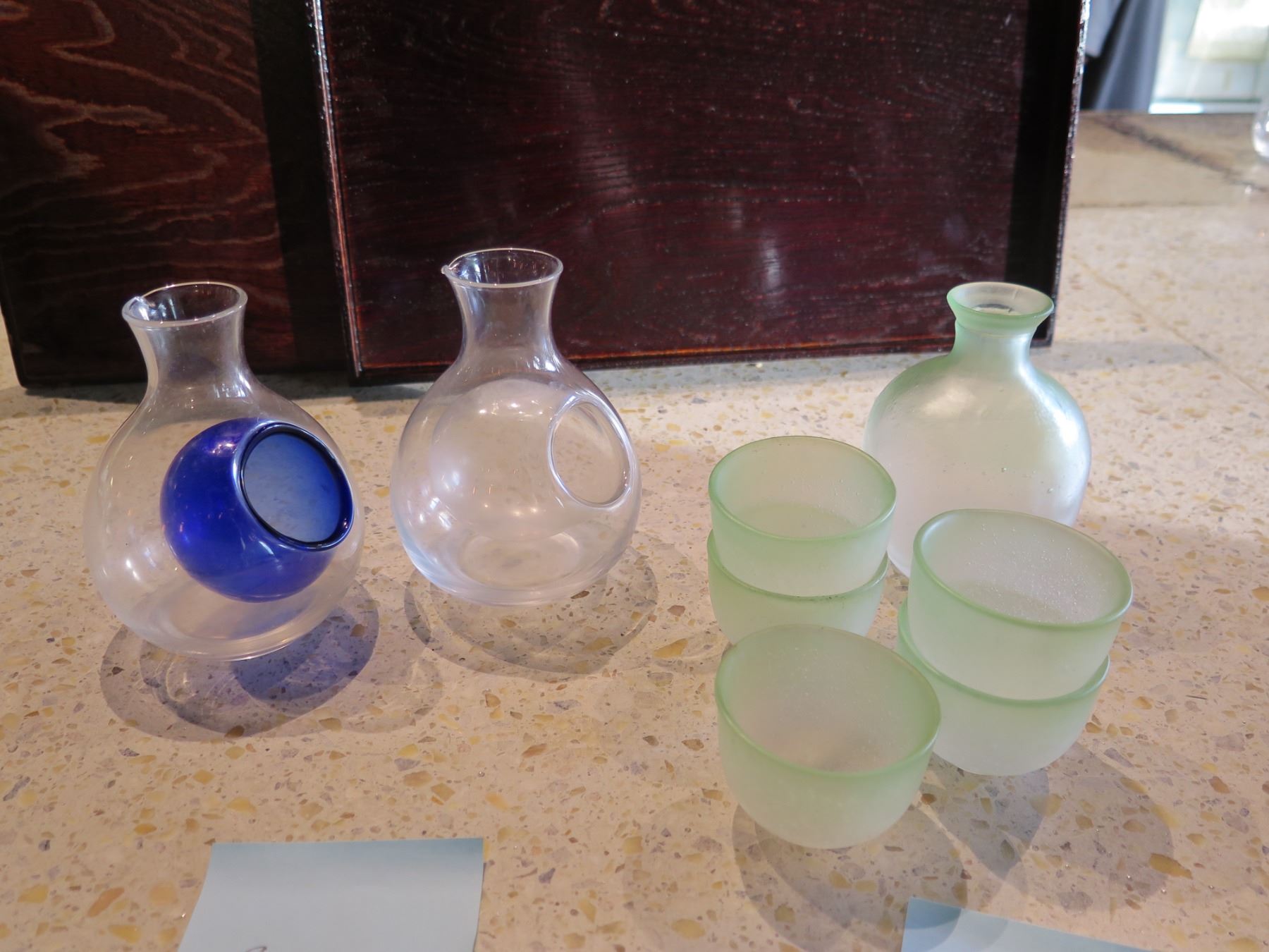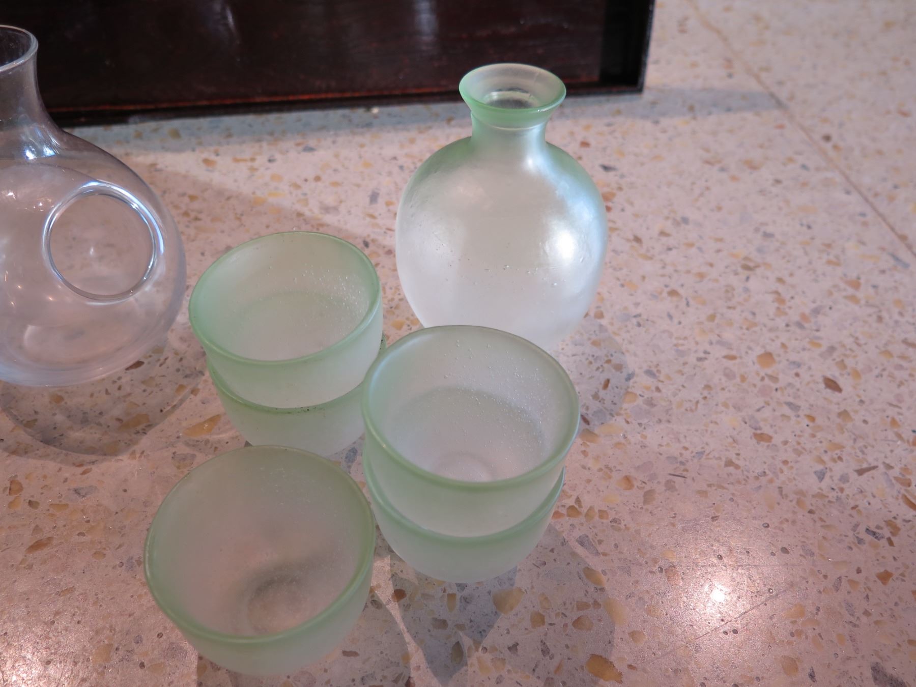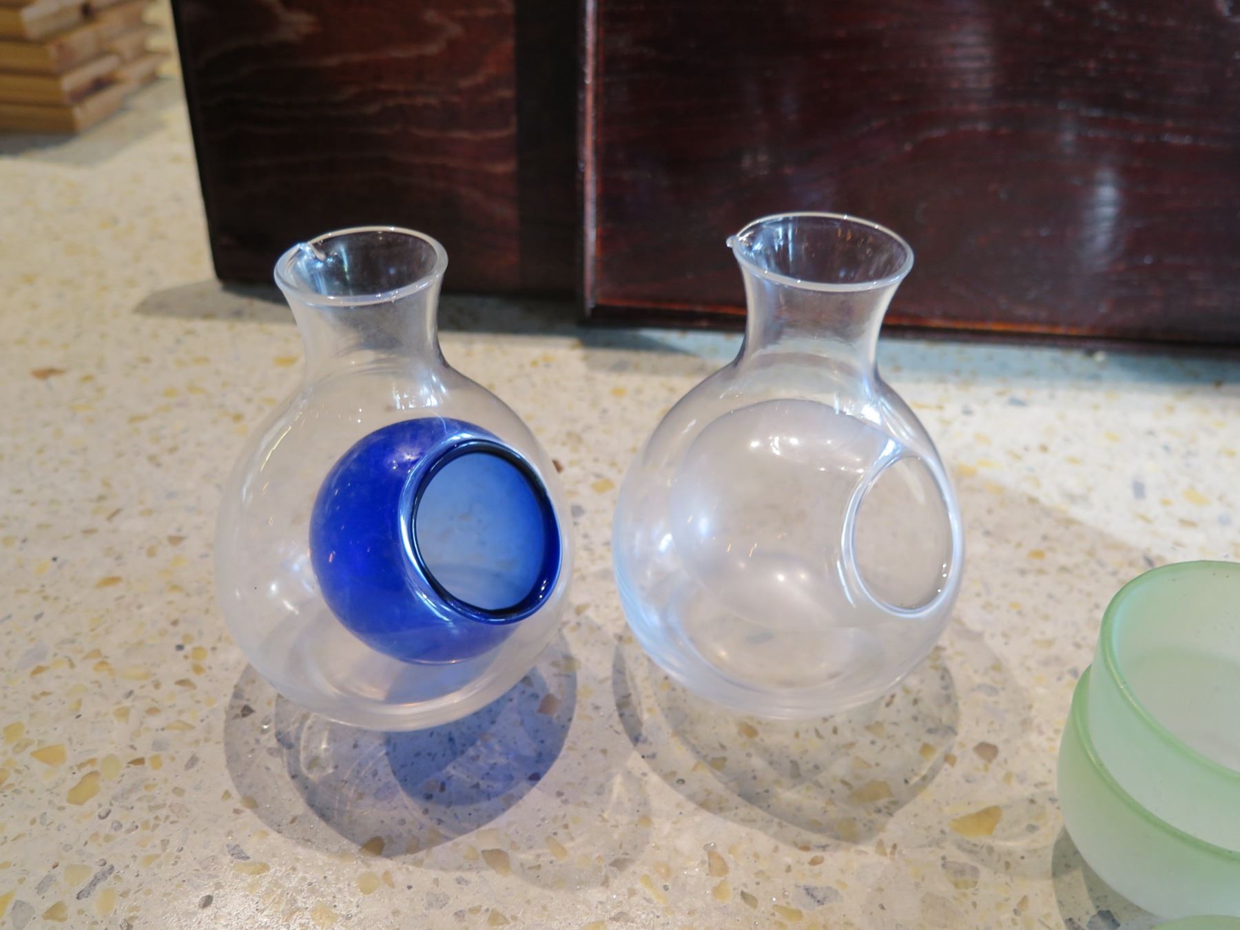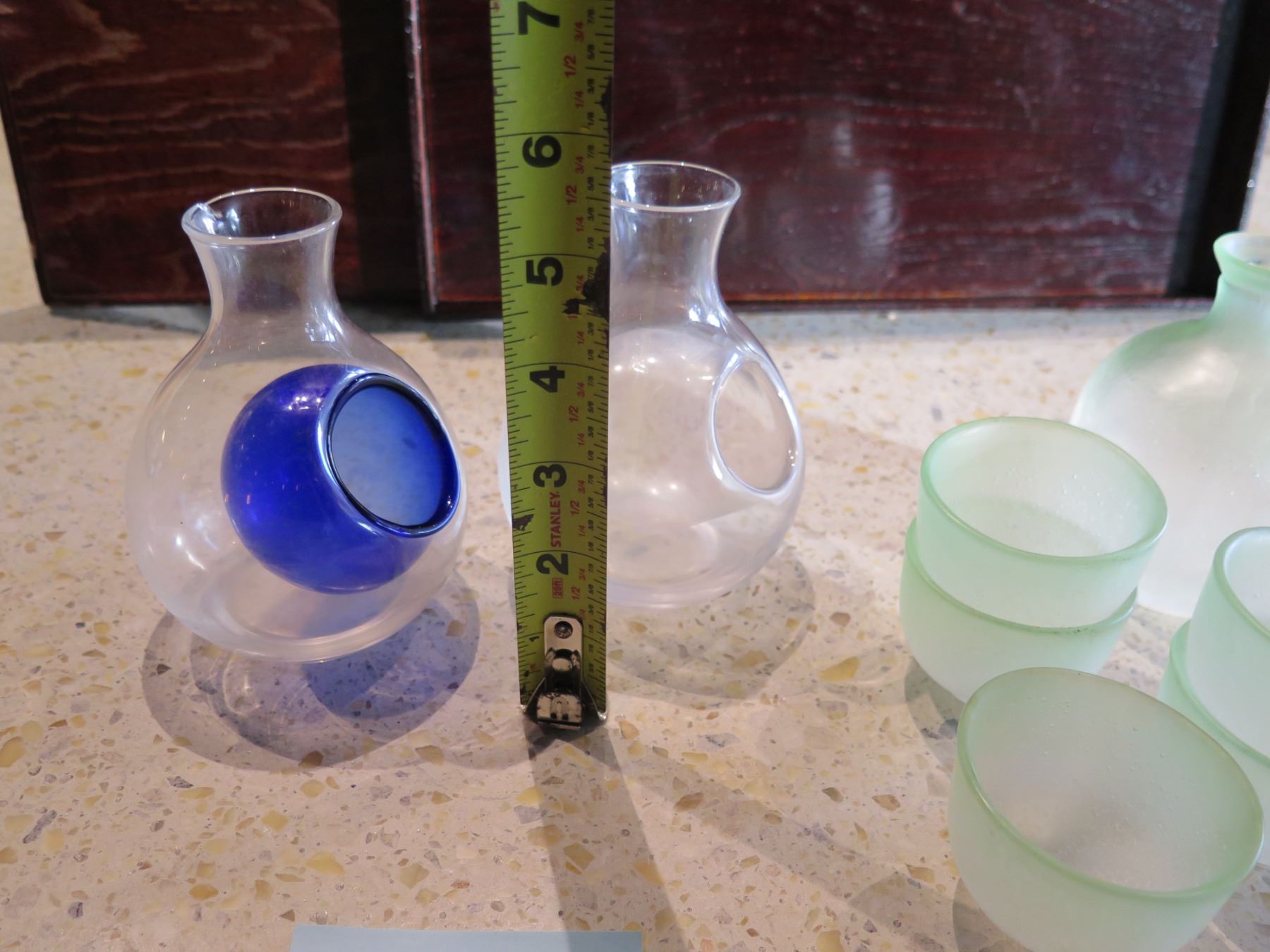 Qty 2 Clear Glass Wine Decanters w/ Chiller Chambers, Sake Bottle & Cups