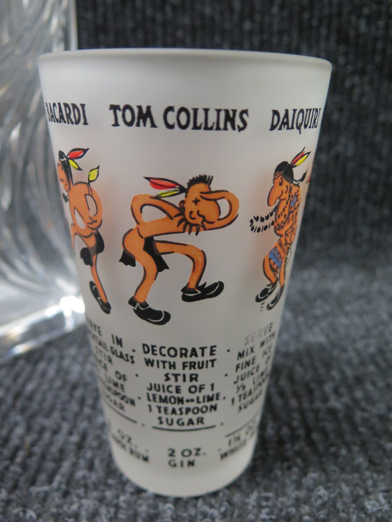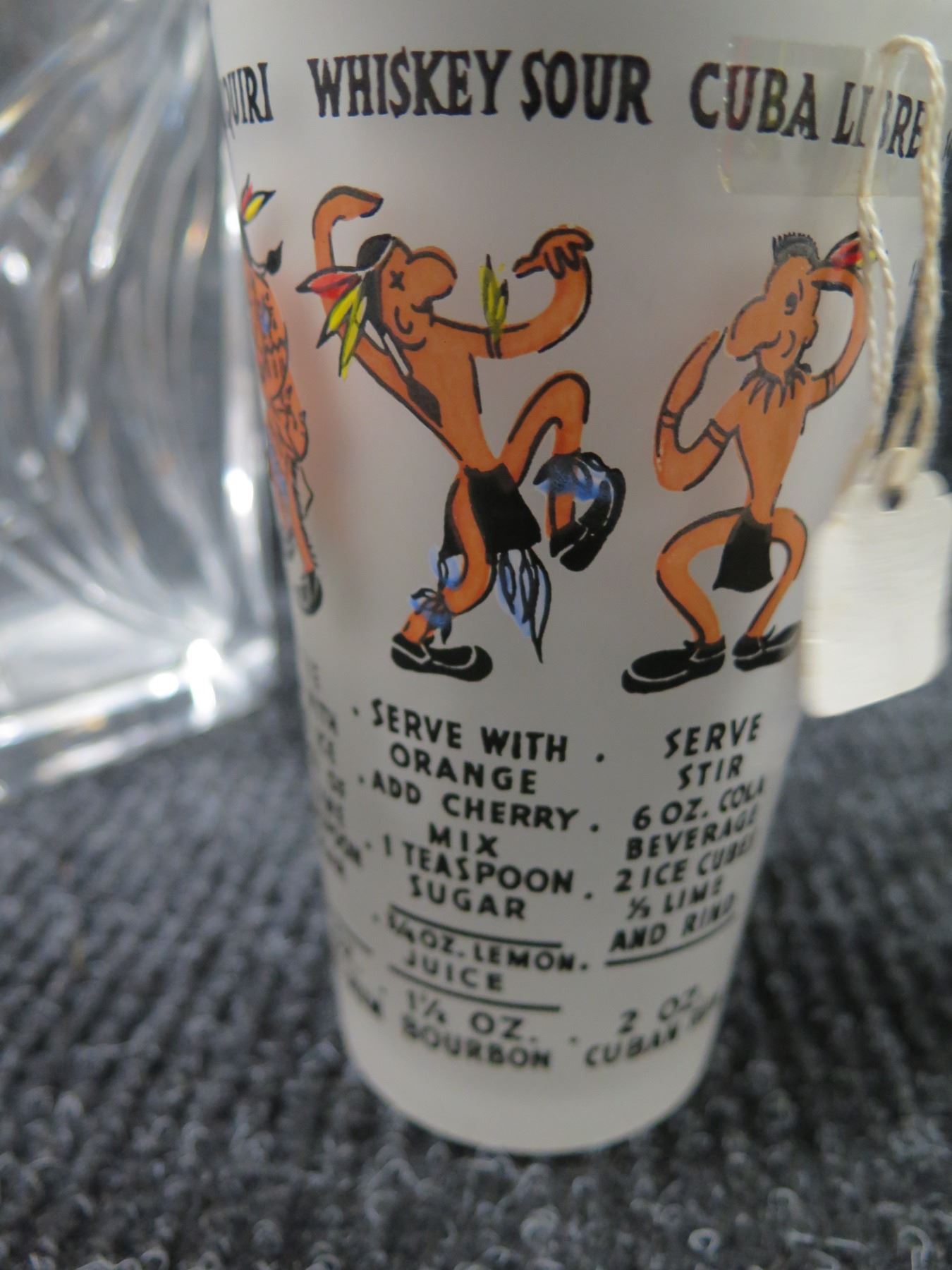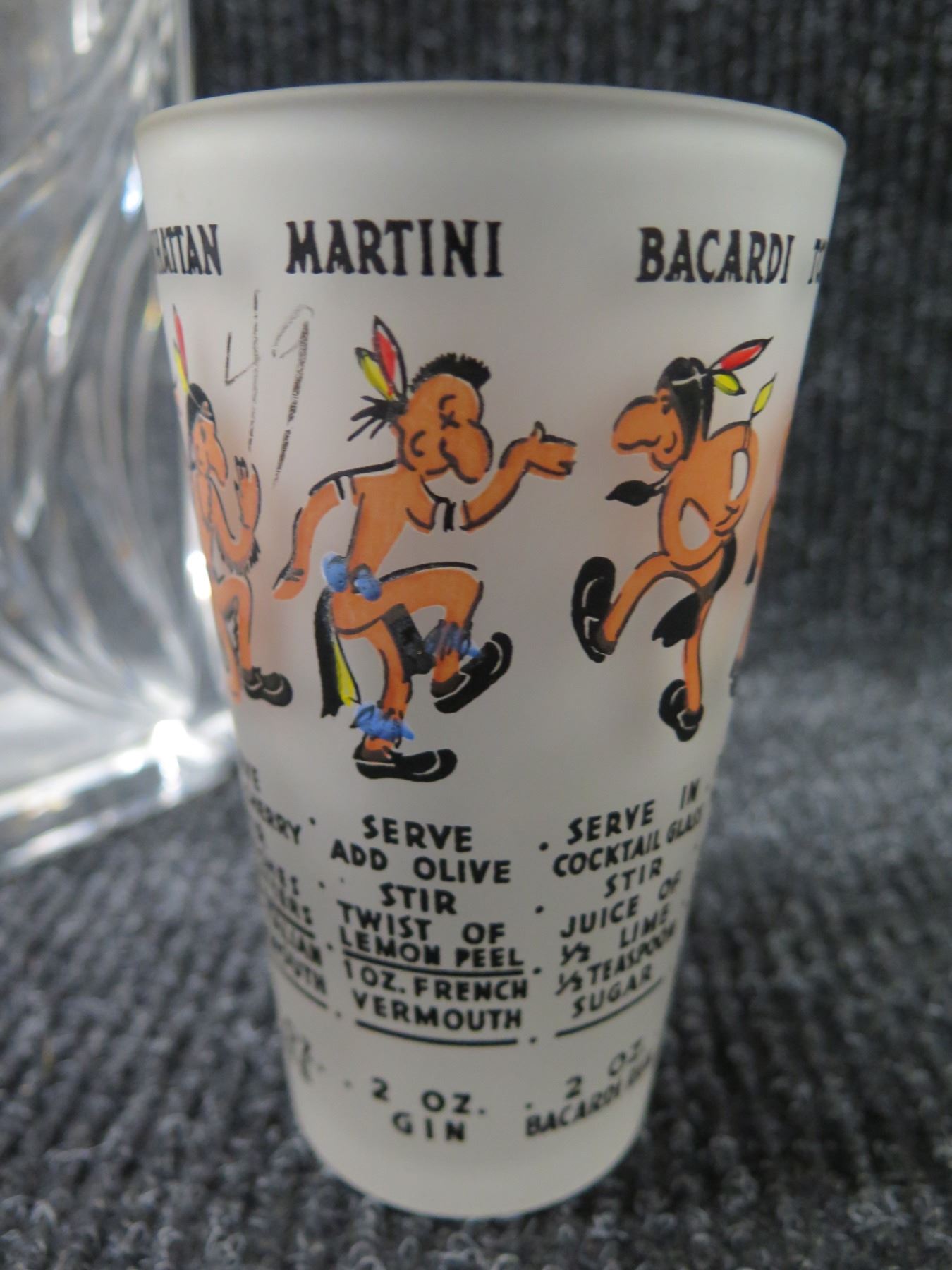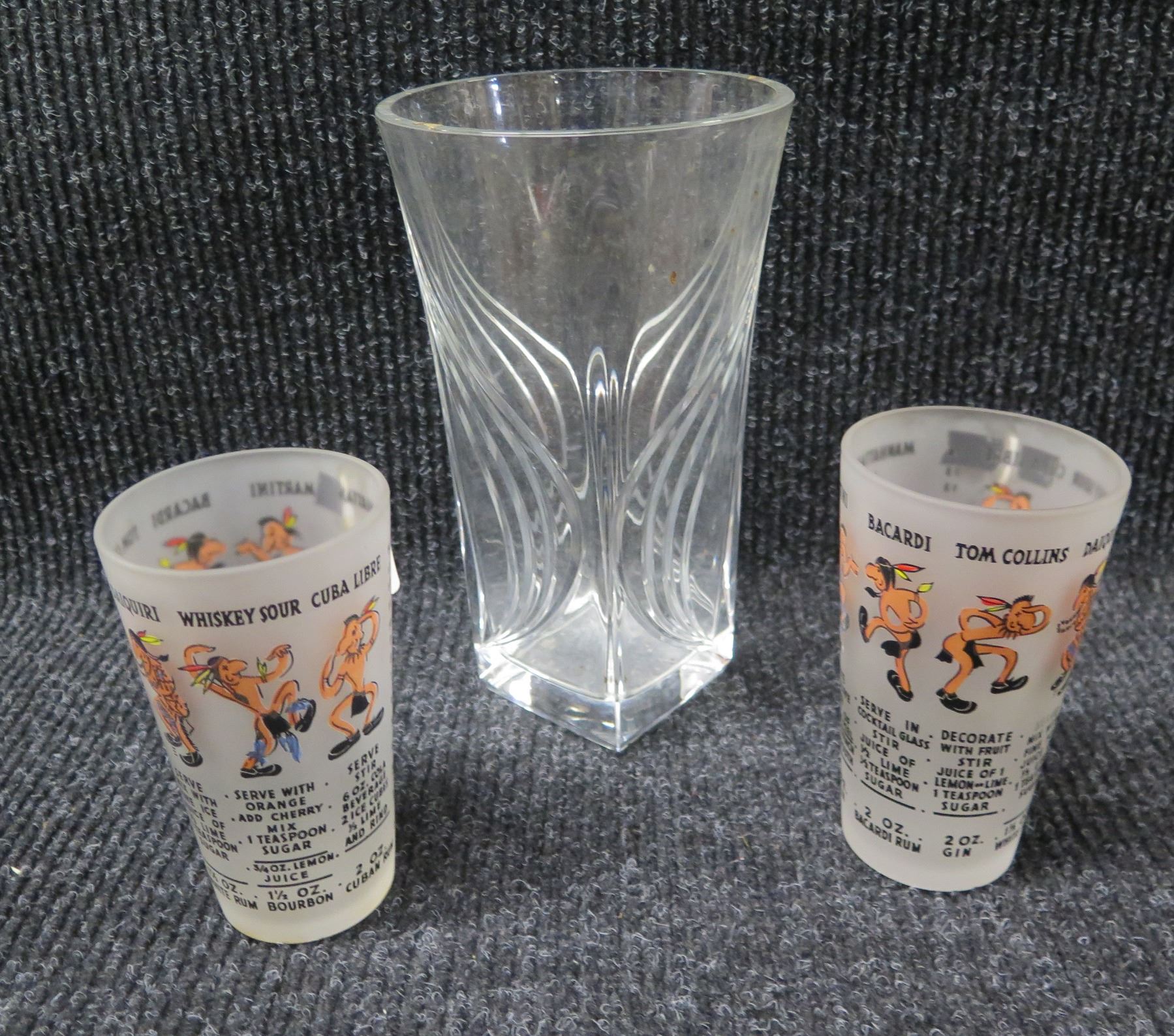 Qty 2 Cocktail Recipe Glasses w/ Indian Cartoons & Cut Glass Vase 10"H
