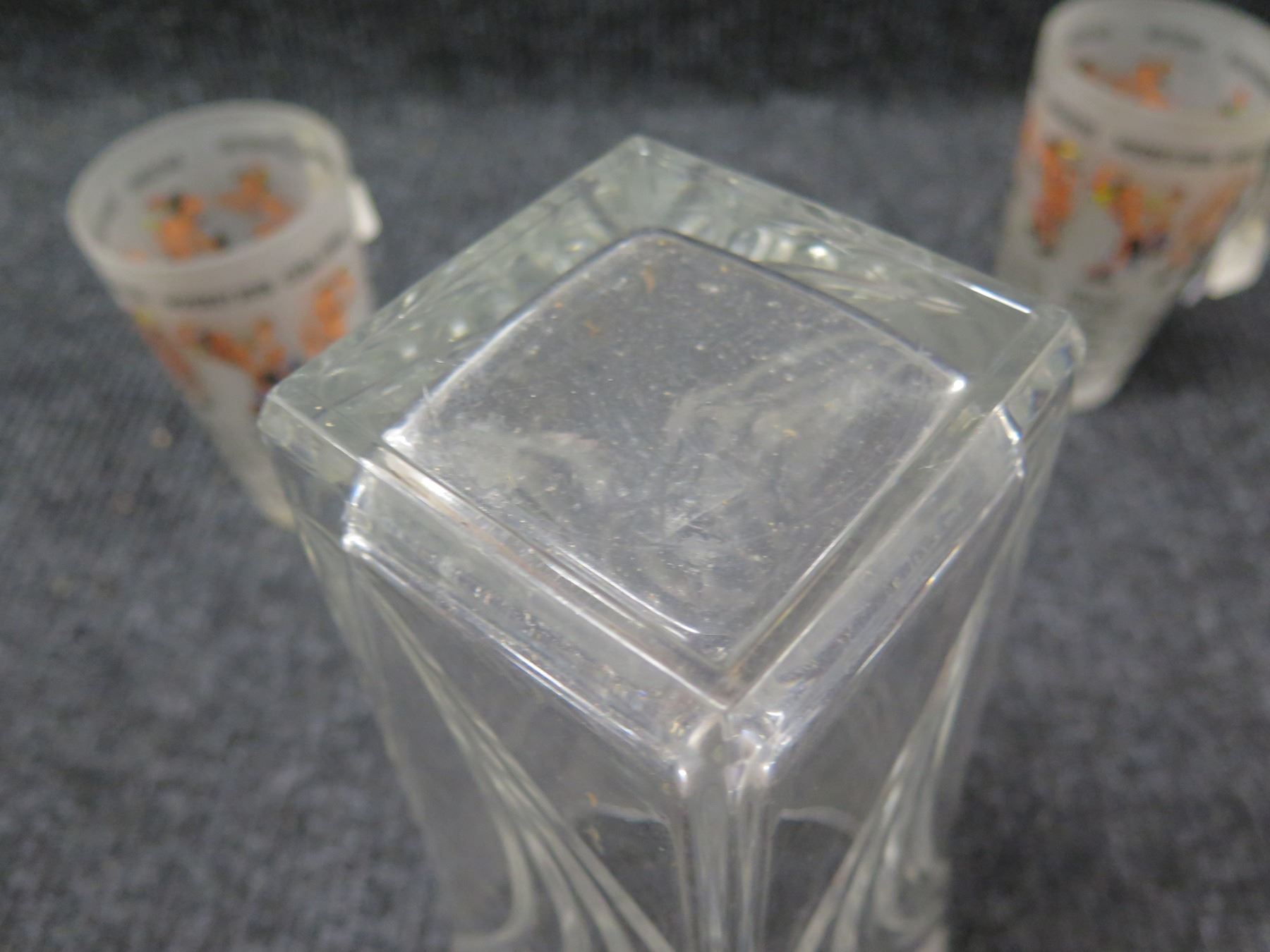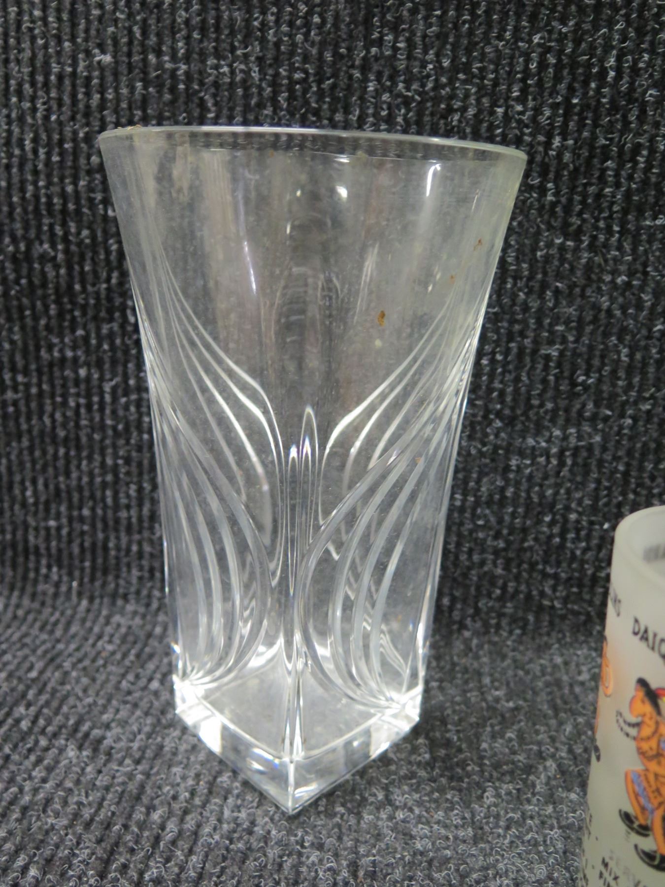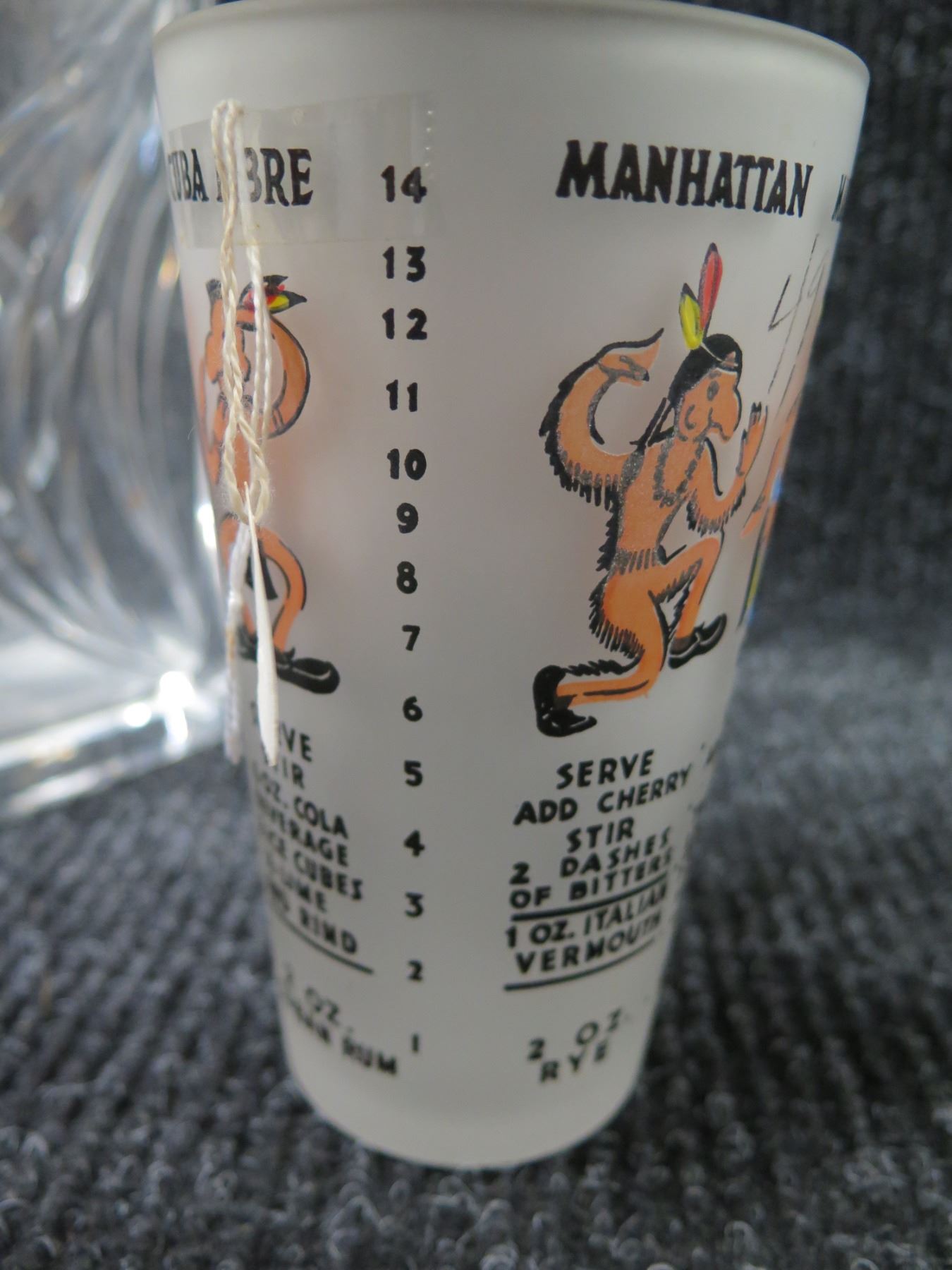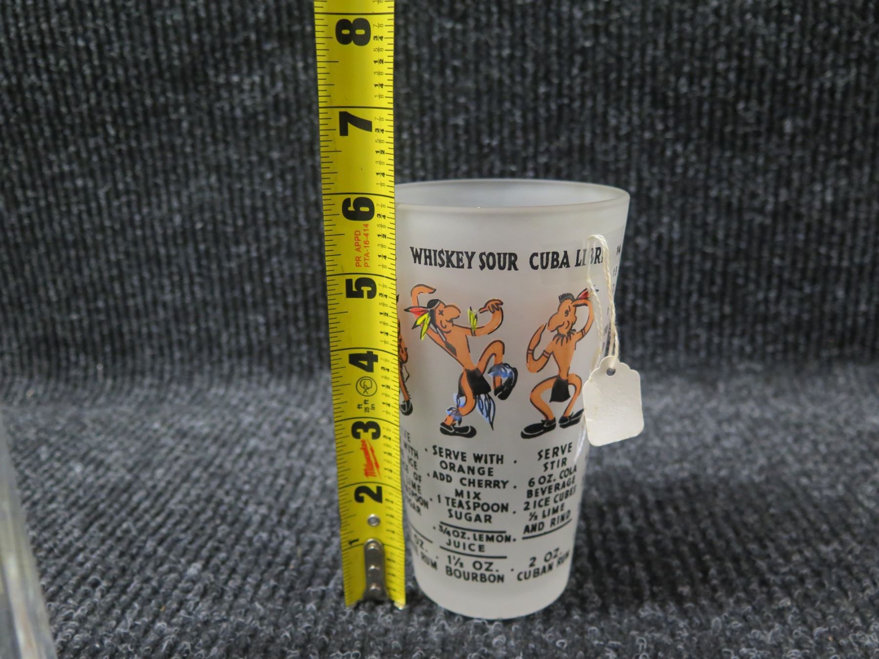 Qty 2 Cocktail Recipe Glasses w/ Indian Cartoons & Cut Glass Vase 10"H