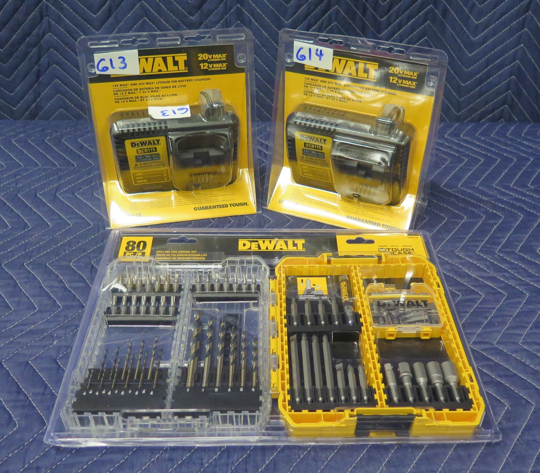 Qty 2 DeWalt DCB115 Chargers & DWAMF1280 Tough Case 80pc. Drilling & Driving Set