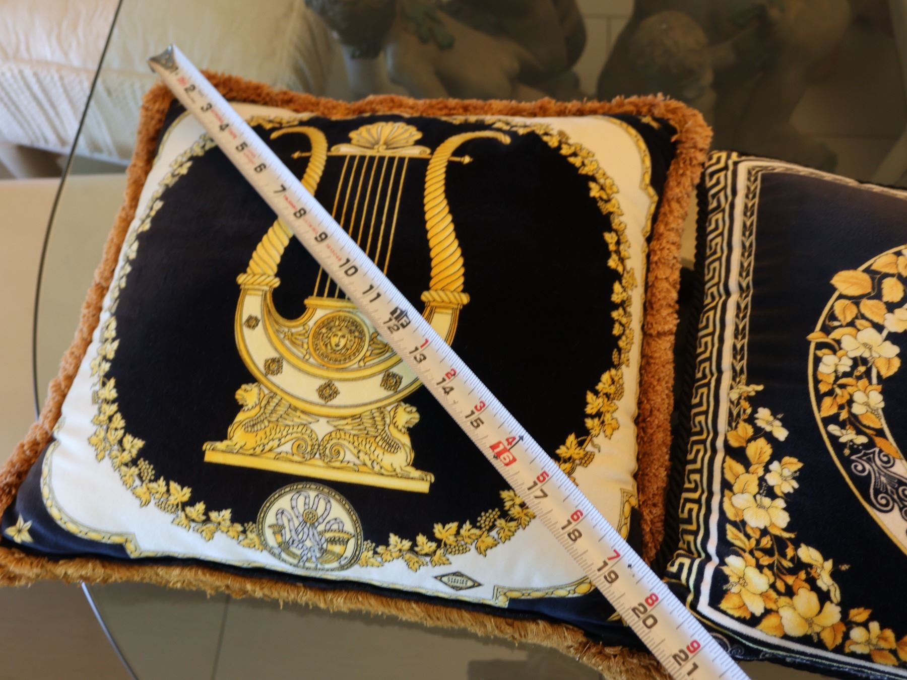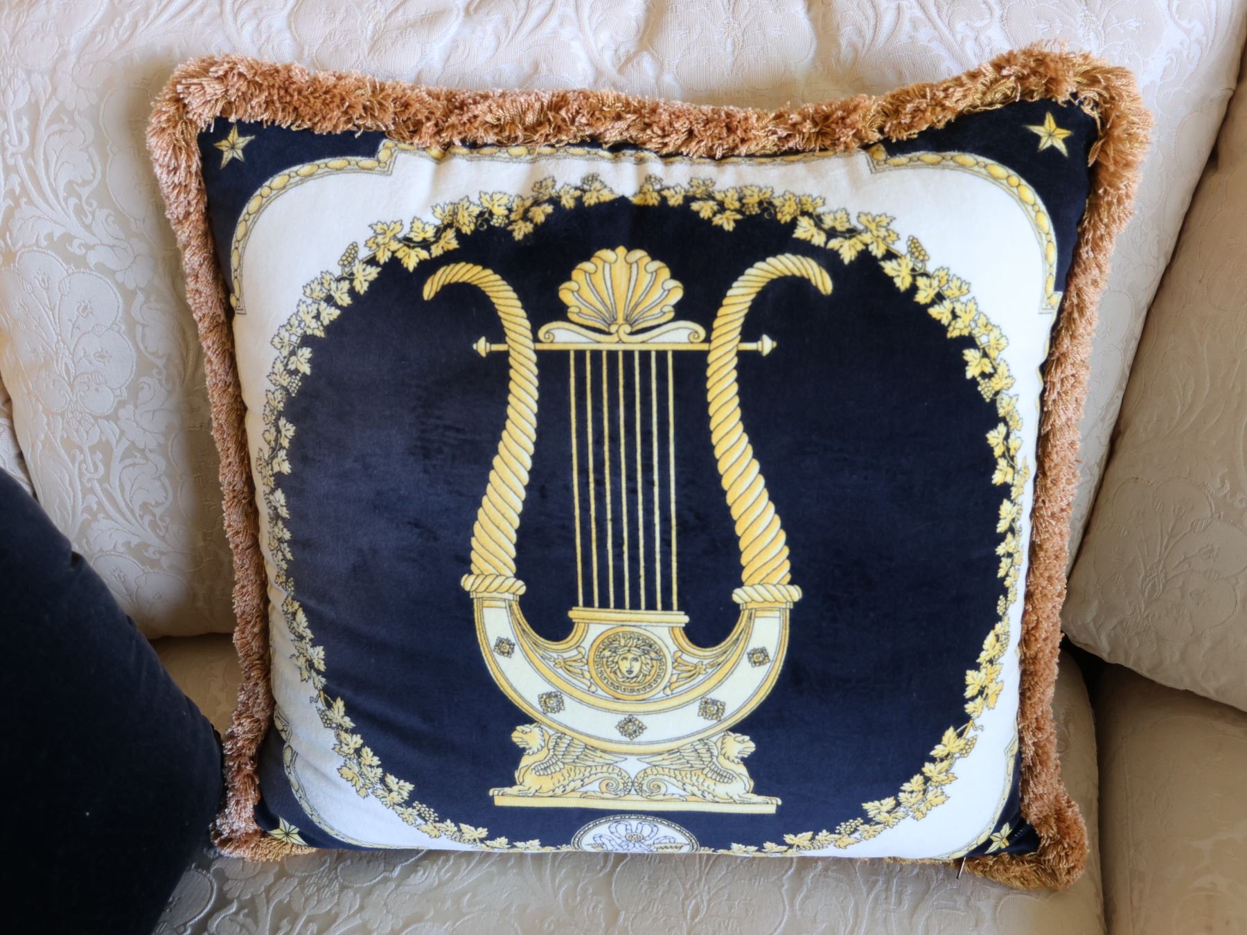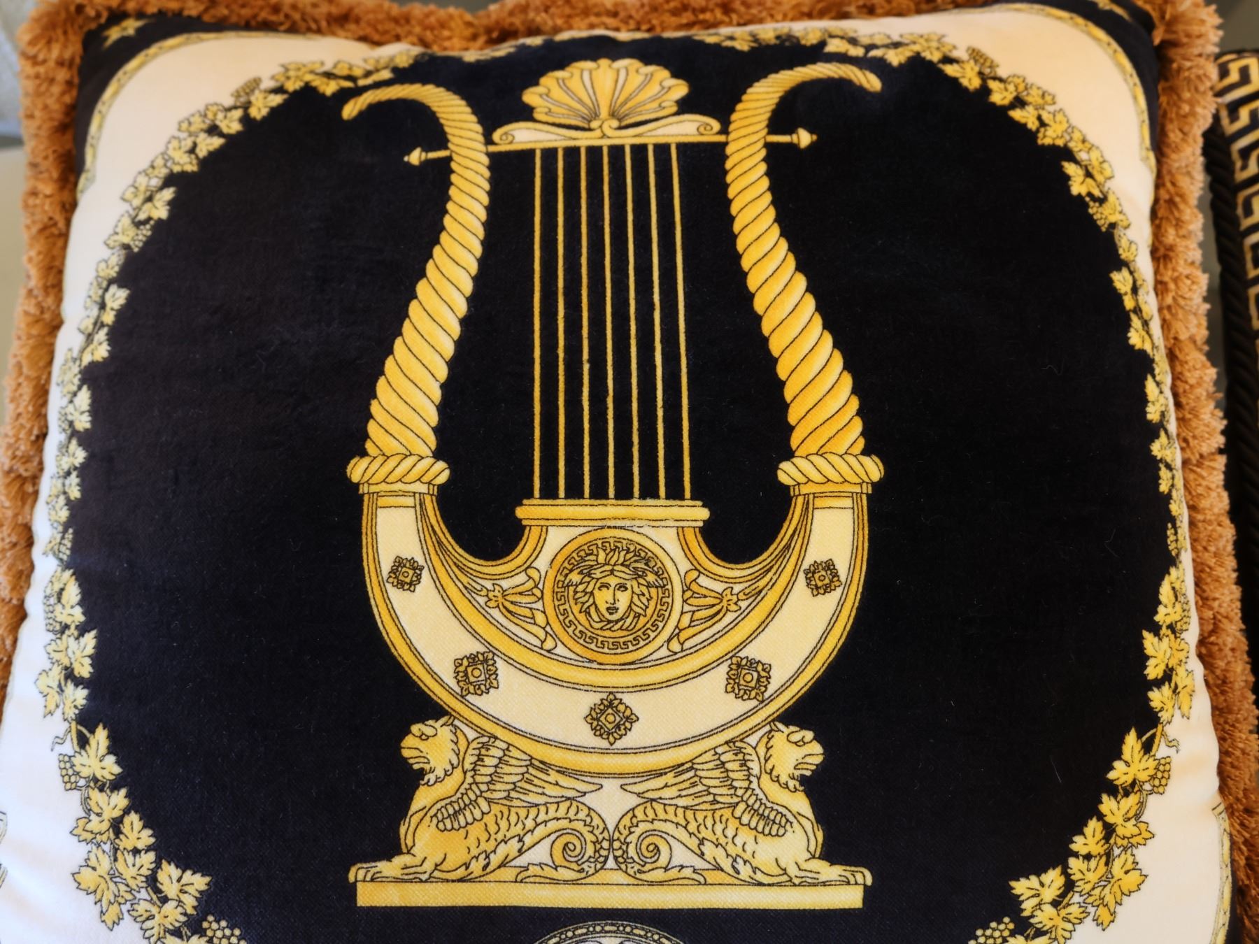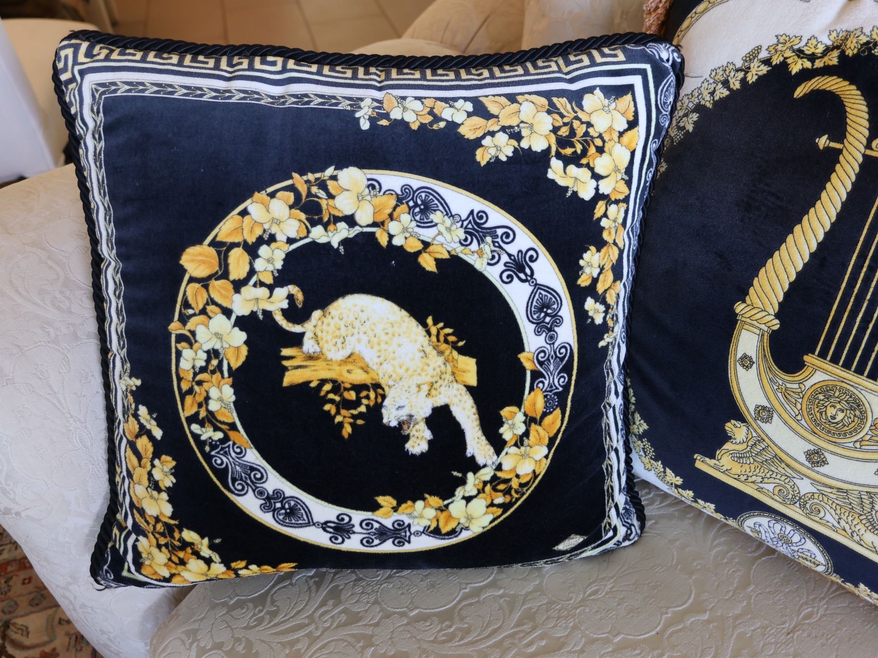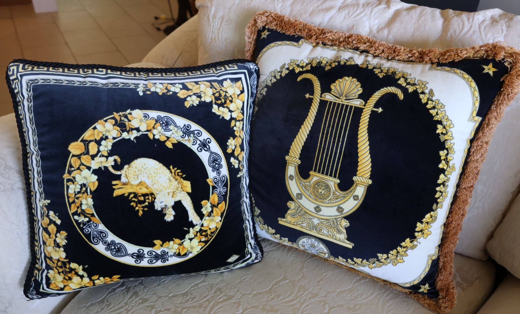 Qty 2 Decorative Throw Pillows: Leopard & Gilded Lyre 20" & 17" Diagonal