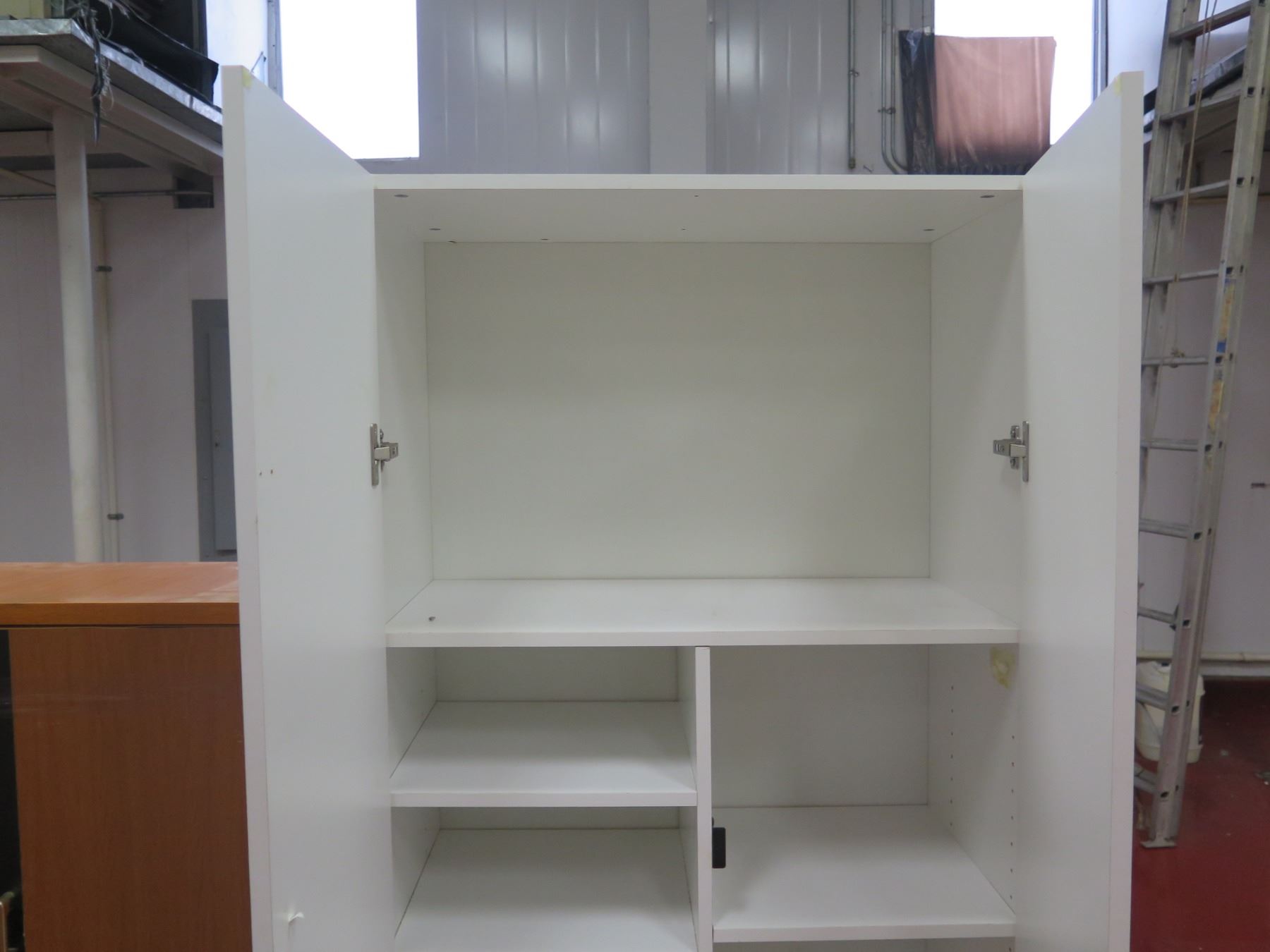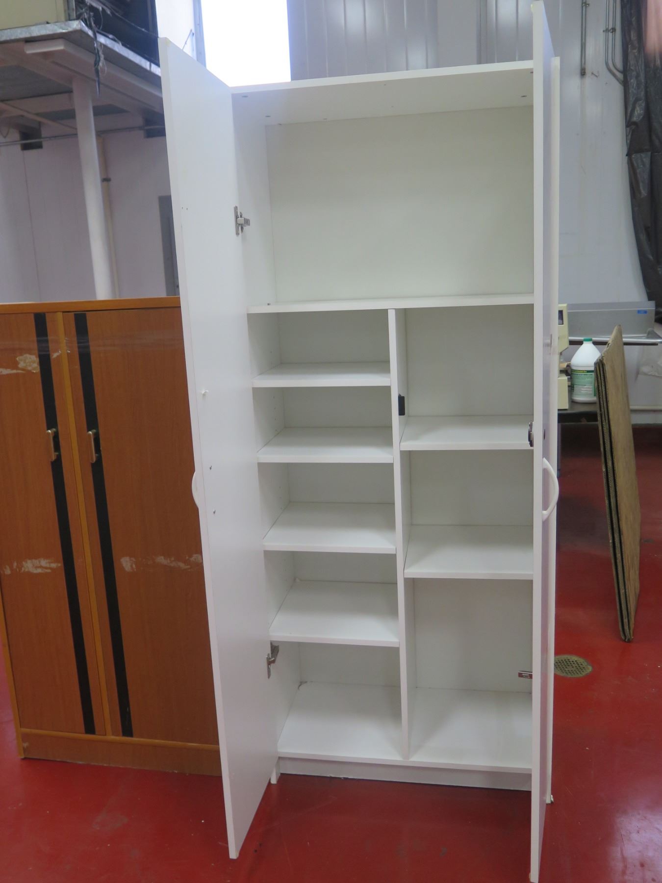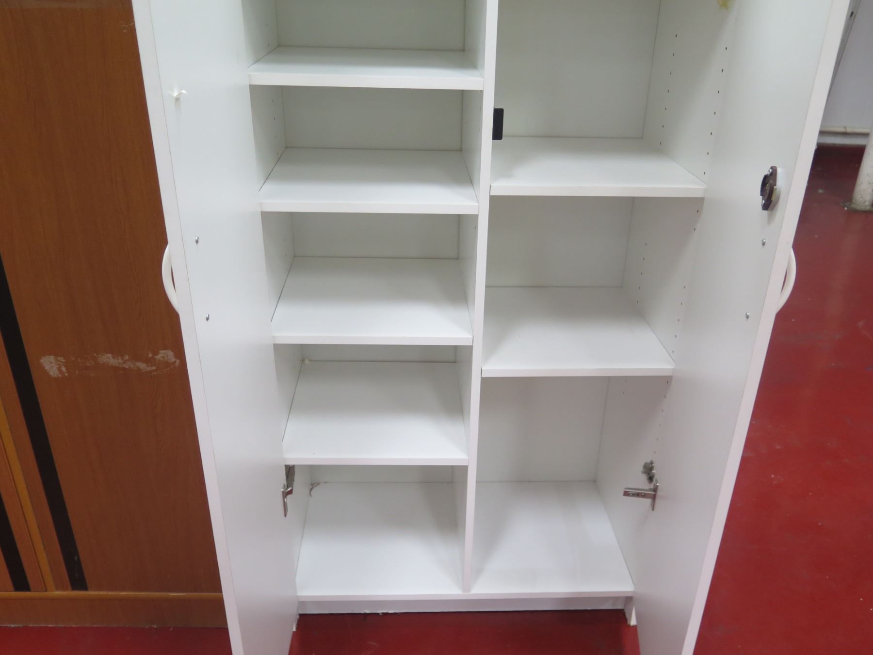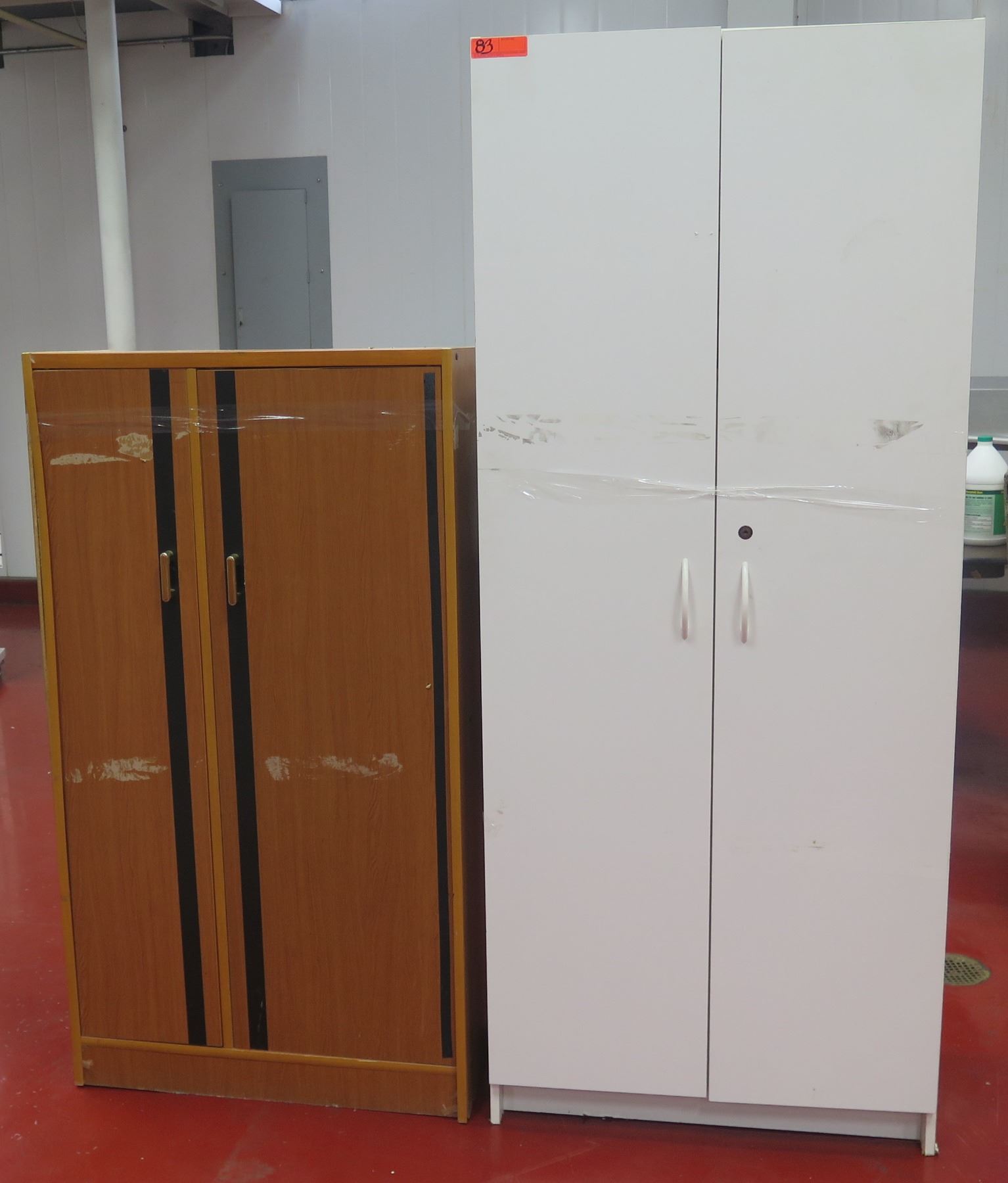 Qty 2 Double Door Cabinets: White 9 Section 30"x16"x72" & Wood 9 Tier 30"x14"x53"H