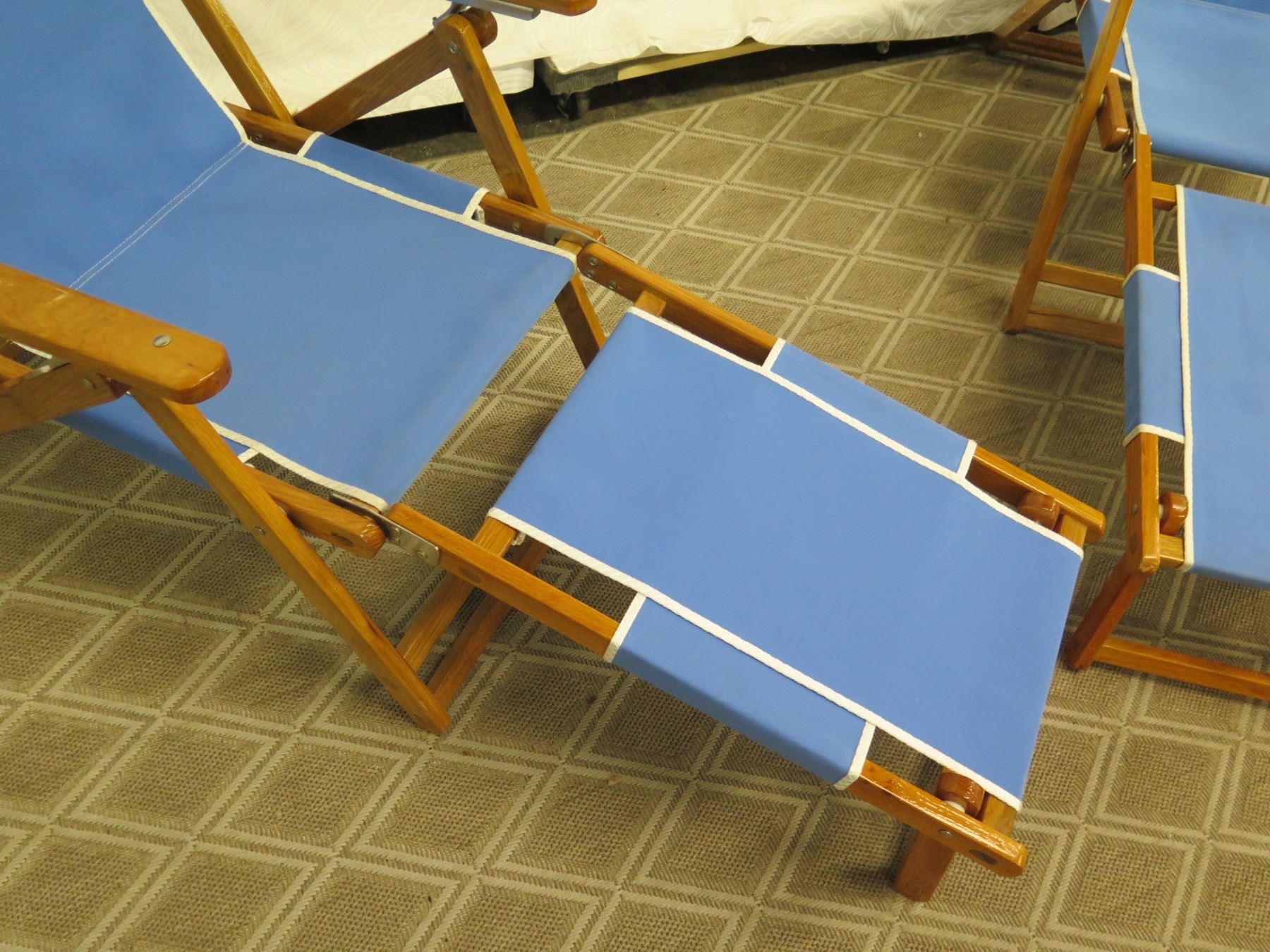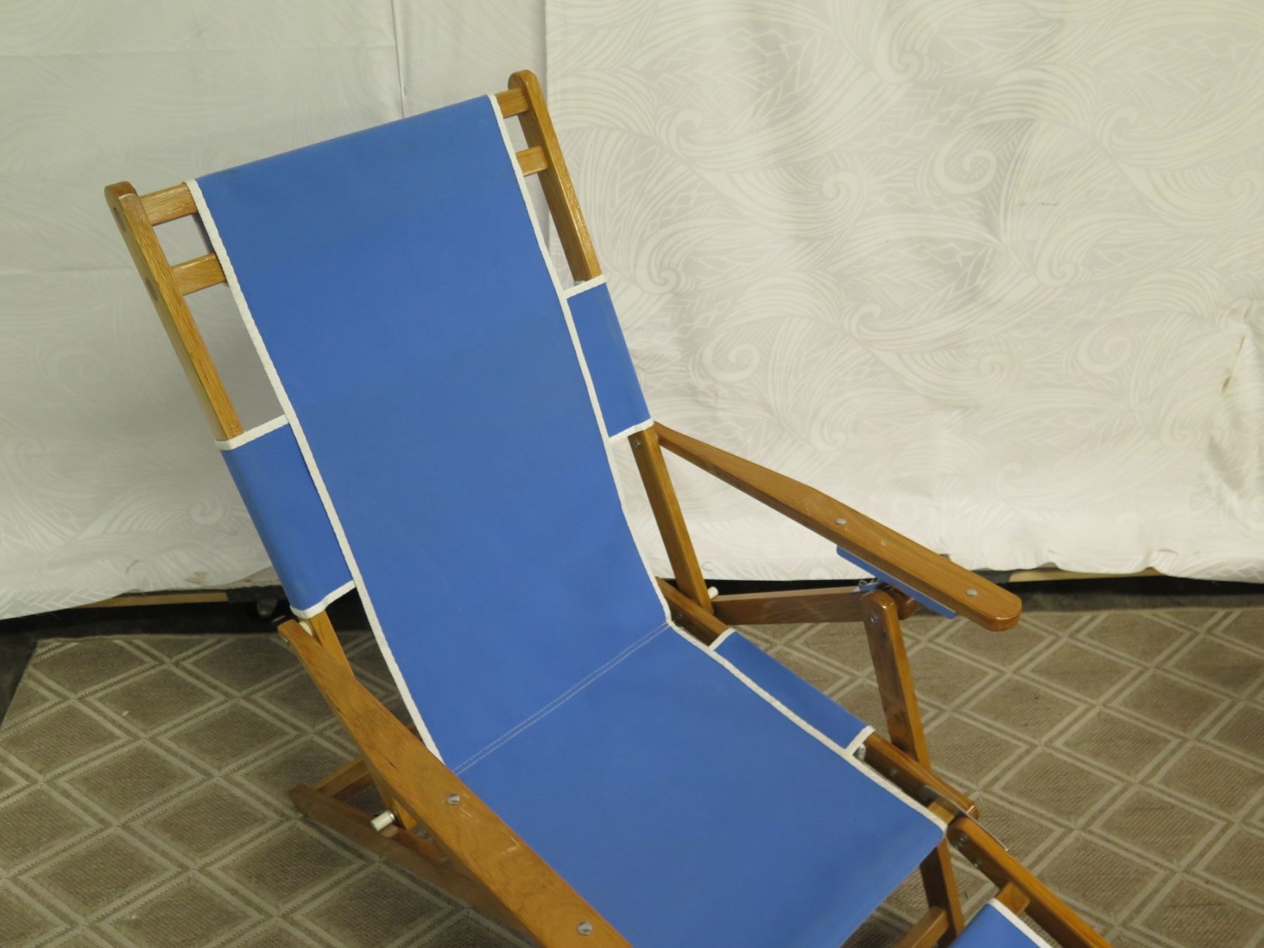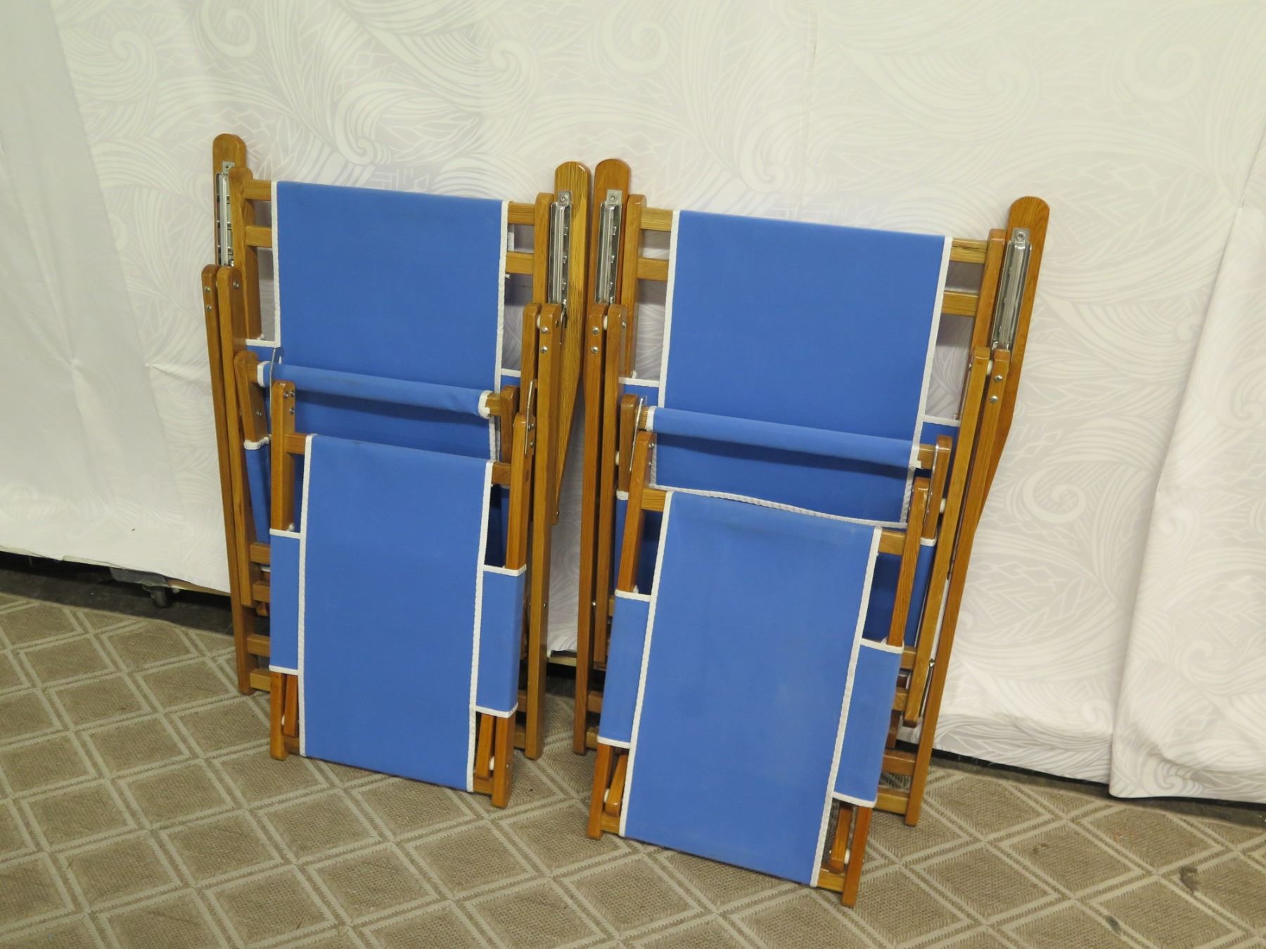 Qty 2 Wood Chaise Lounge Chairs w/ Blue Canvas (Retail $228) https://www.frankfordumbrellas.com/collections/lounger