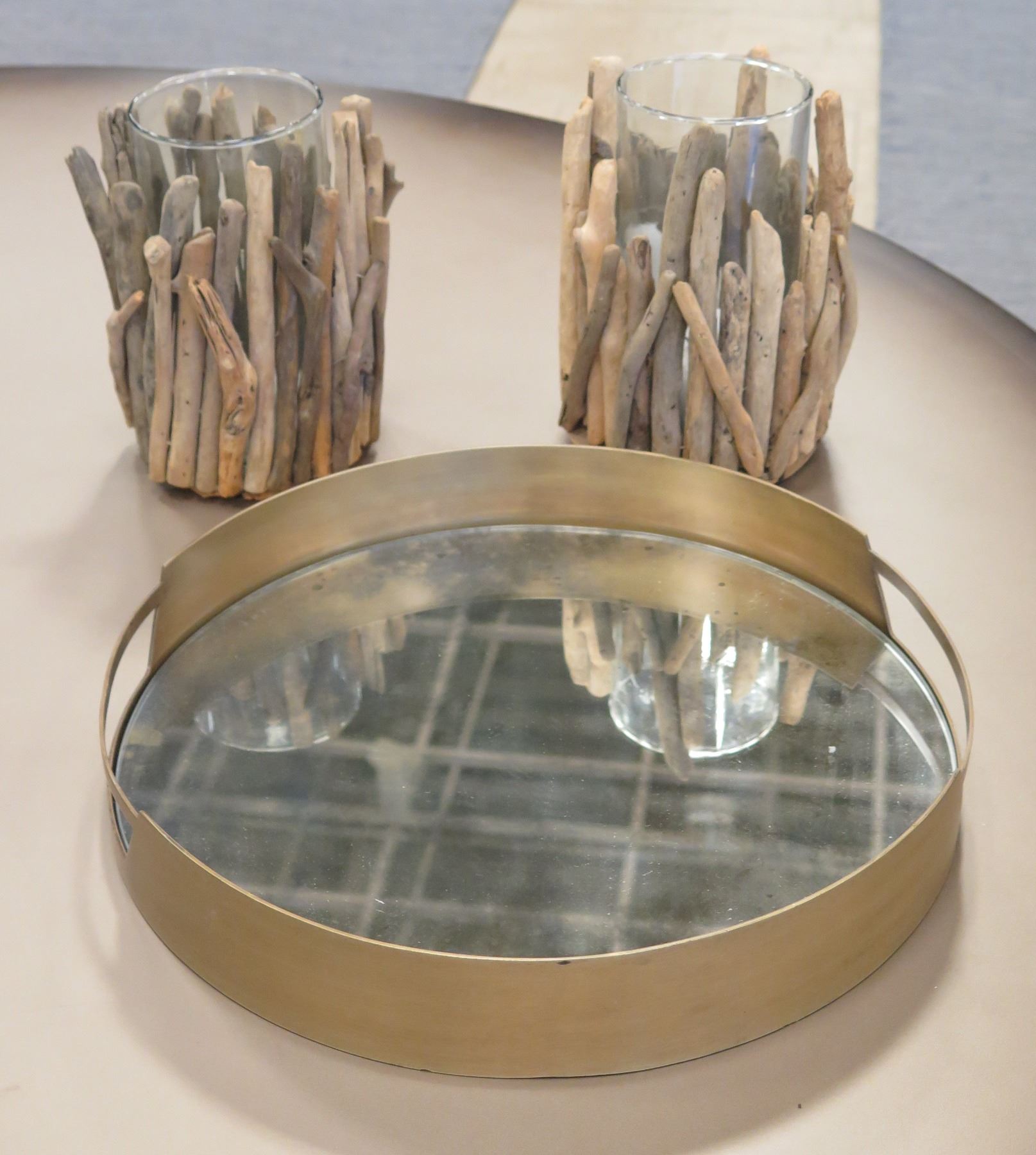 Qty 2 Glass Candle Holders w/ Driftwood Accent 9"H & Round Mirrored Tray 15" Dia