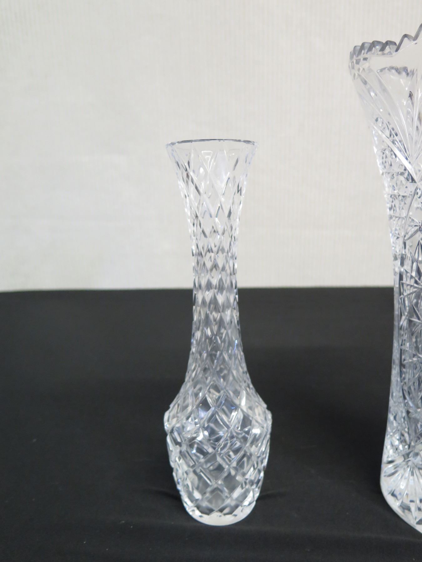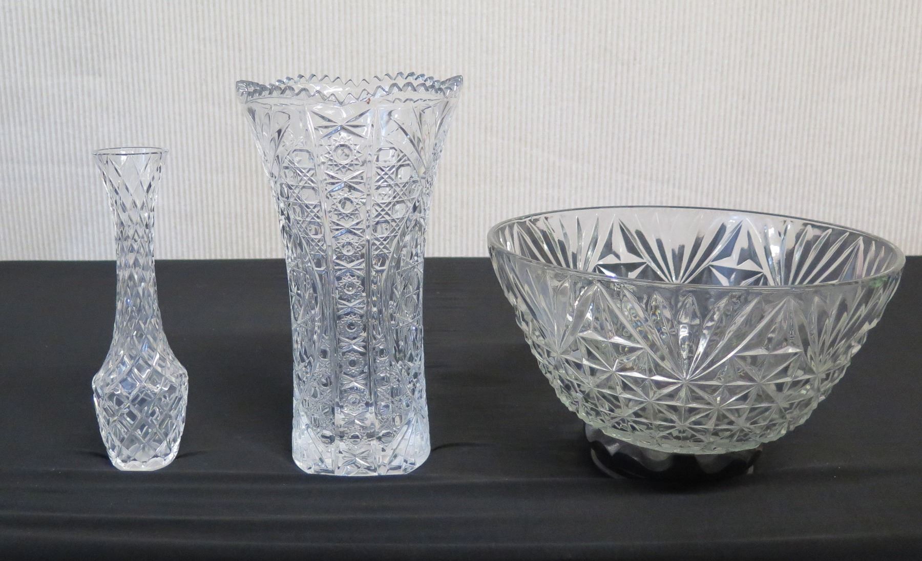 Qty 2 Glass Vases and Glass Bowl on Stand, Misc Sizes