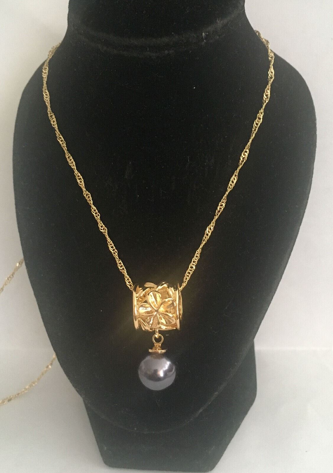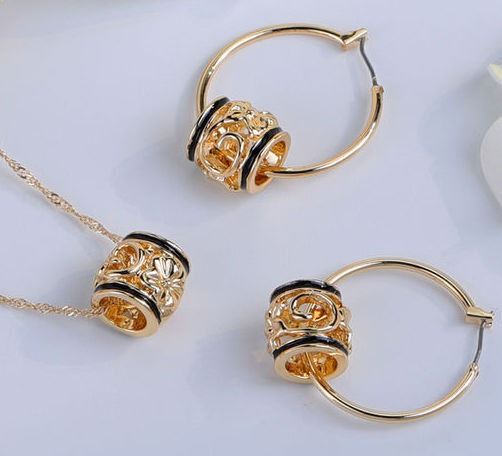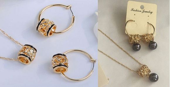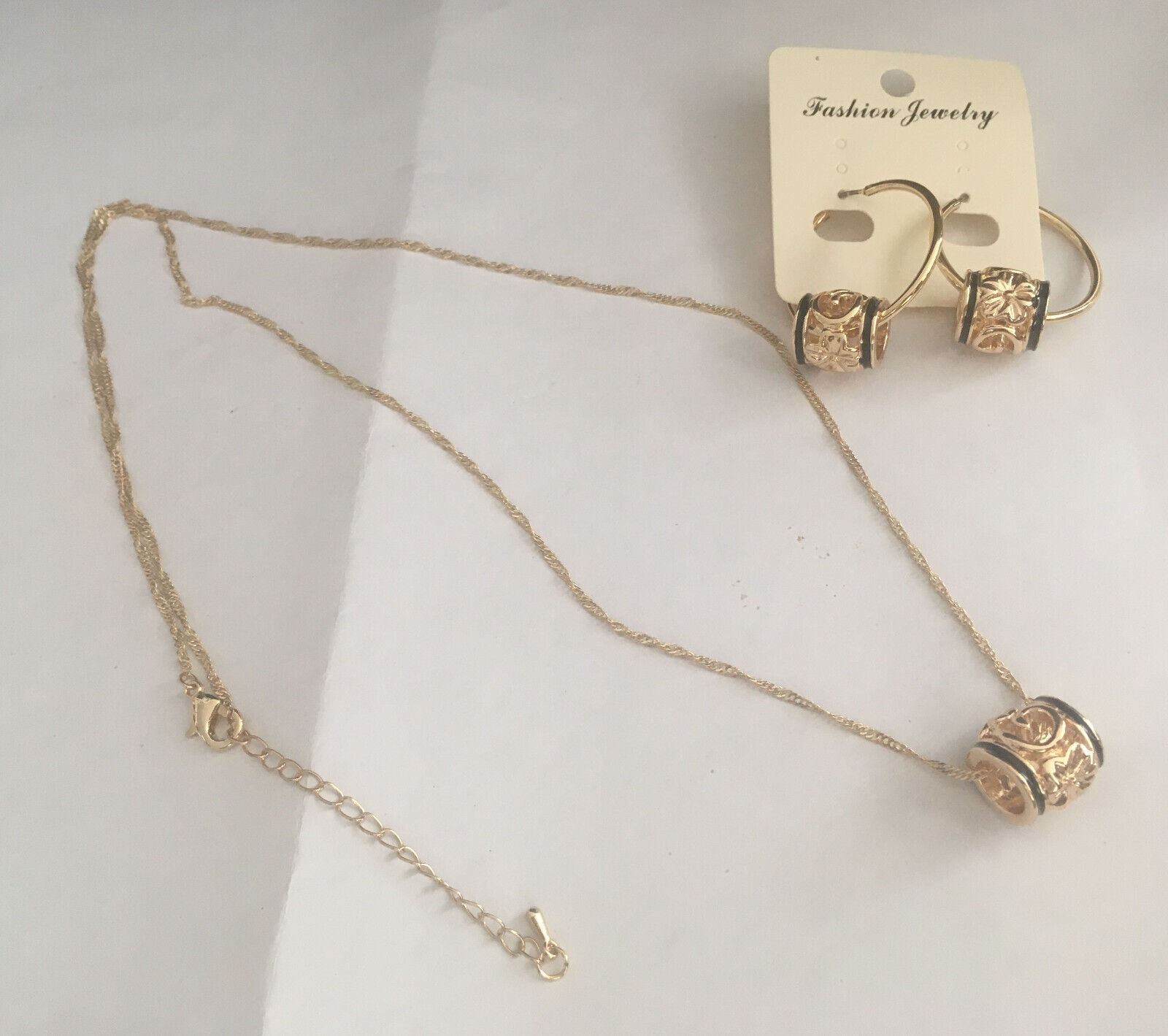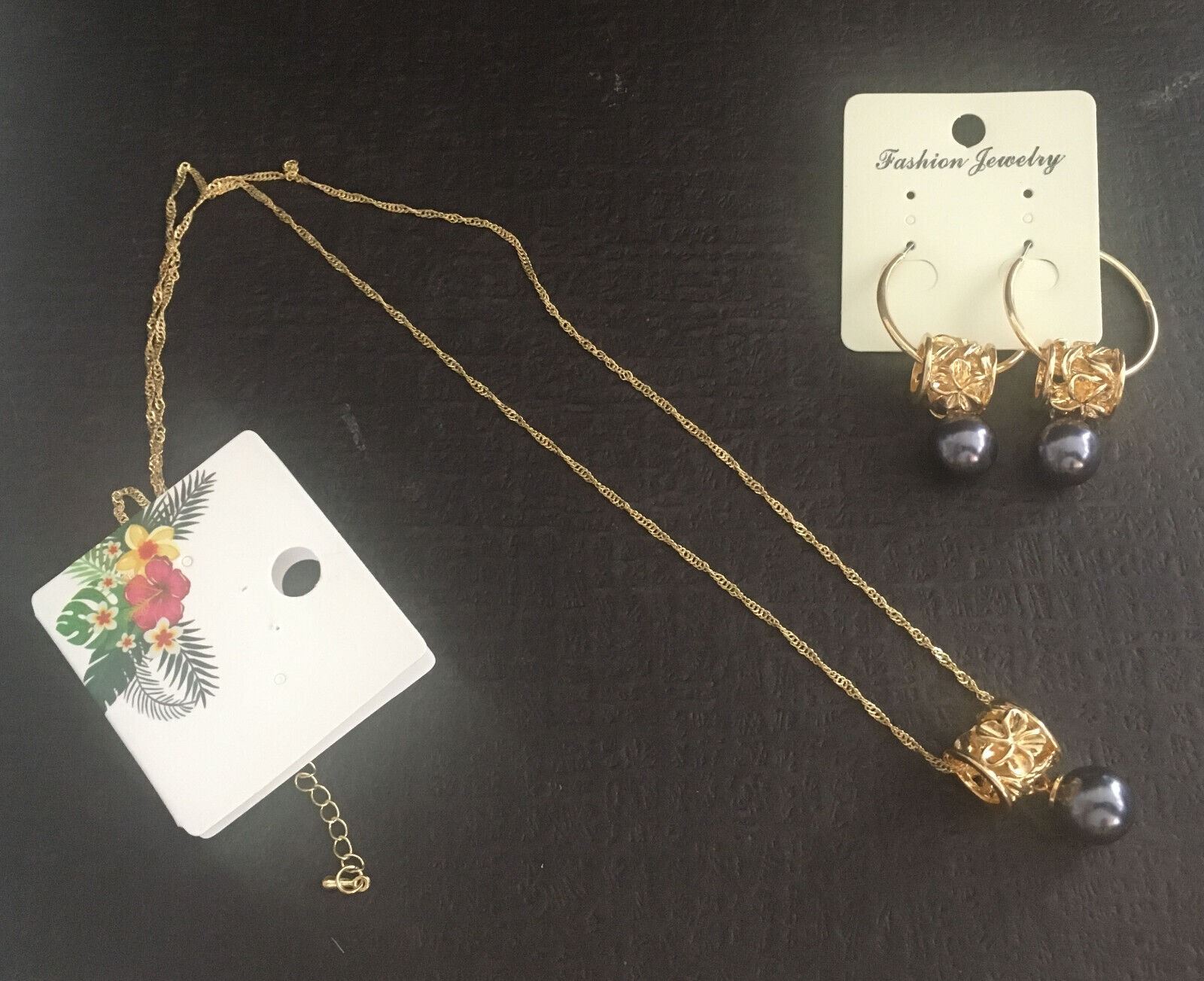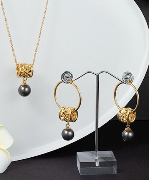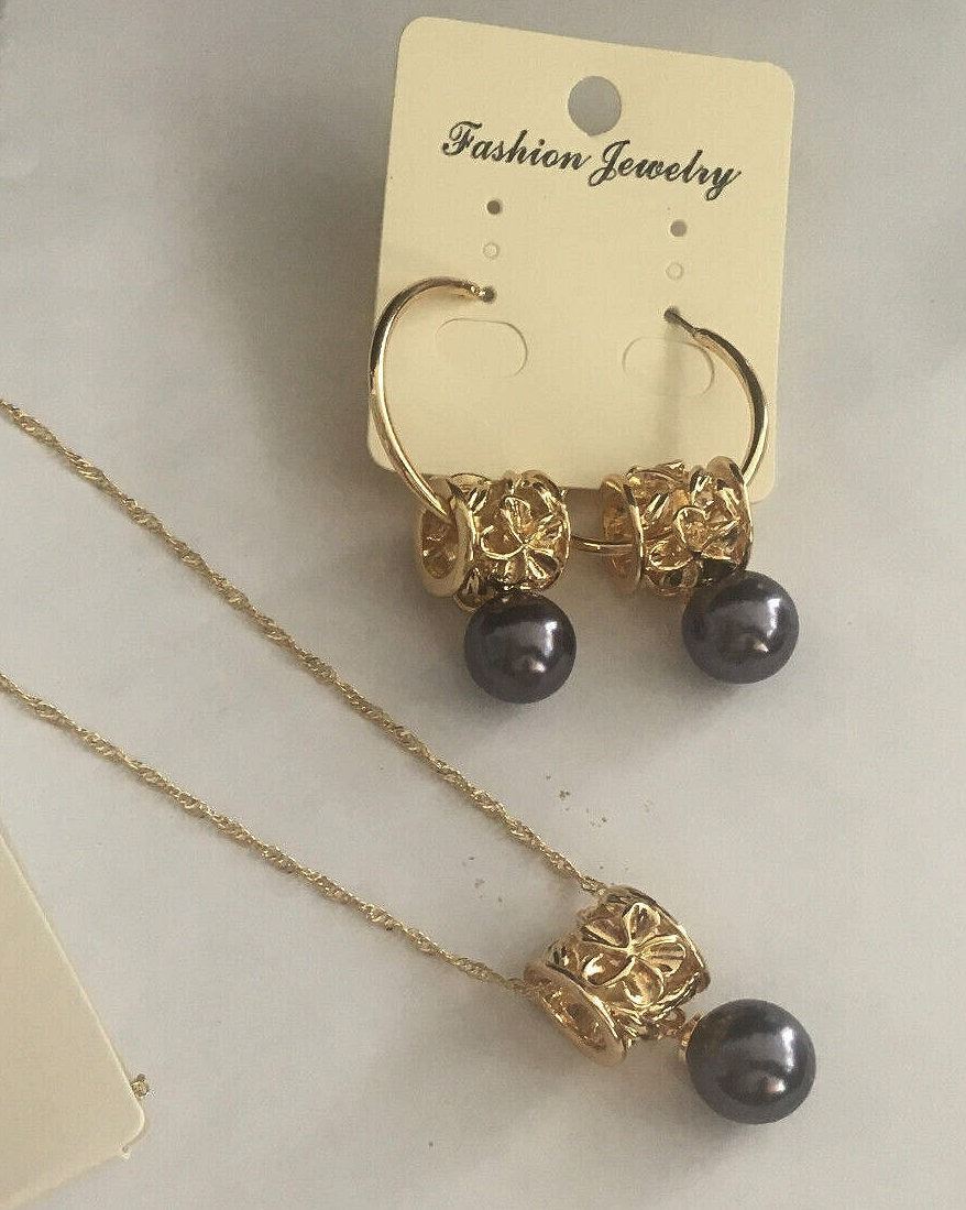 Qty 2 Gold-Tone Barrel w/ Floral Design Hoop Pierced Earring & Necklace Sets (1 w/ Black Pearl Beads)