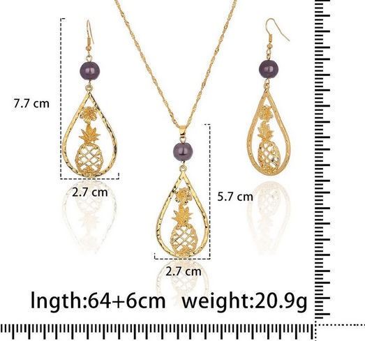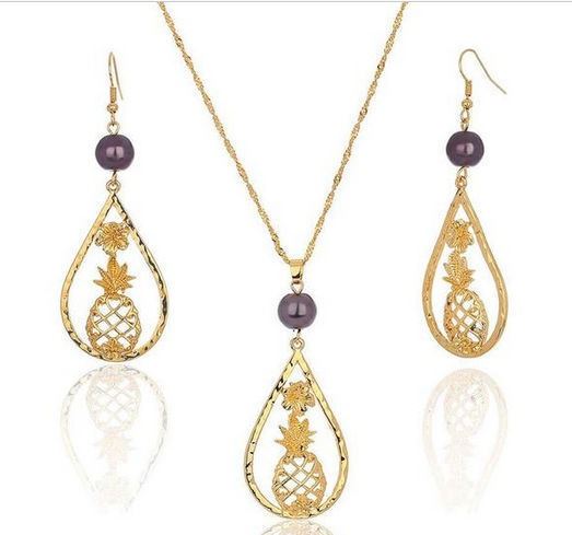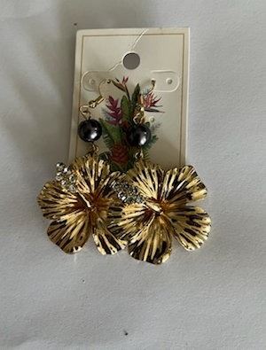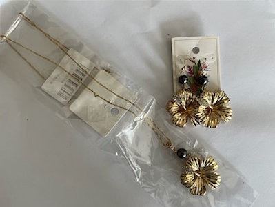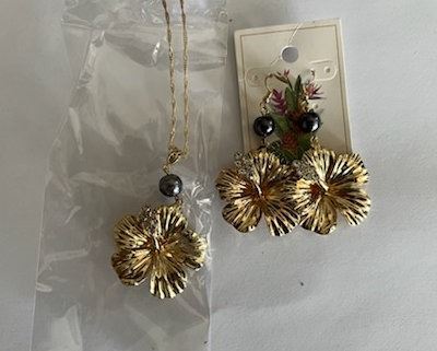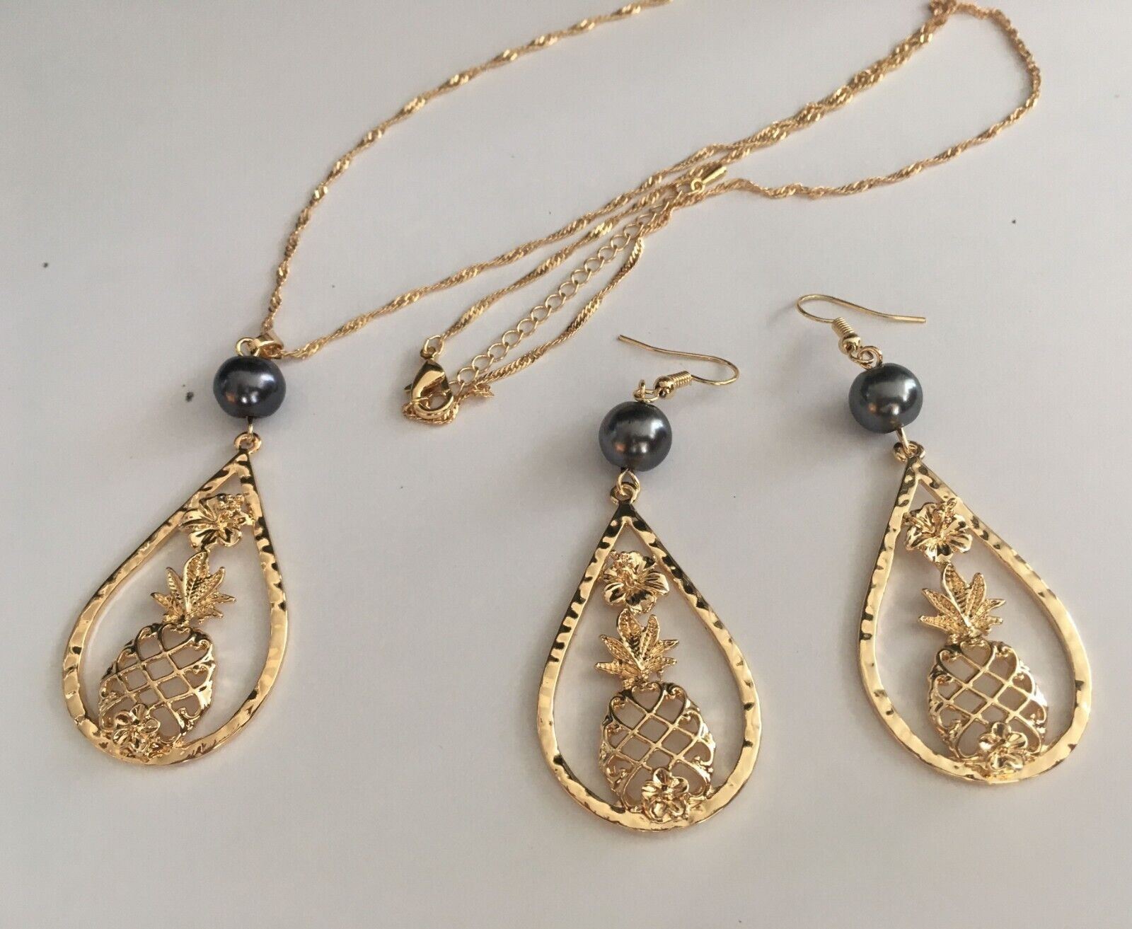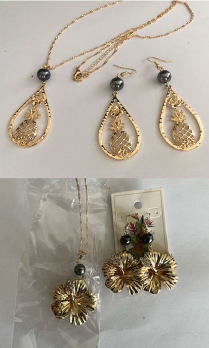 Qty 2 Gold-Tone Hawaiian Theme Hook Pierced Earring & Necklace Sets: Pineapple (approx 3"L) & Hibiscus (1.75"dia)
