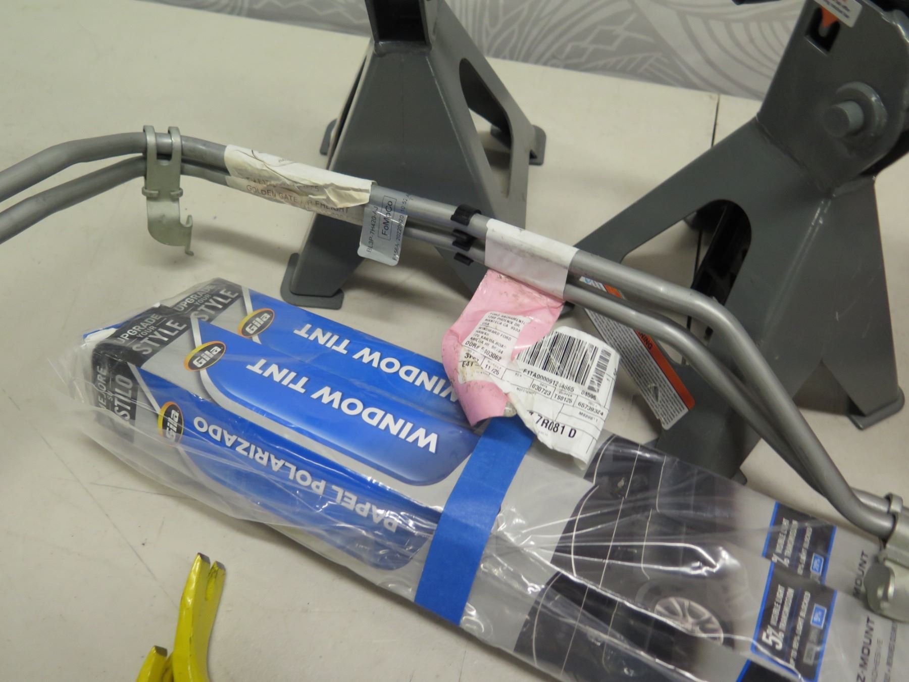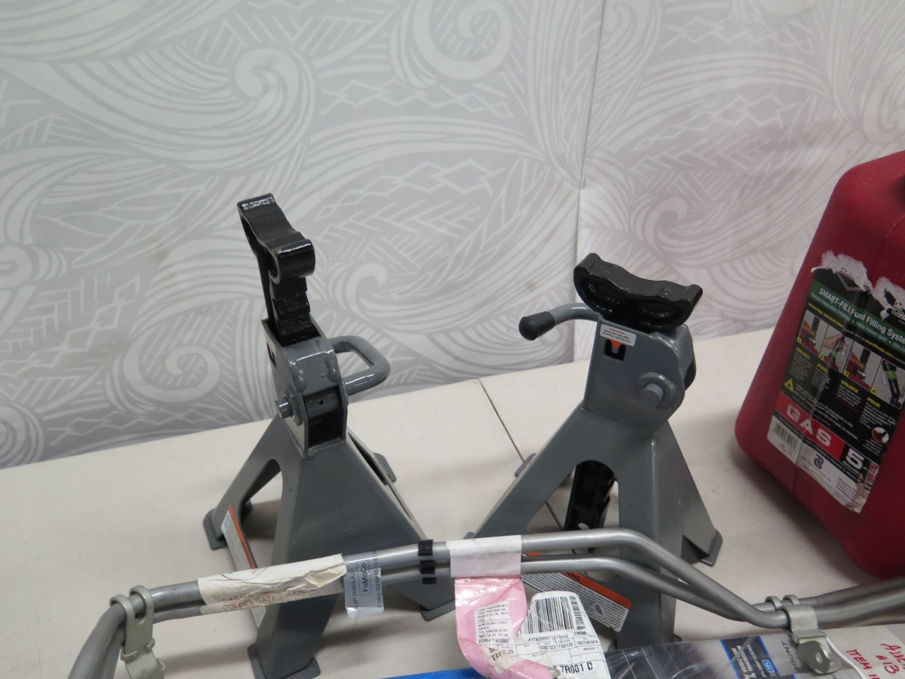 Qty 2 Jack Stands, Pry Bars, Window Tint, Gas Can, etc