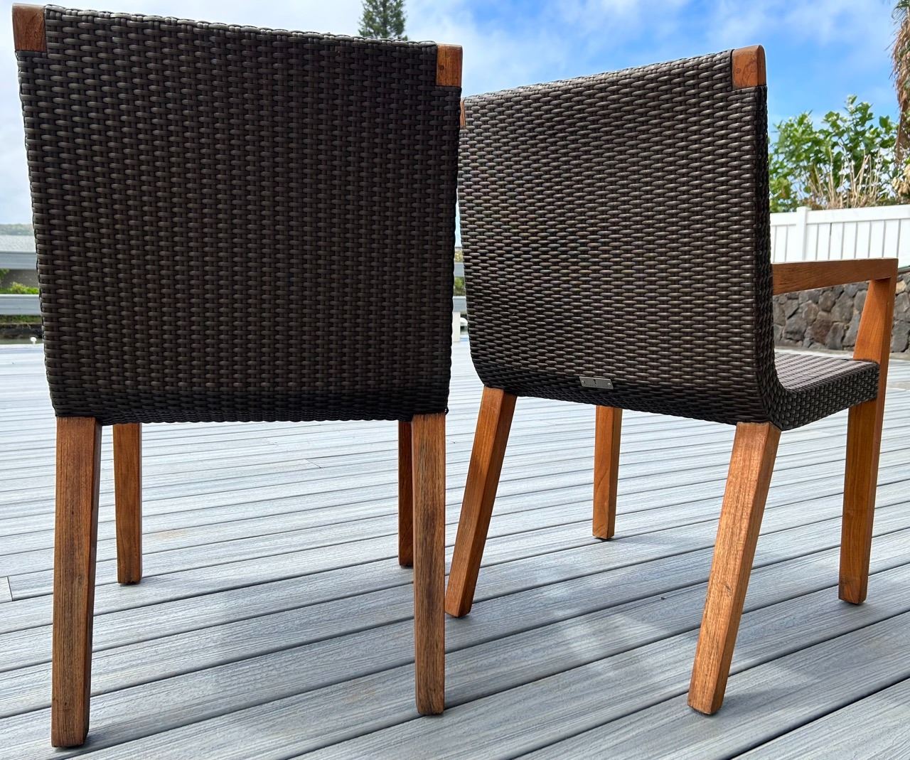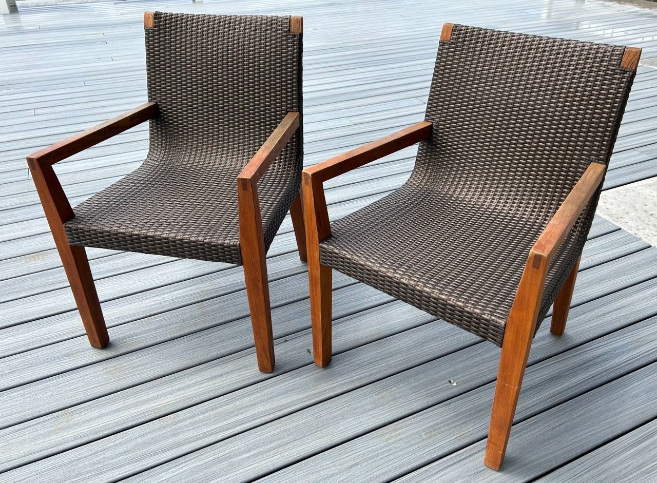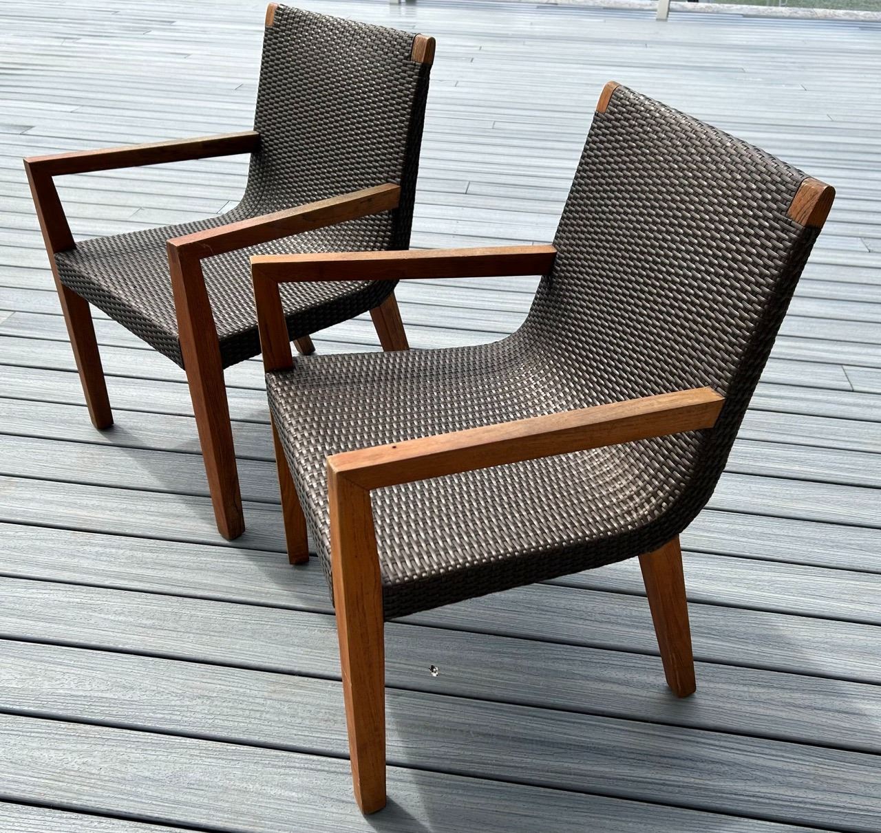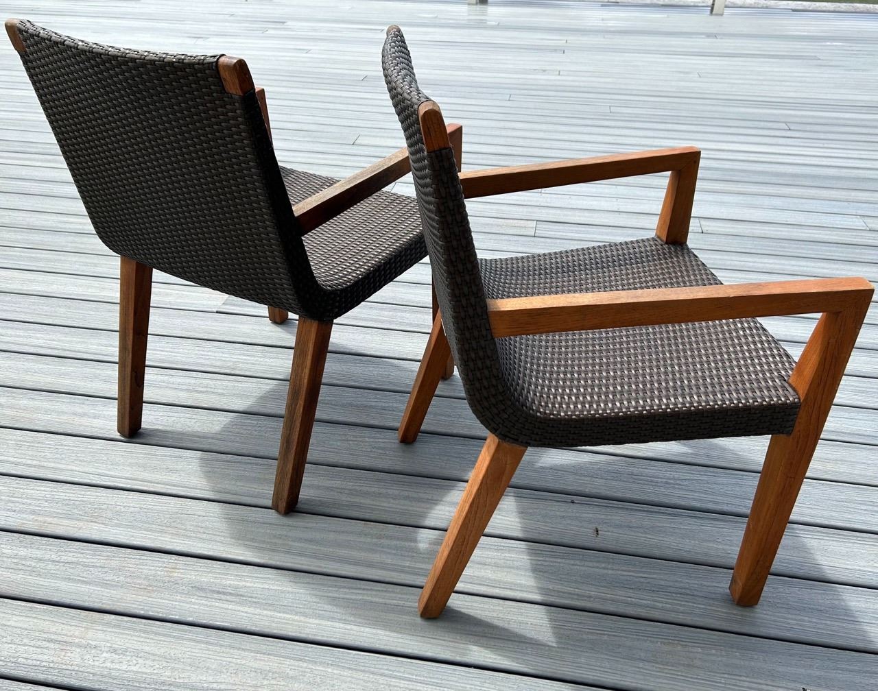 Qty 2 Janus et Cie Quinta Woven Armchairs w/ Teak Frame 22" x 18" x 38"H. This is a stock photo that is representative of these item(s). General cosmetic conditions may vary. Note: Wood color is faded and may need refinishing.