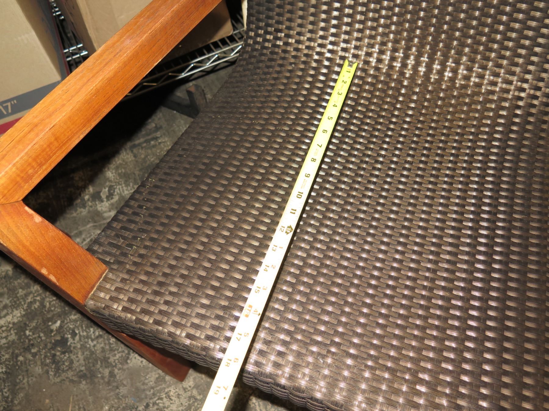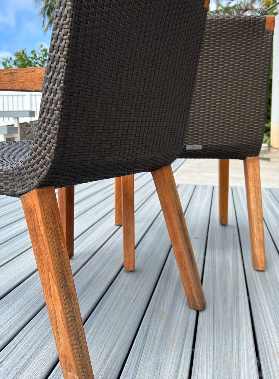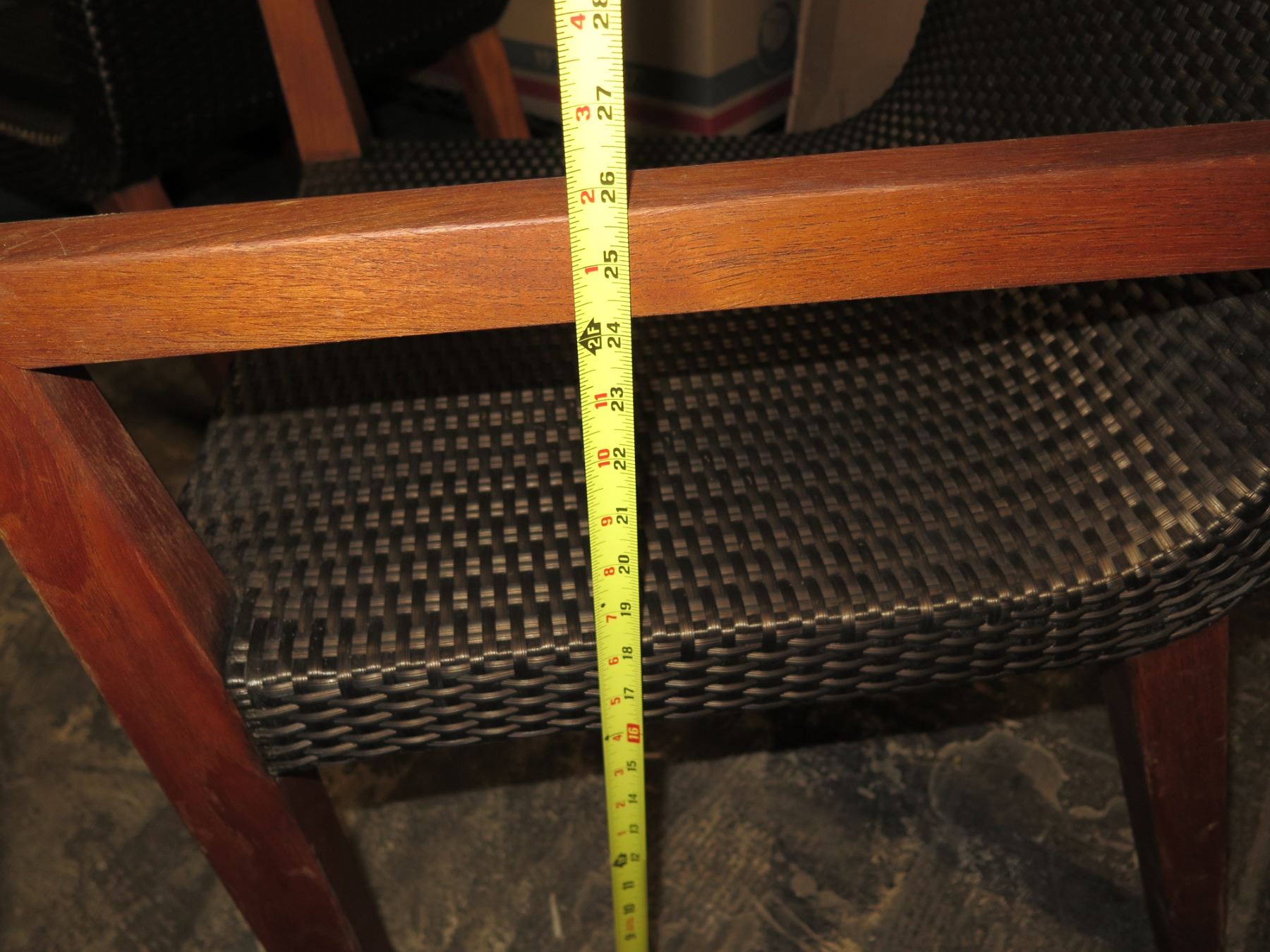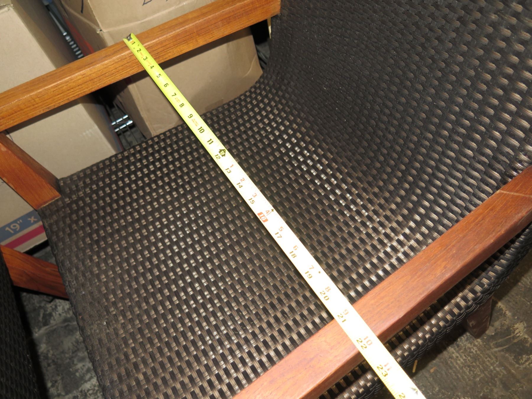 Qty 2 Janus et Cie Quinta Woven Armchairs w/ Teak Frame 22" x 18" x 38"H. This is a stock photo that is representative of these item(s). General cosmetic conditions may vary. Note: Wood color is faded and may need refinishing.