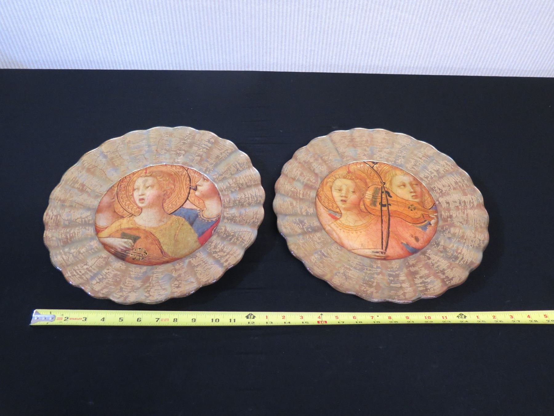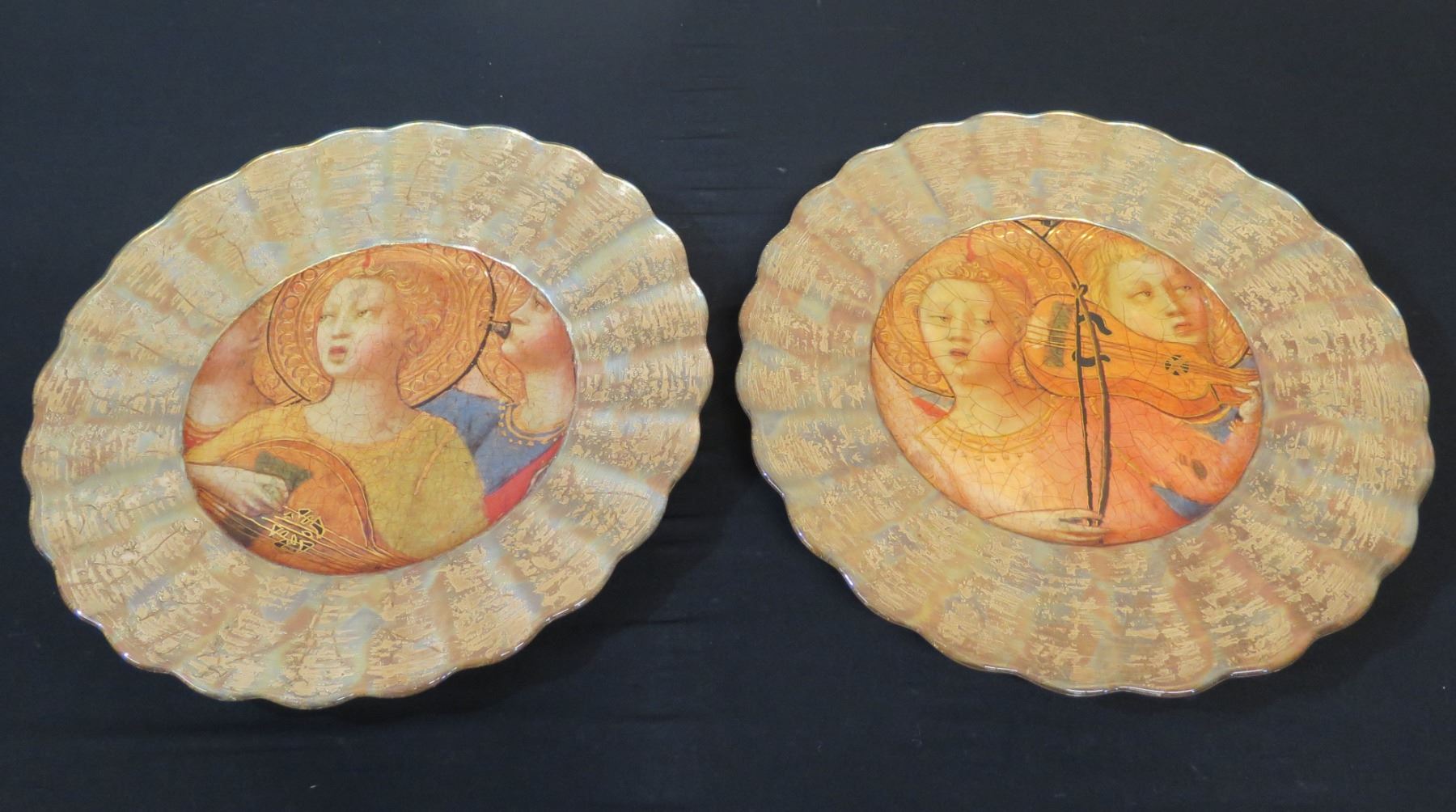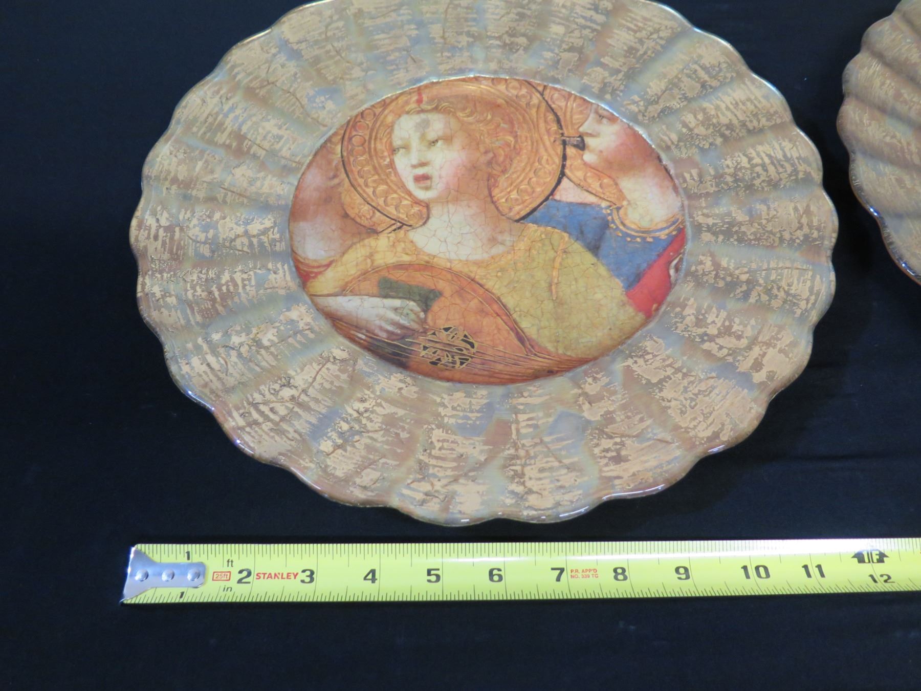 Qty 2 Lesley Roy Hand Illuminated Renaissance Minstrel Angels Fluted Plates in 24kt Gold 12" dia