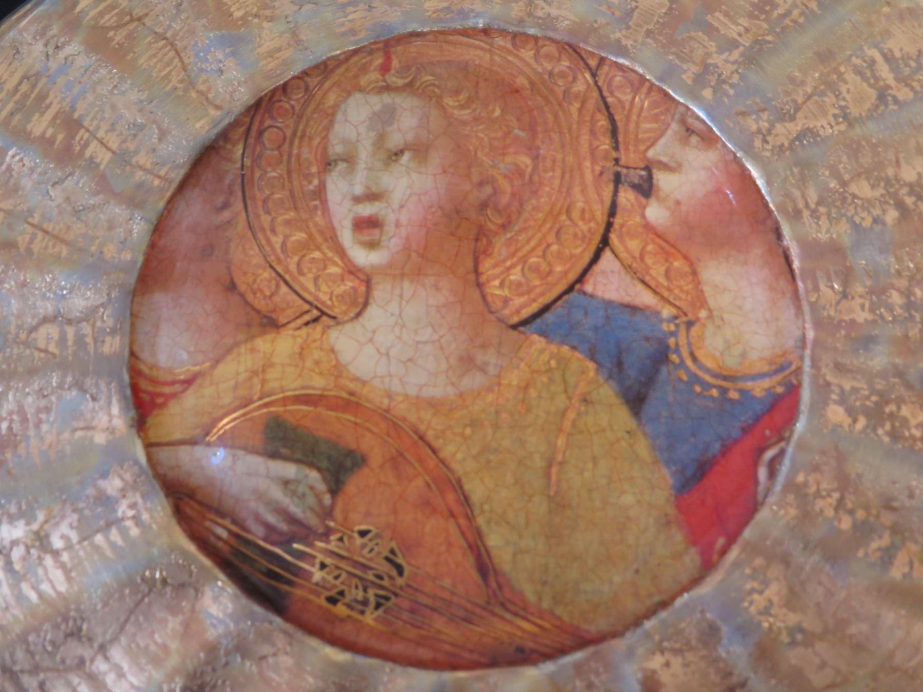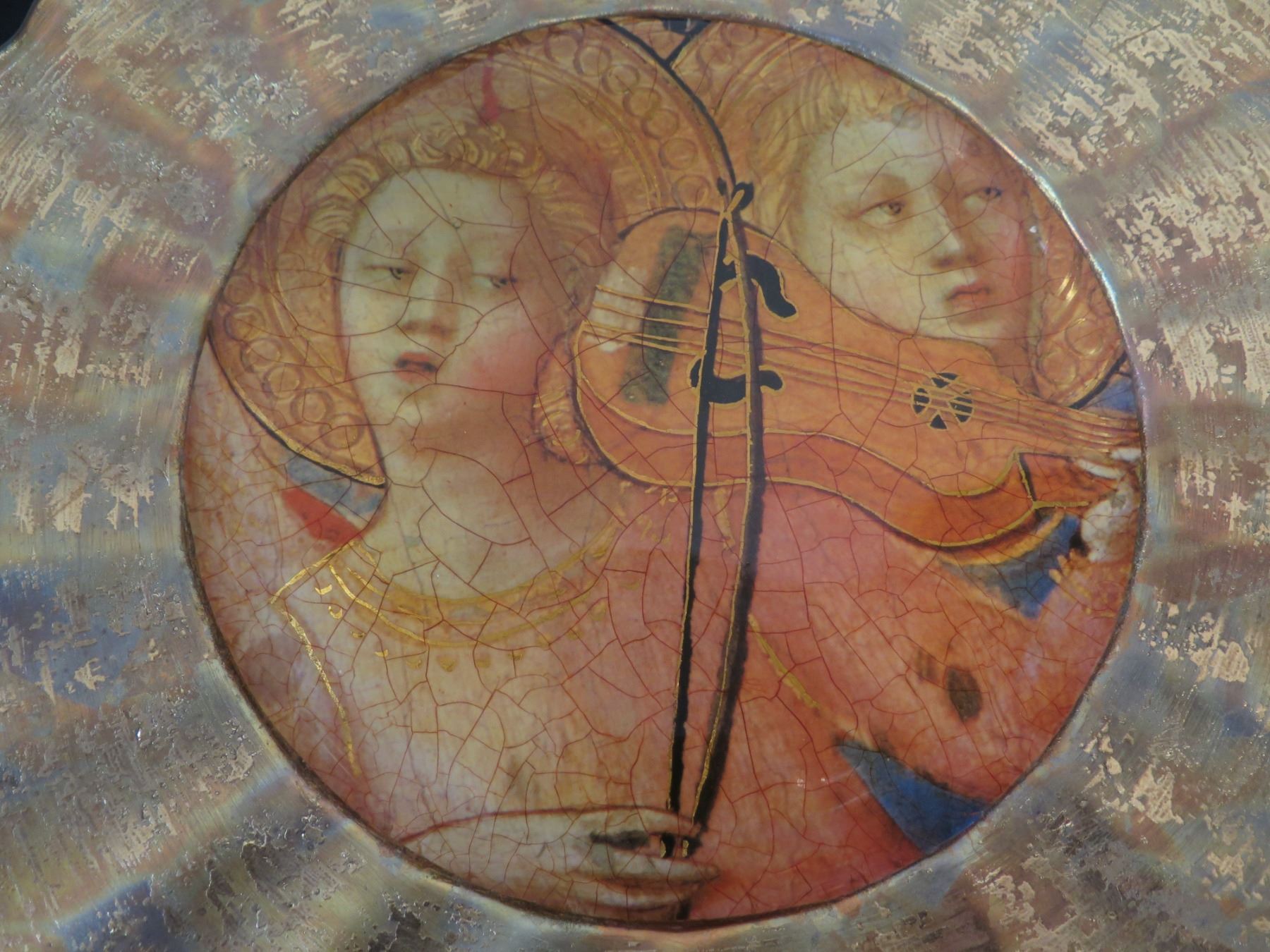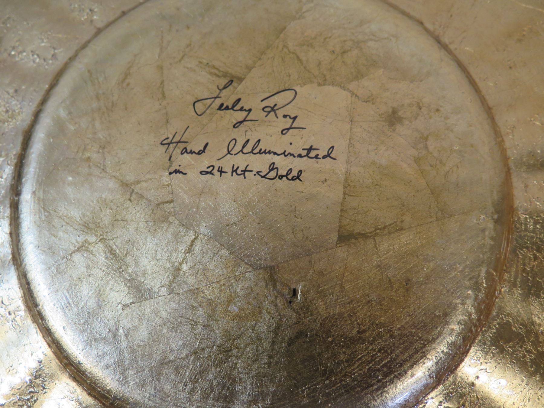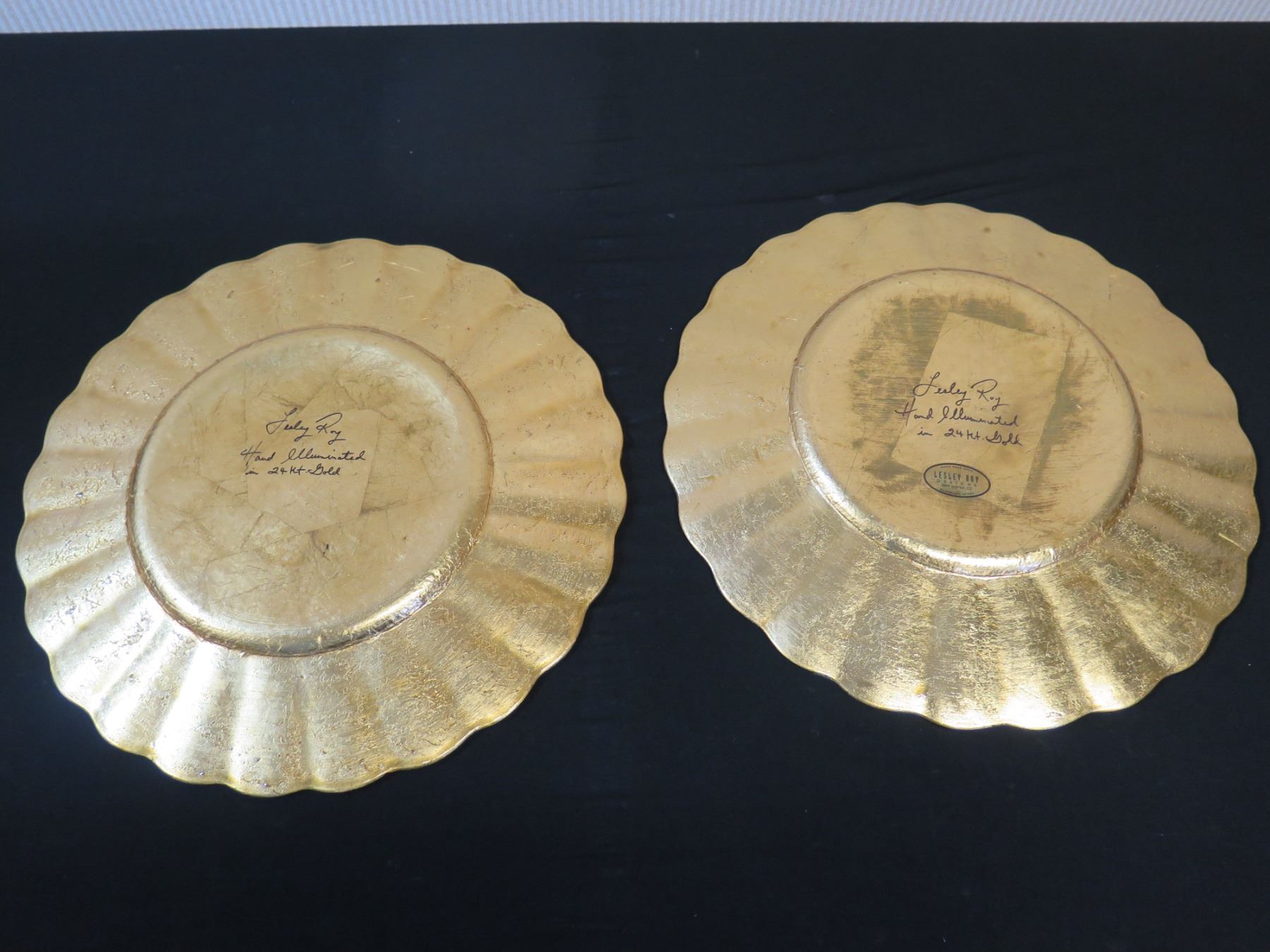 Qty 2 Lesley Roy Hand Illuminated Renaissance Minstrel Angels Fluted Plates in 24kt Gold 12" dia