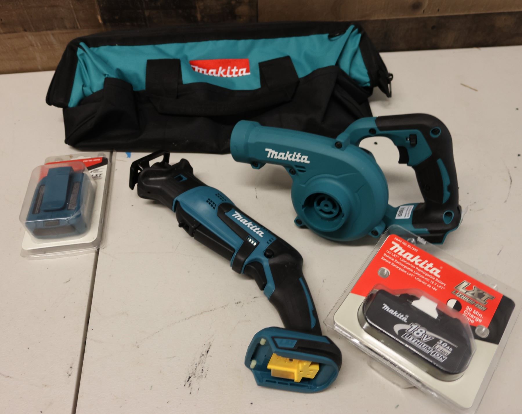 Qty 2 Makita Power Tools, Battery, Case & Power Source: XBU05 Blower Base & XRJ01 Reciprocating Saw