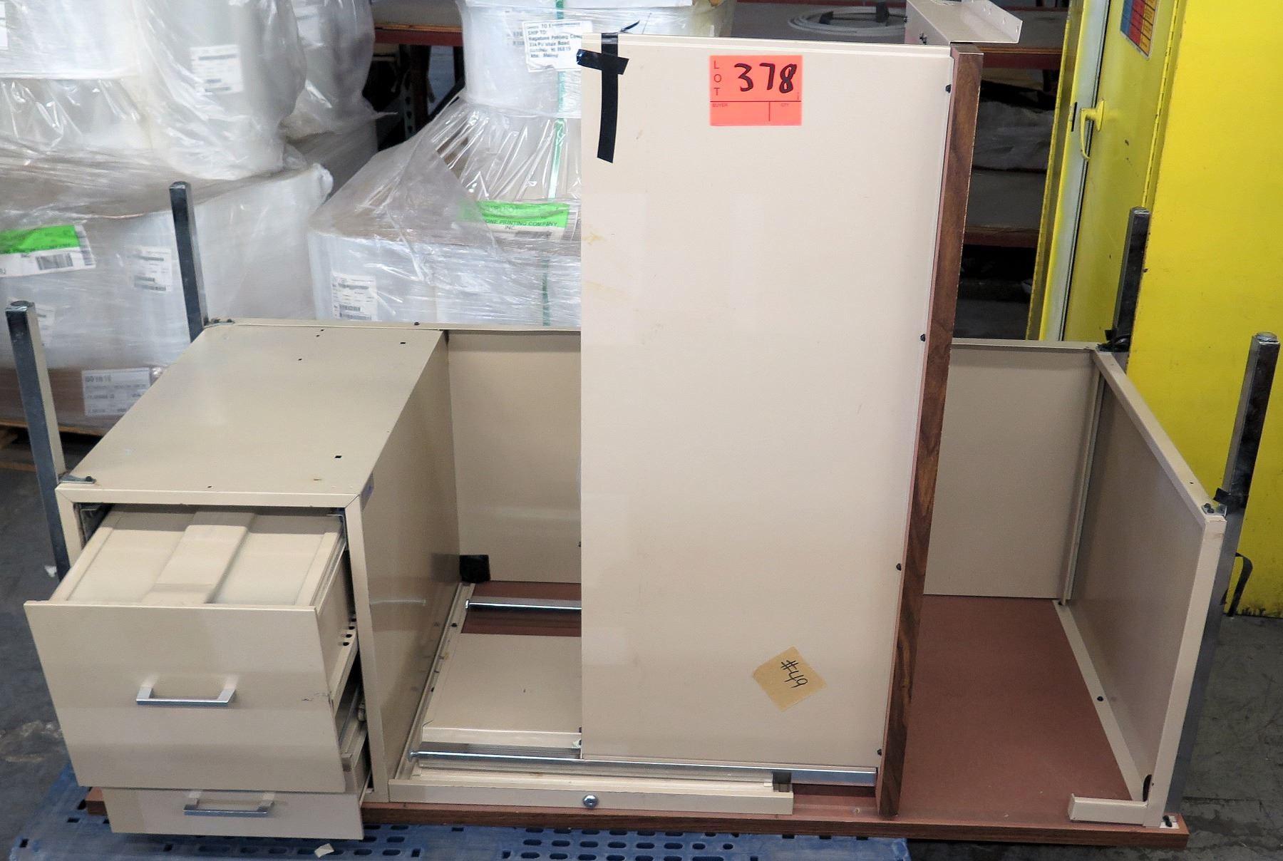 Qty 2 Metal & Pressed Wood Shop Desks & 1 Metal 2 Drawer File Cabinet