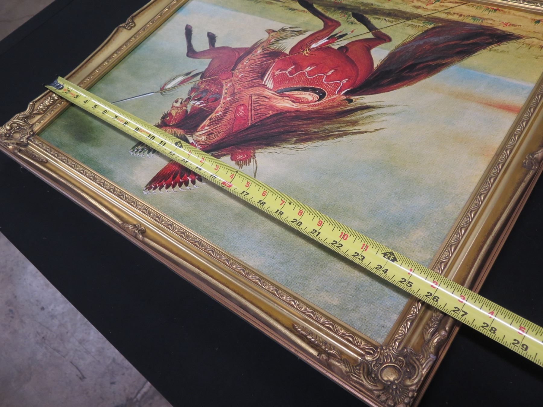 Qty 2 Native American Framed Artwork: Village Scene & Male on Horseback 27"x23"