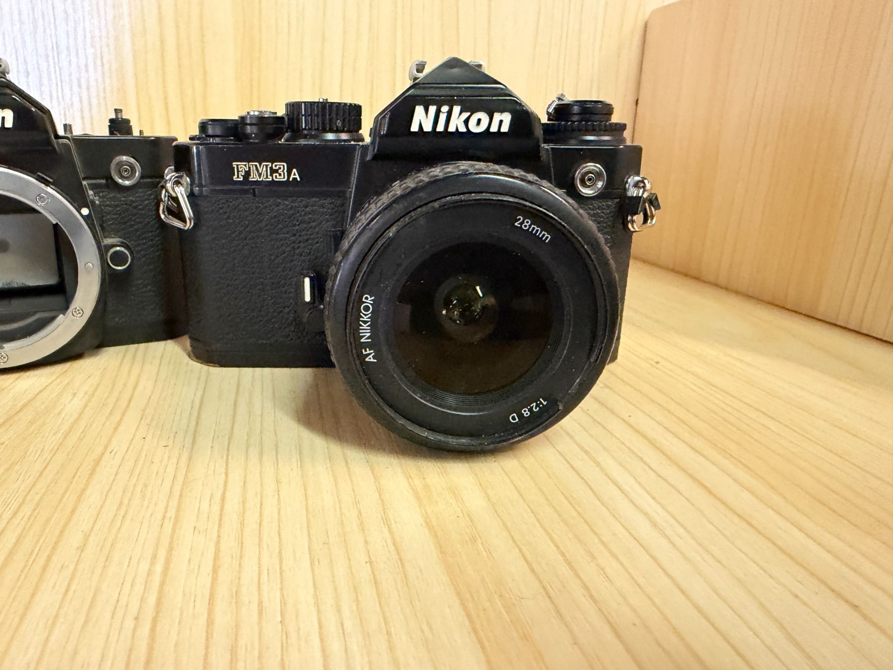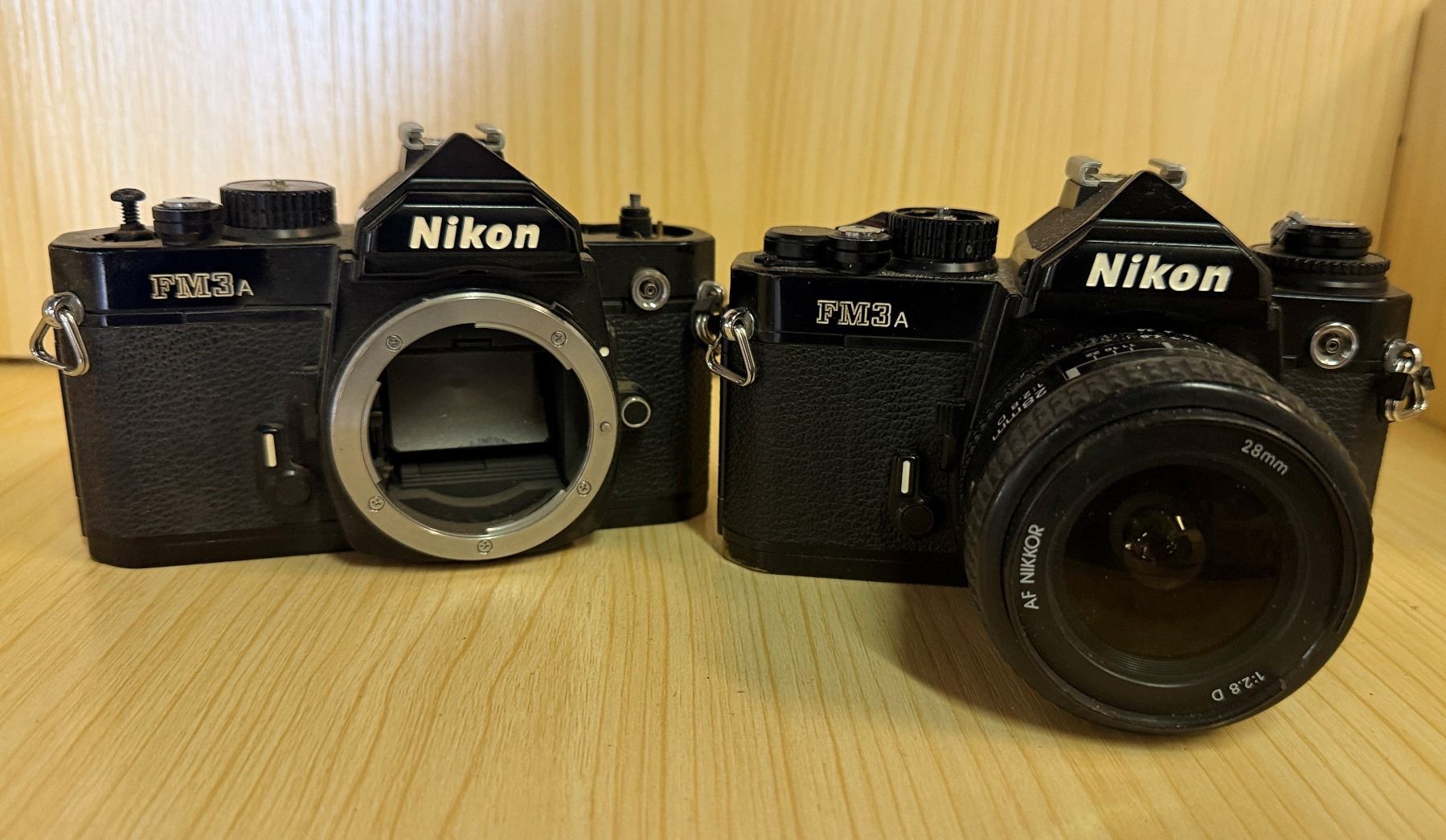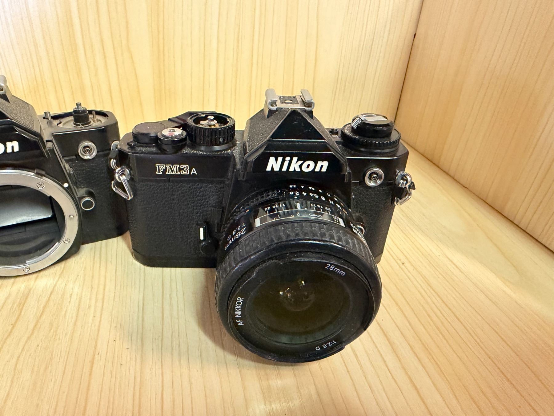 Qty 2 Nikon FM3A 35mm Film SLR Cameras w/ 1 AF Nikkor 28mm f/2.8D Lens (for parts or repair)