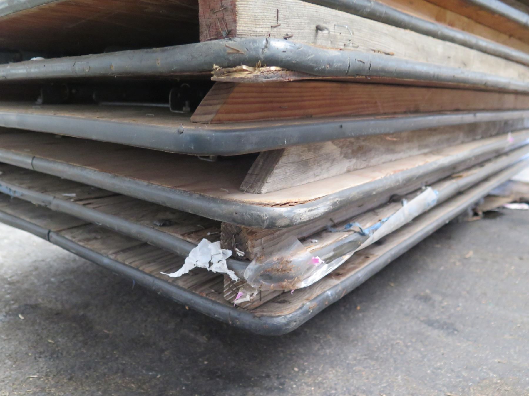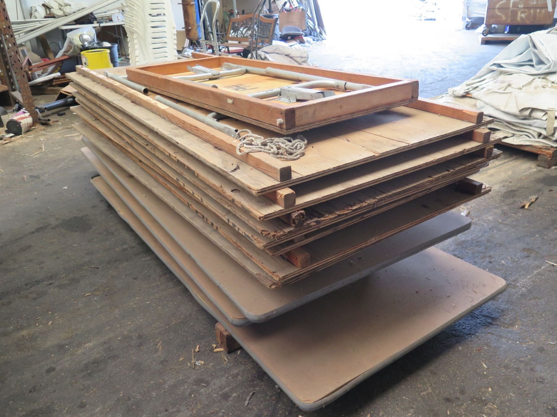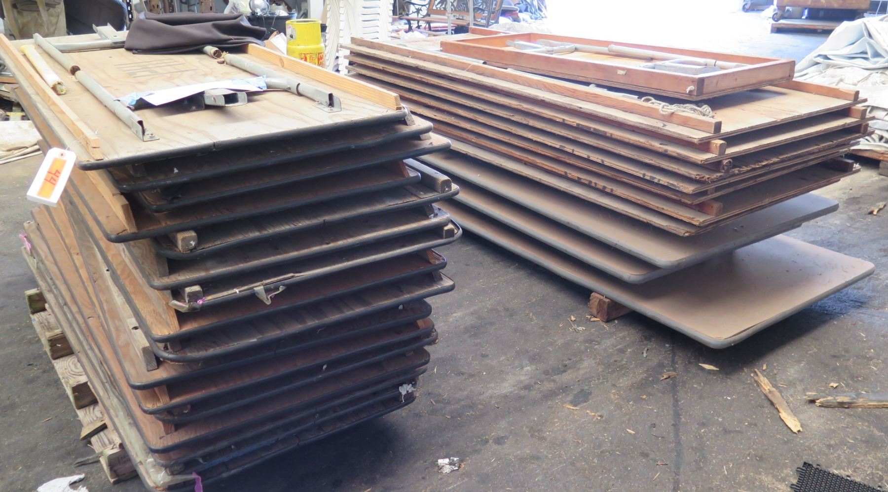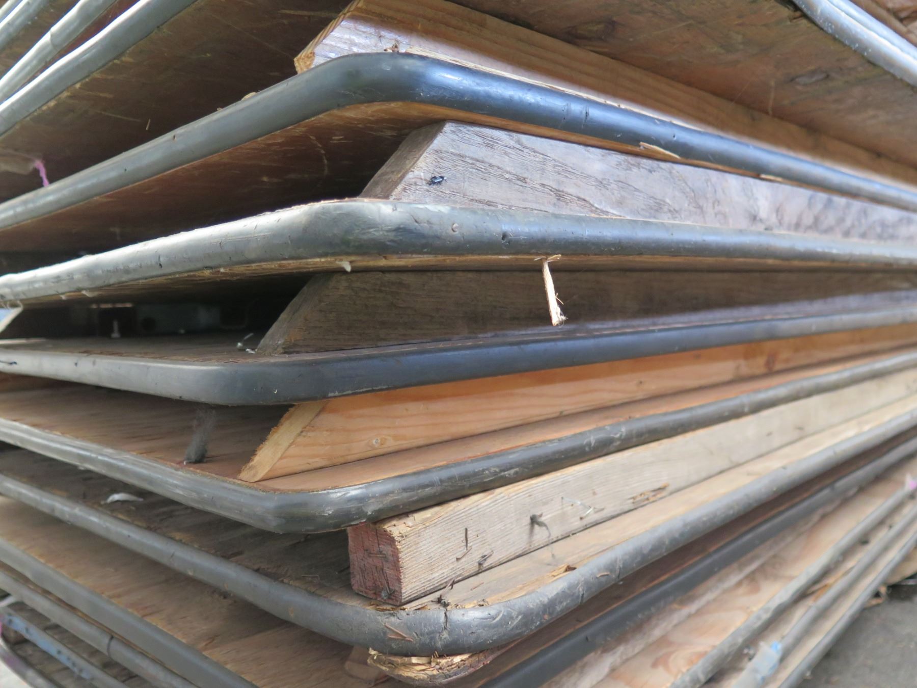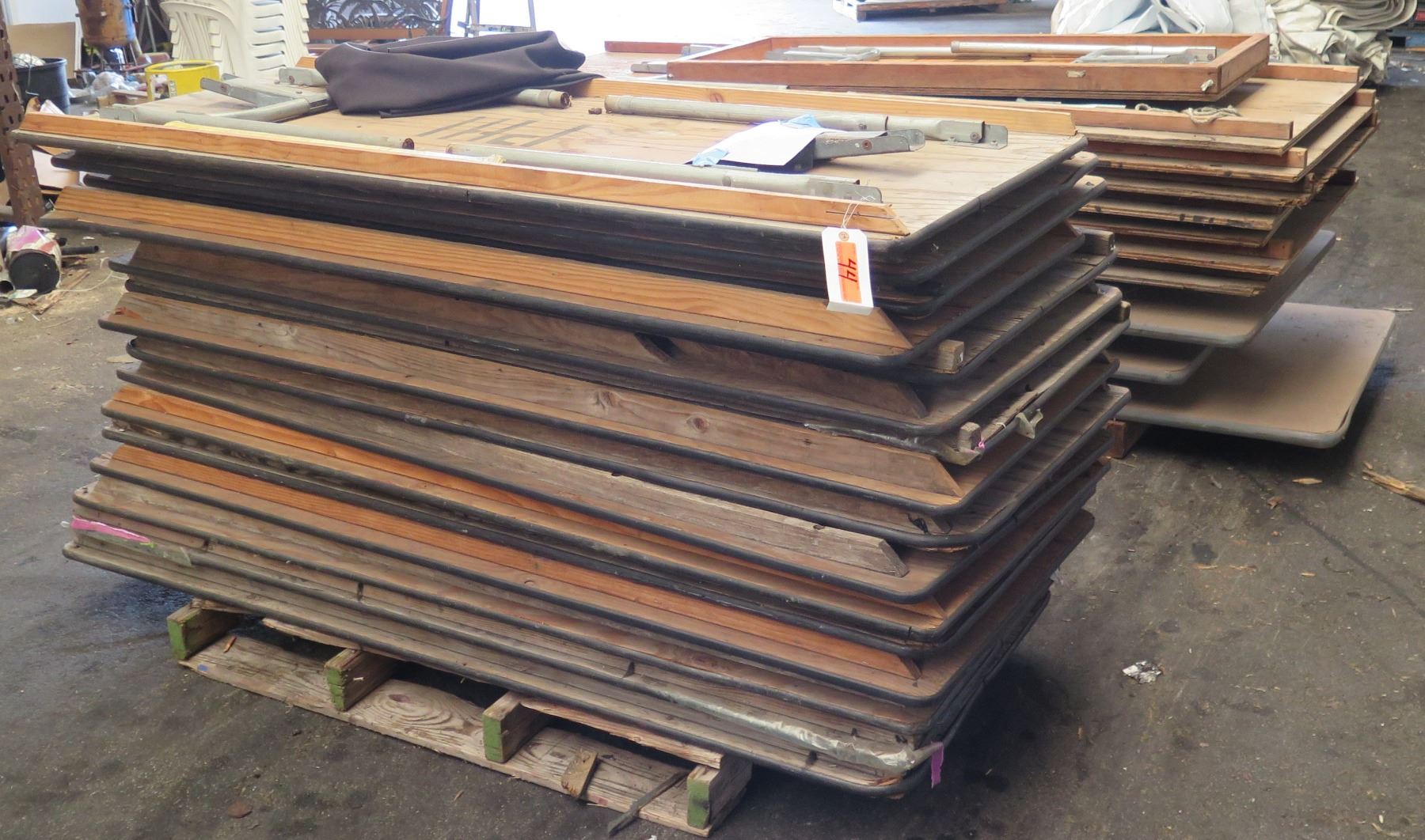 Qty 2 Pallets Wooden Rectangular Folding Tables w/ Metal Legs. May have termites and termite damage.