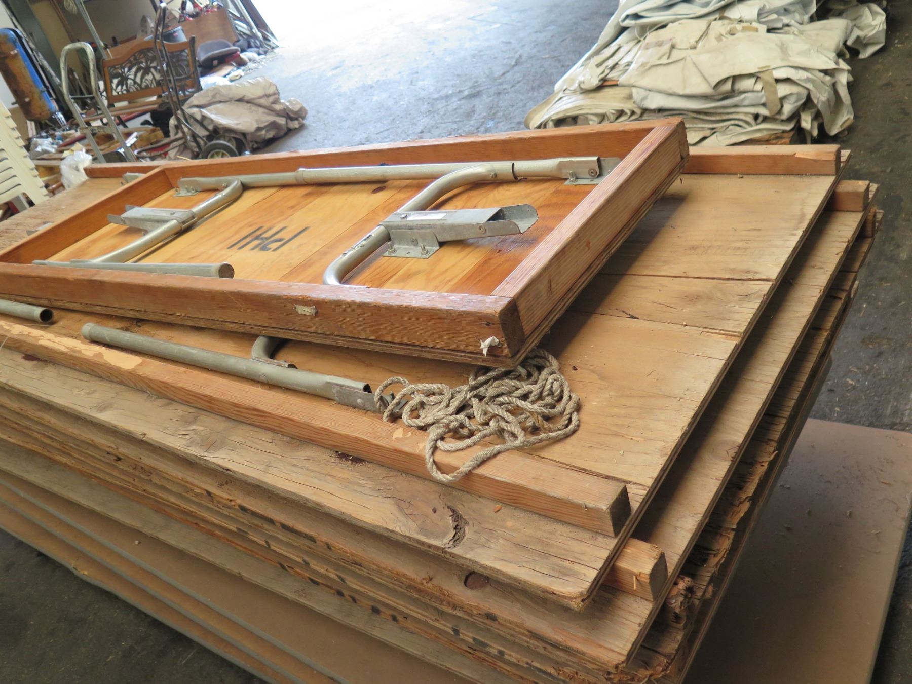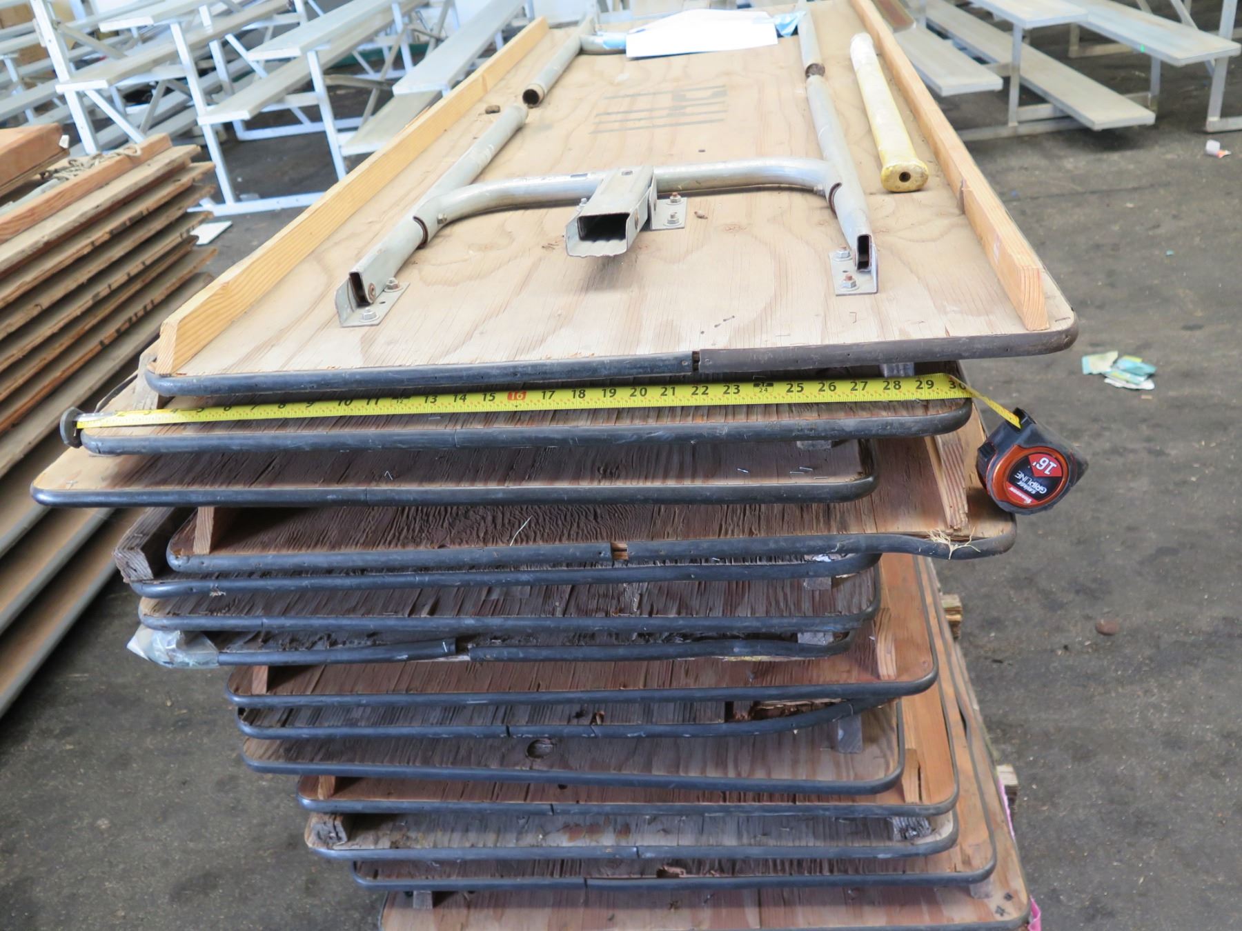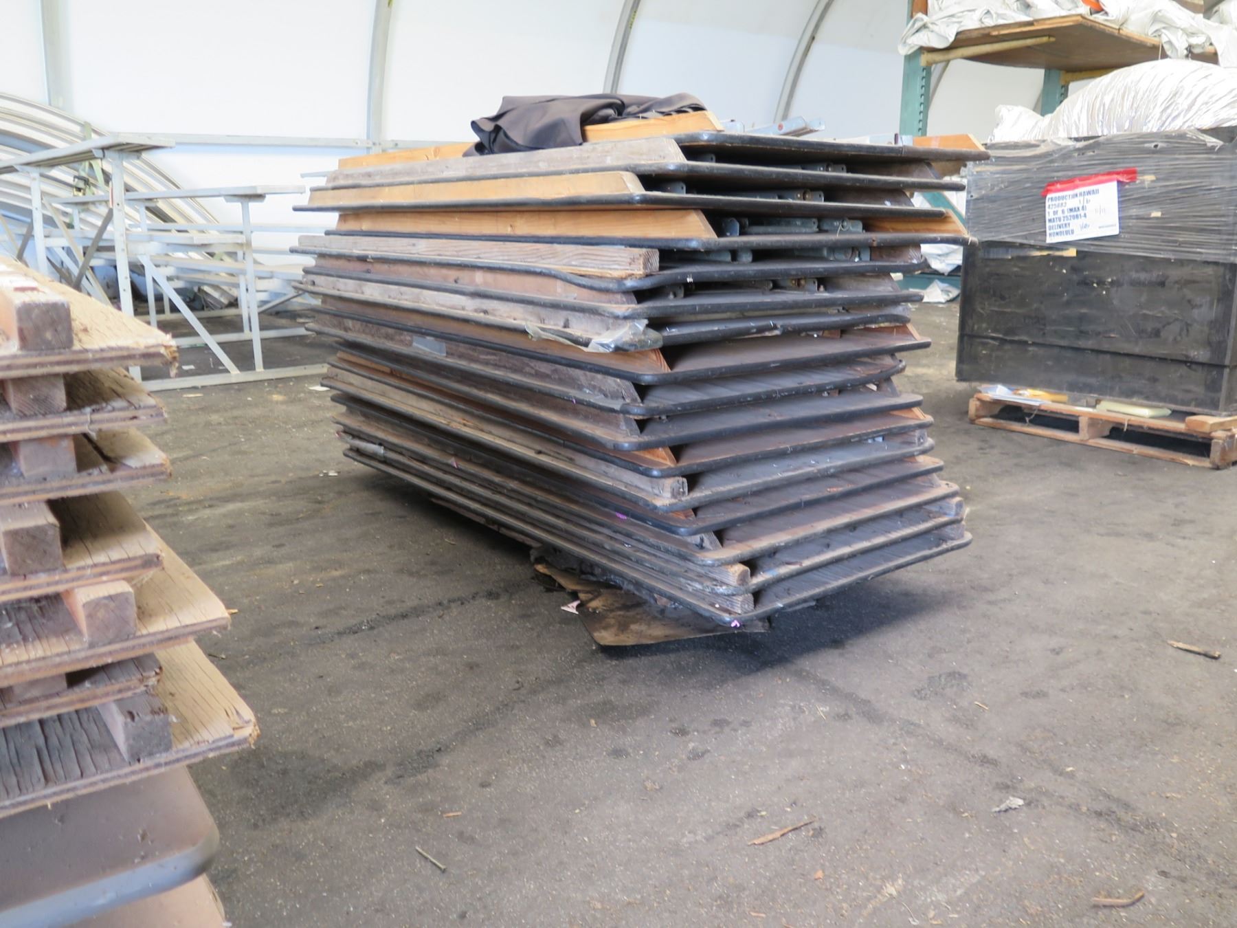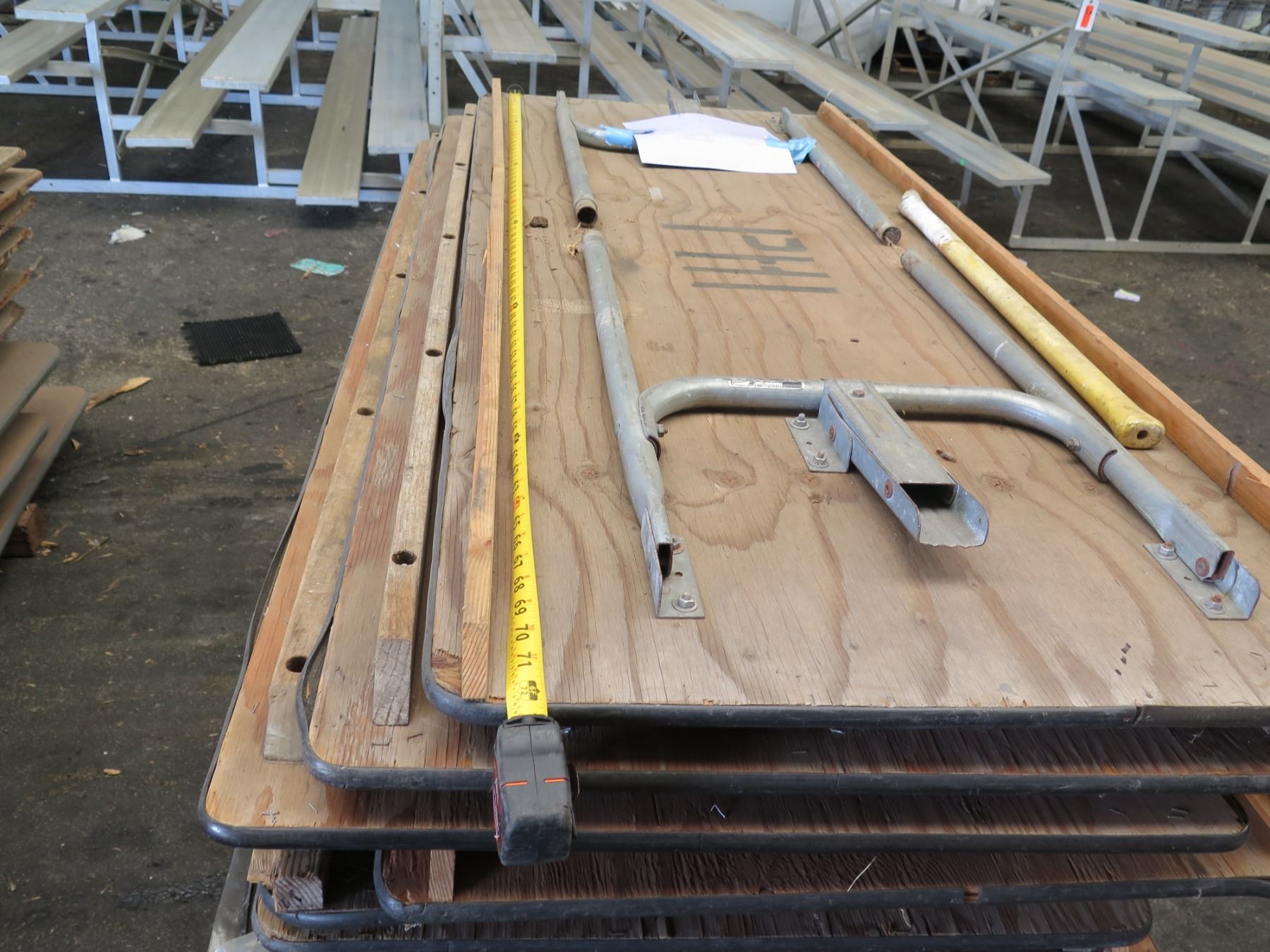 Qty 2 Pallets Wooden Rectangular Folding Tables w/ Metal Legs. May have termites and termite damage.