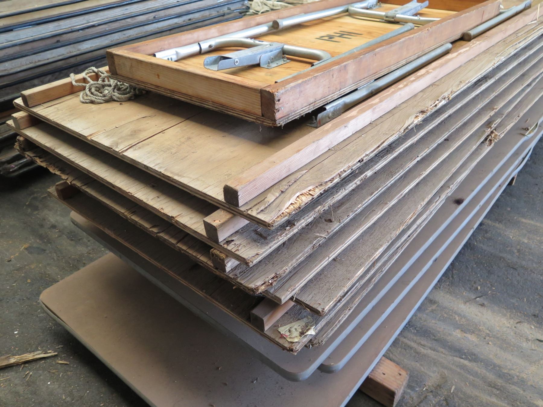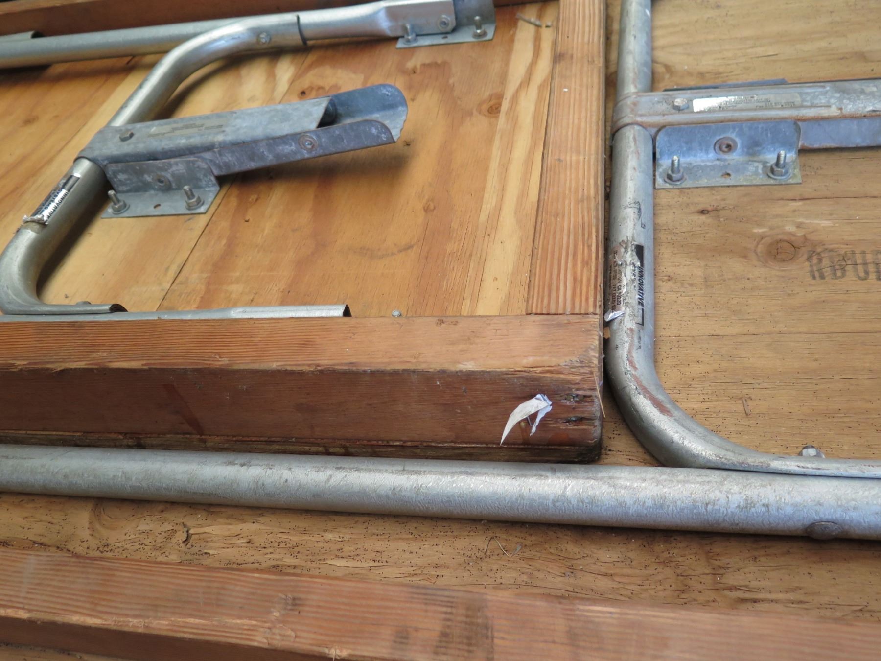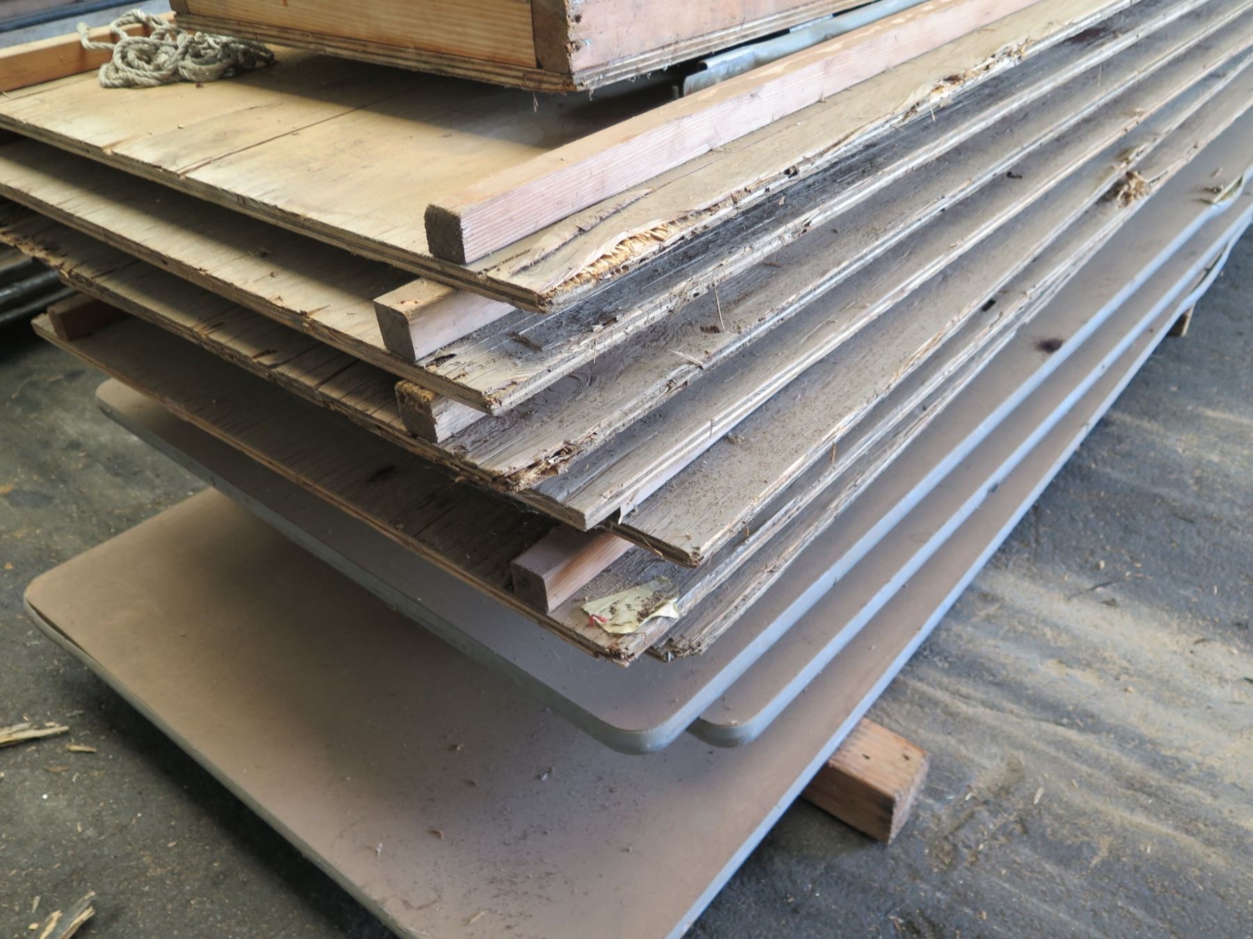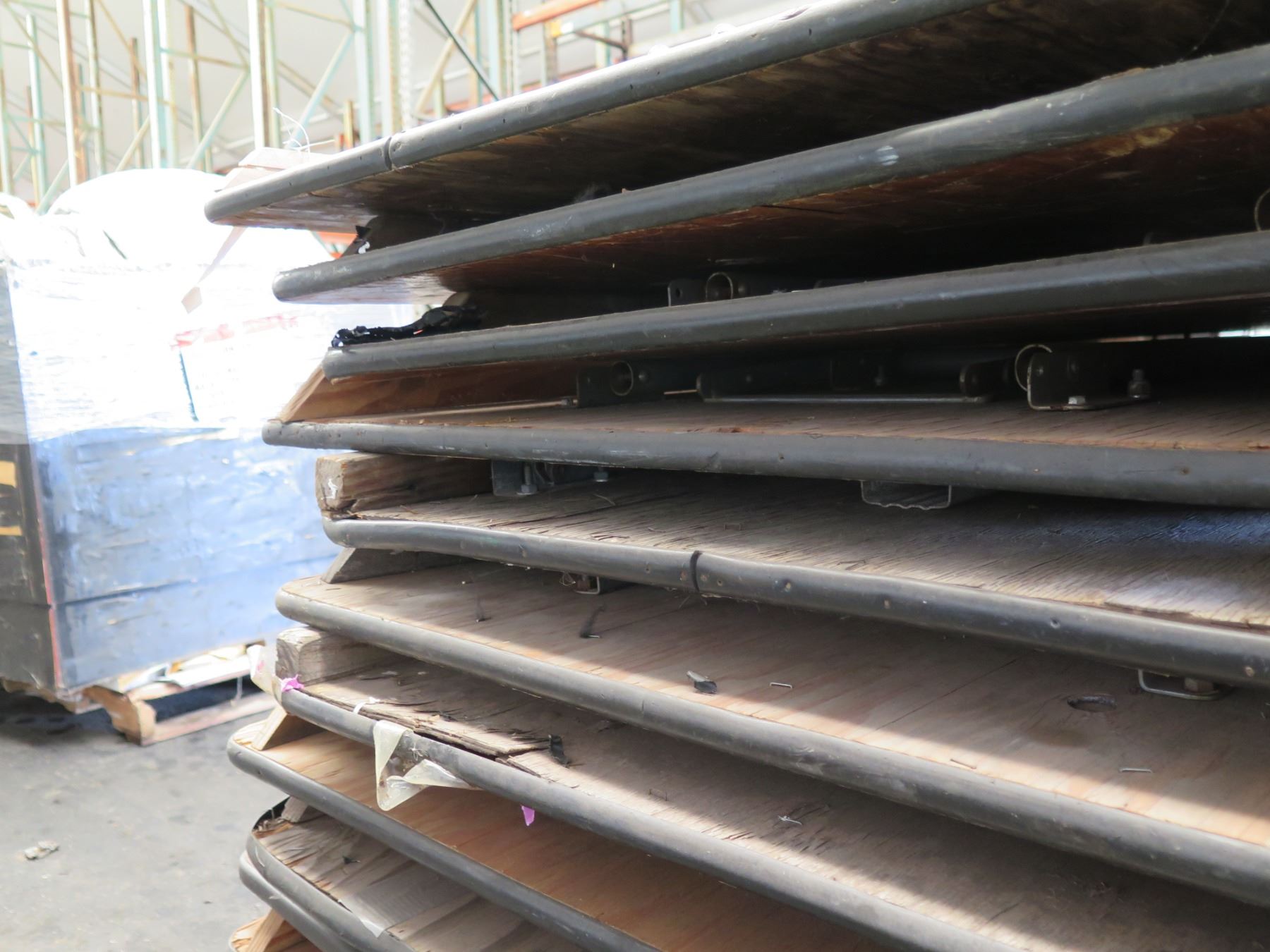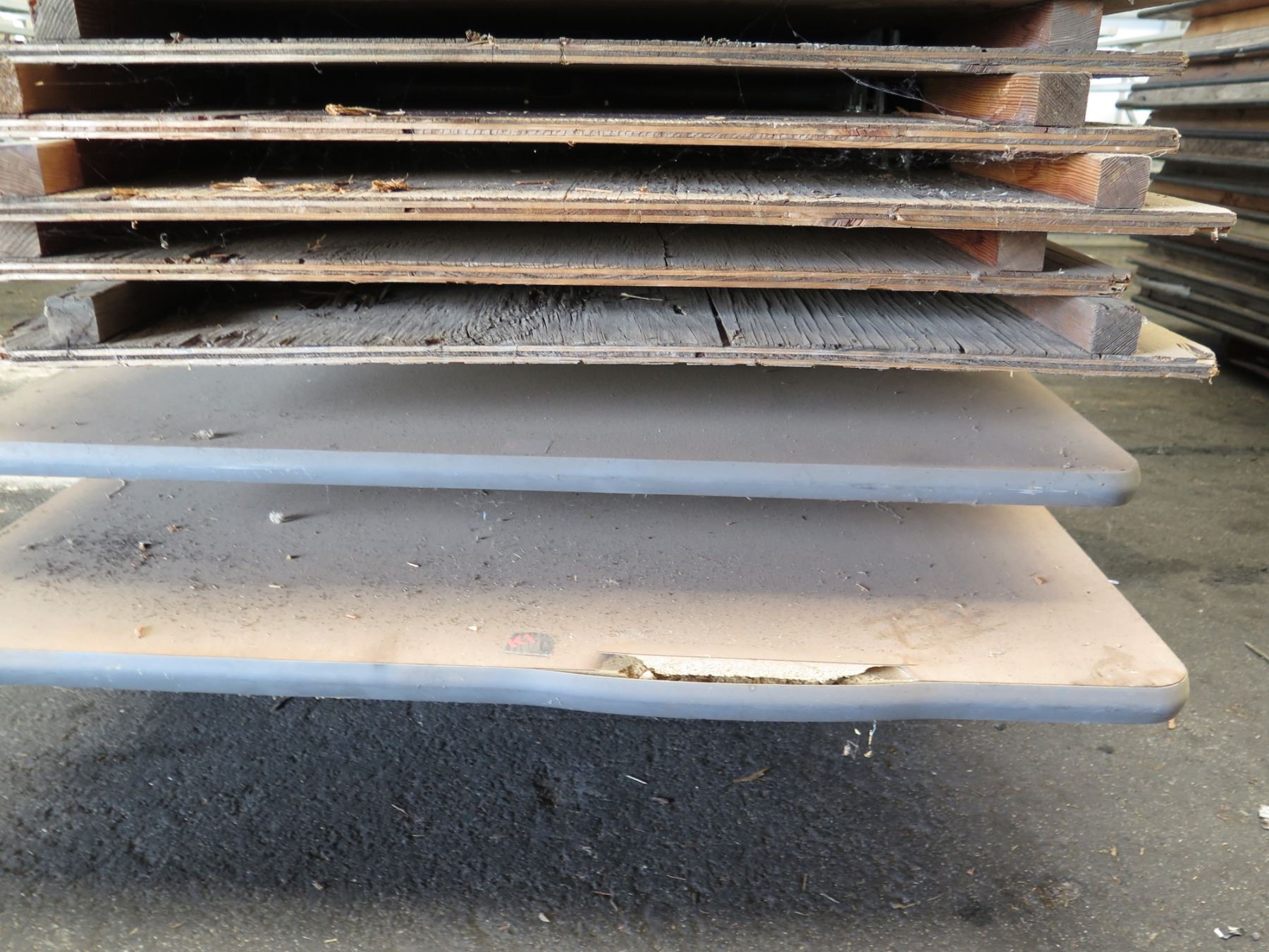 Qty 2 Pallets Wooden Rectangular Folding Tables w/ Metal Legs. May have termites and termite damage.