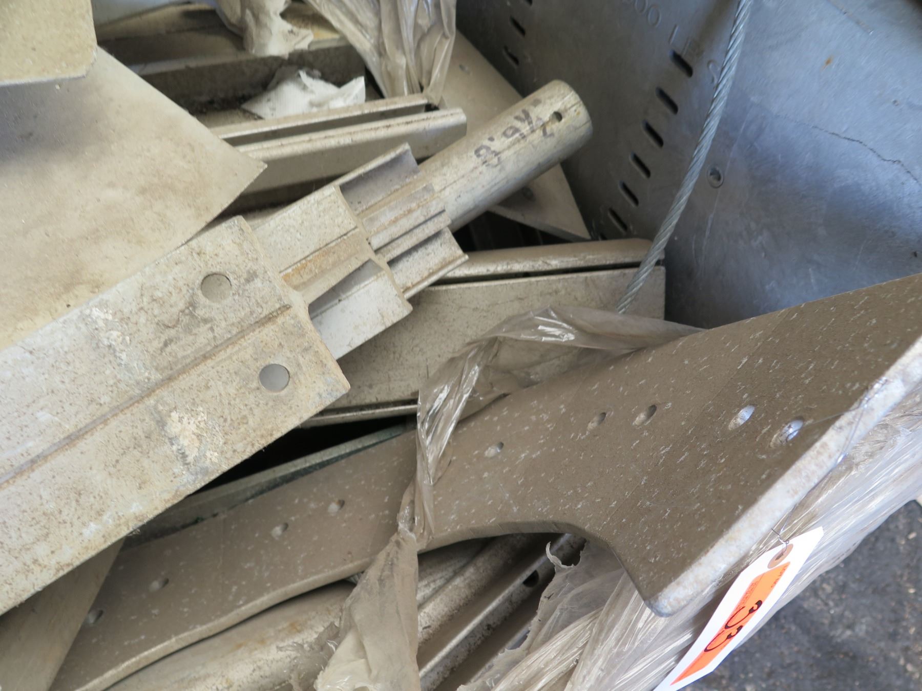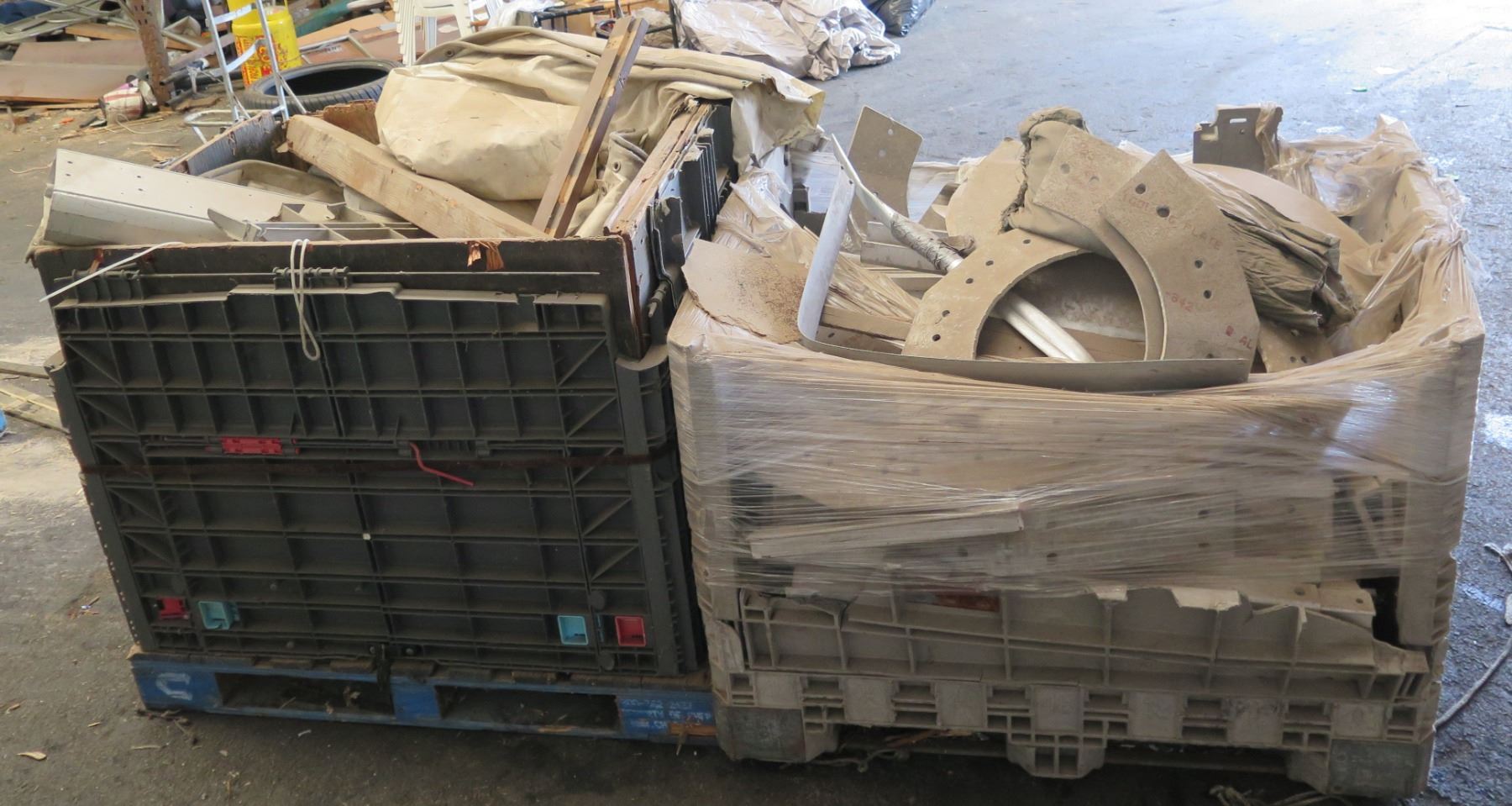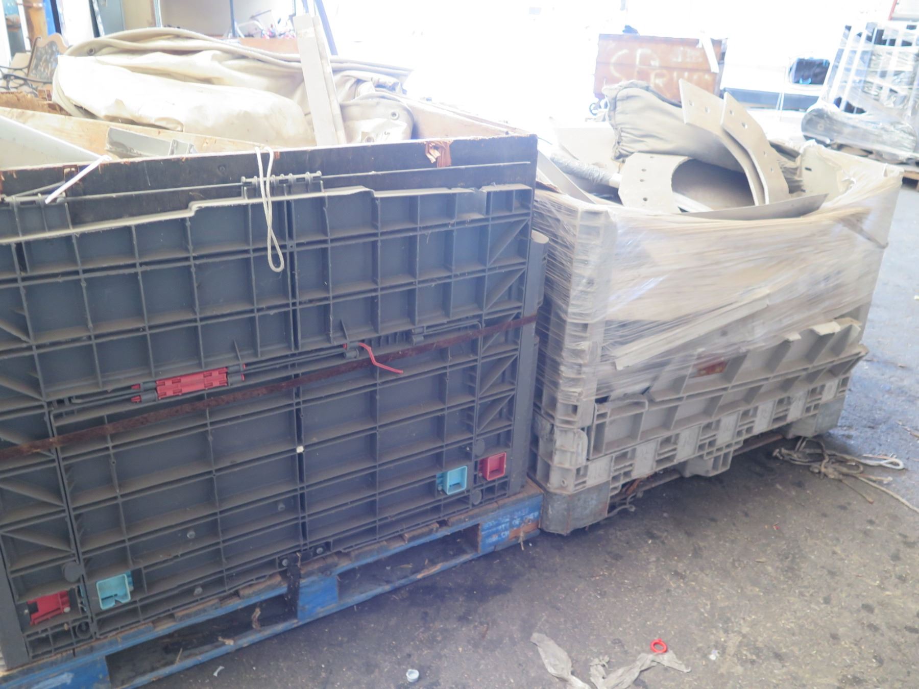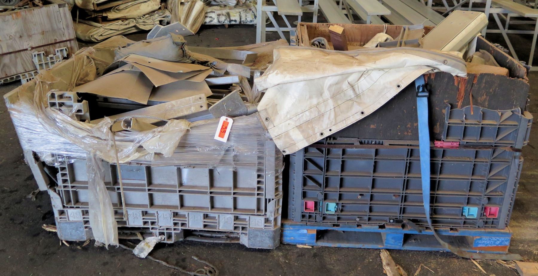 Qty 2 Plastic Bins Curved Metal 1000 G Plates, Poles, Fittings, Tarps, etc
