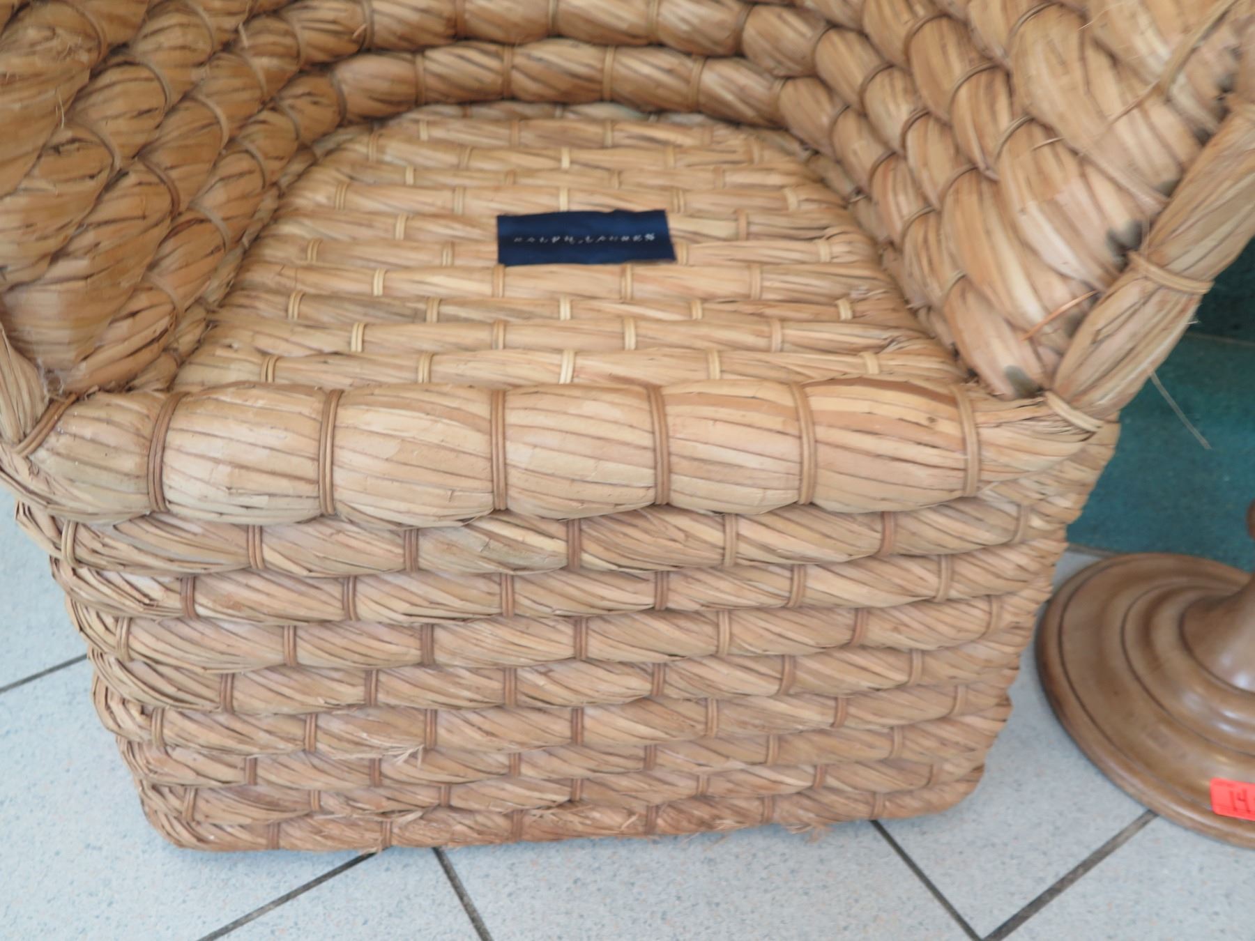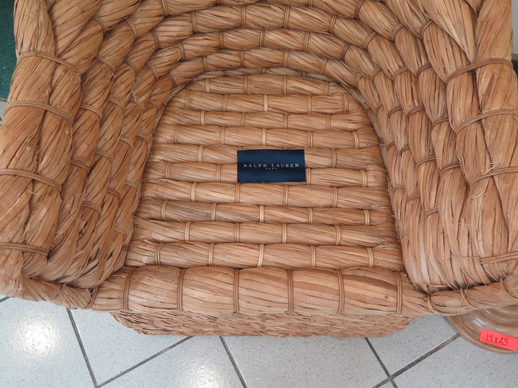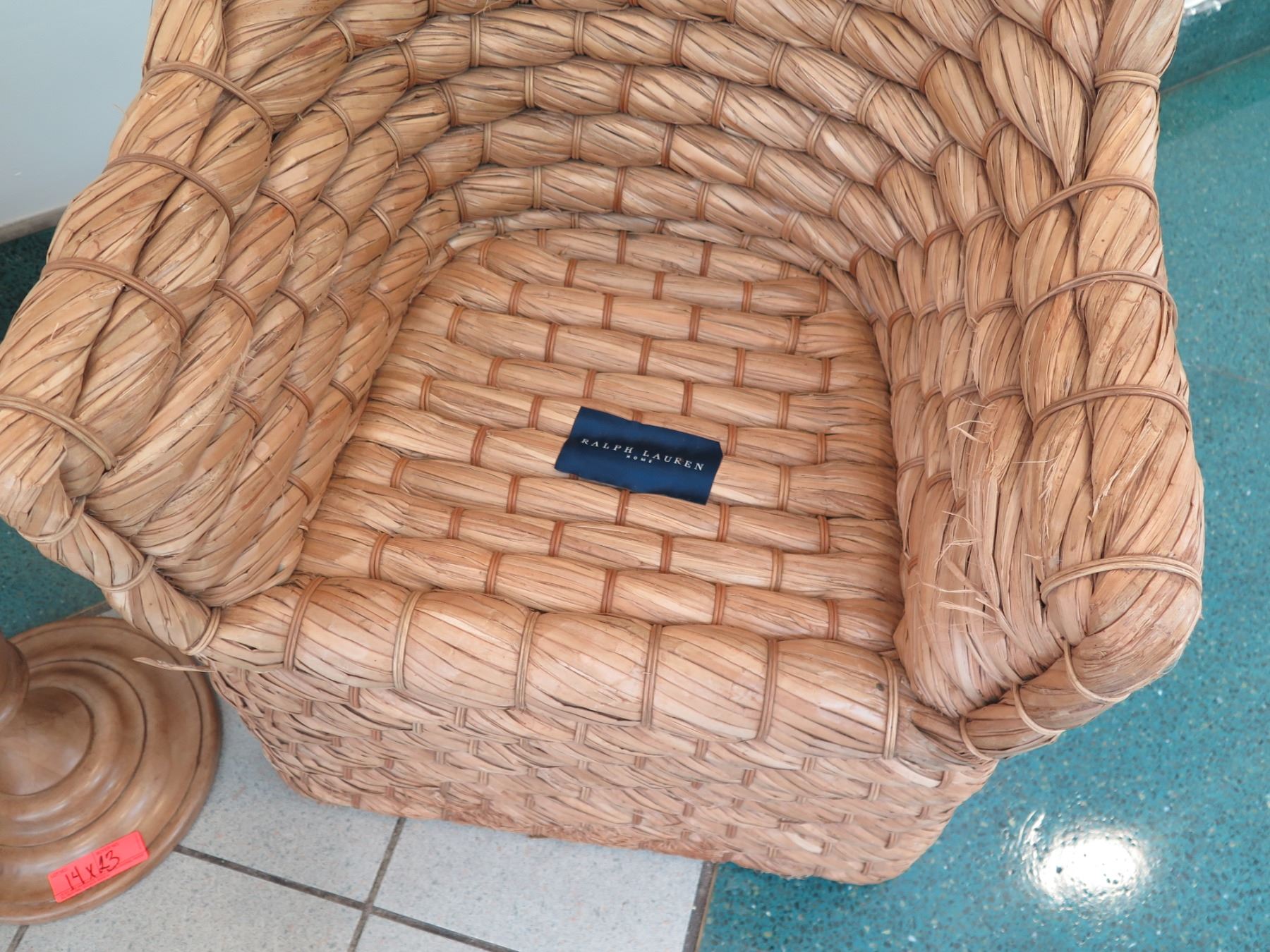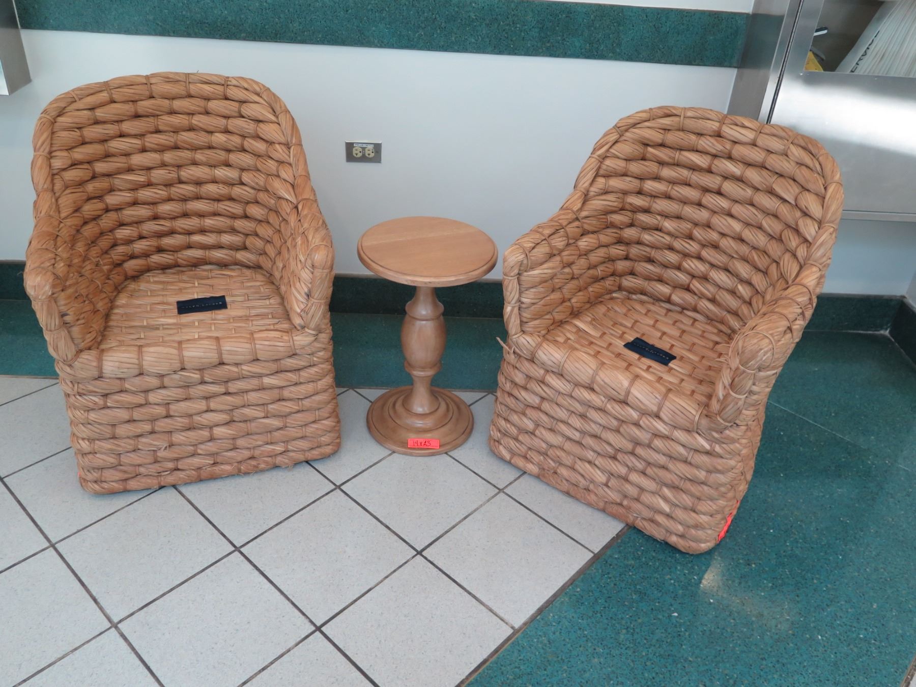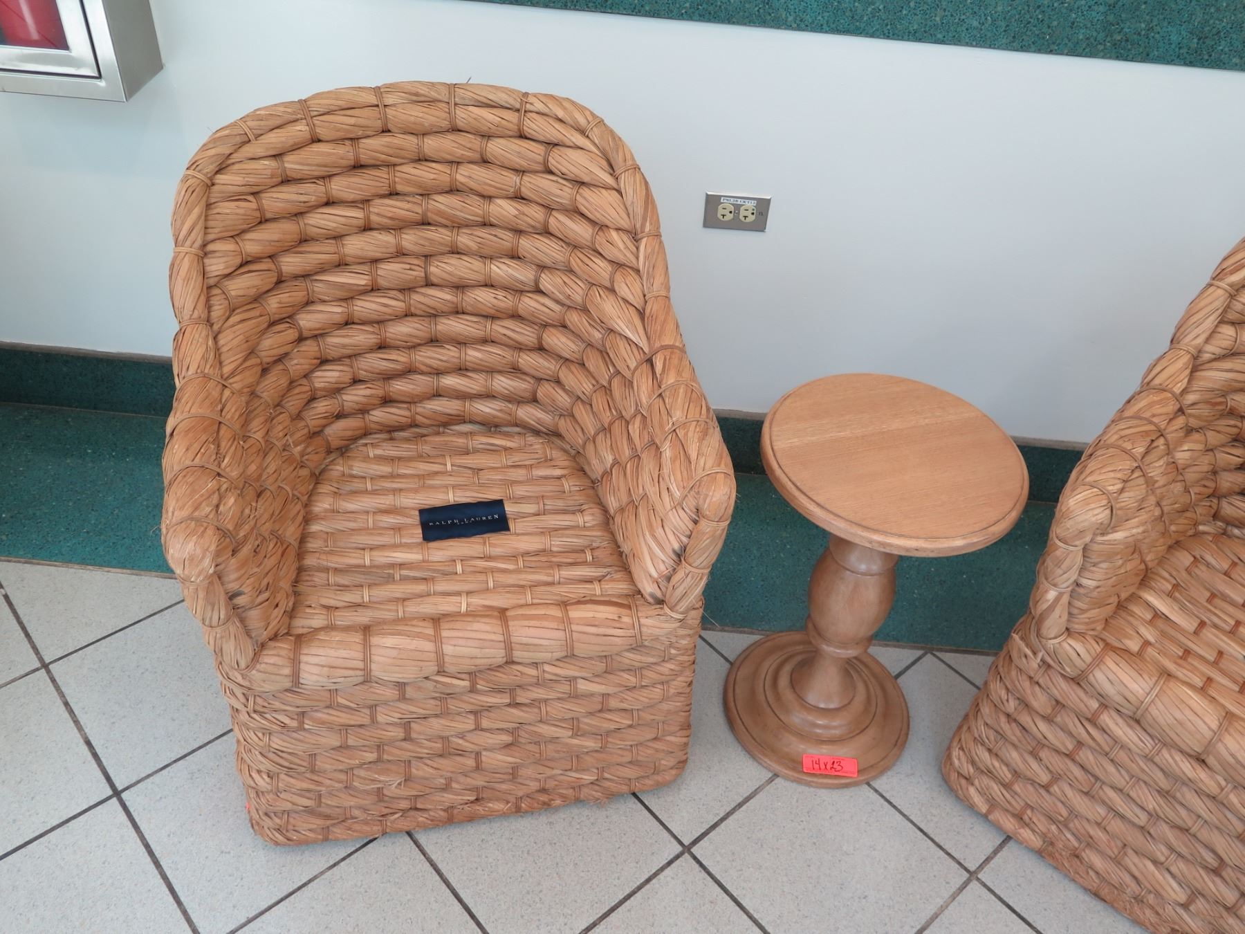Qty 2 Ralph Lauren Joshua Tree Woven Barrel-Back Chairs w/ Accent Table (14" Dia, 23"H), Chairs 26"W x 20" x 34" back height. Please refer to all the pictures in this listing to see general wear and tear on these chairs.