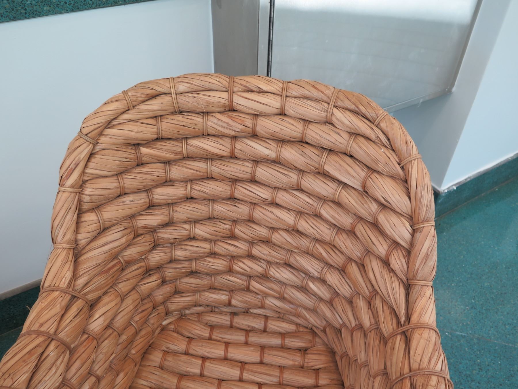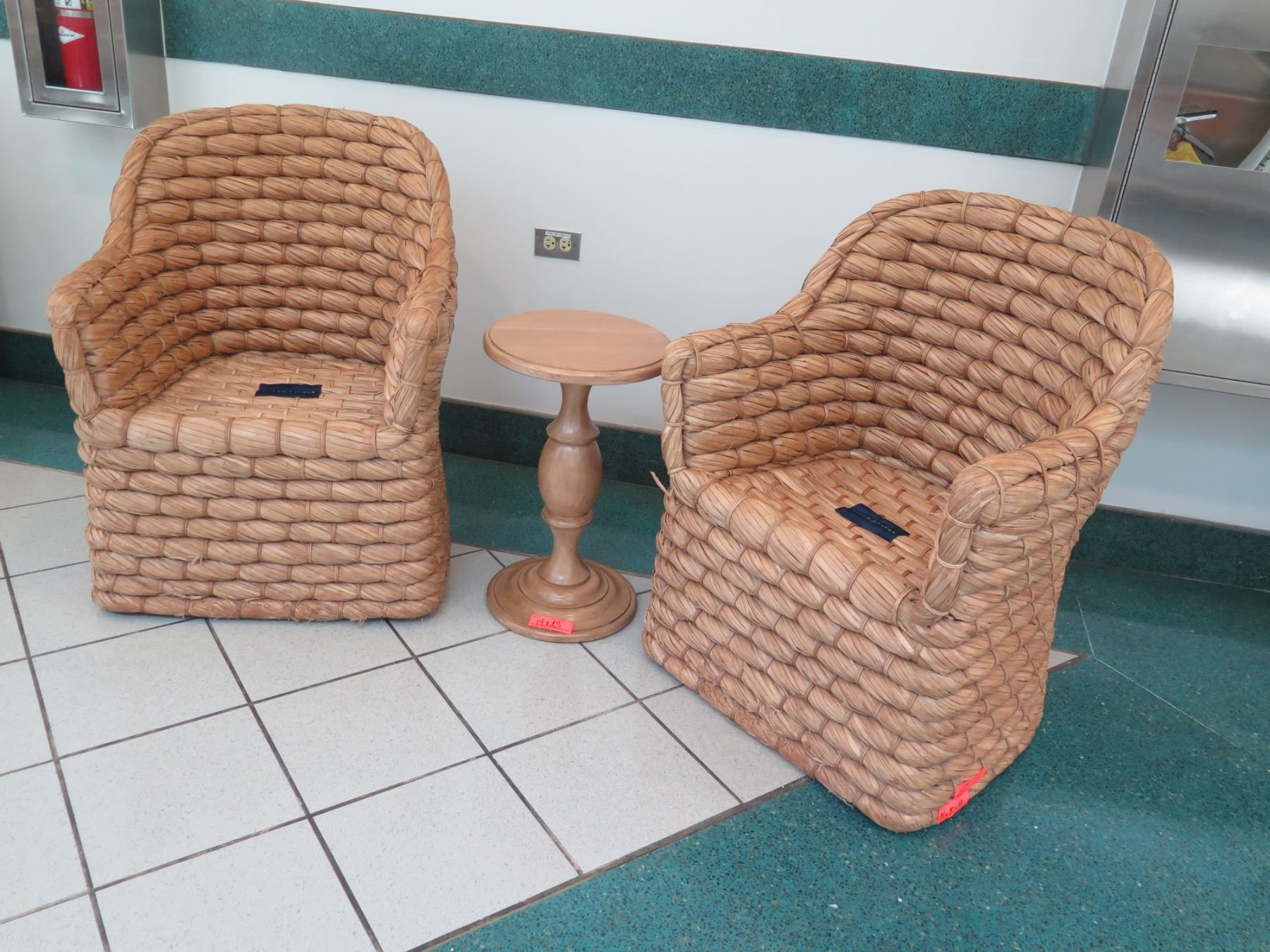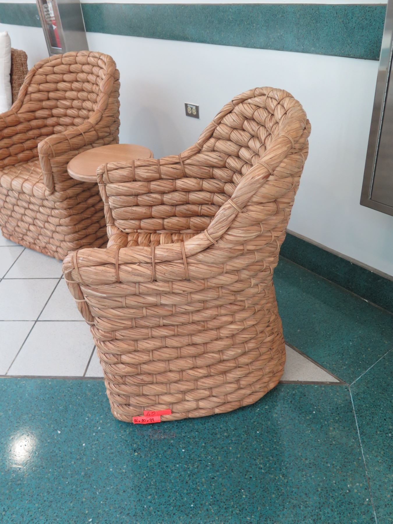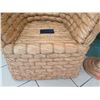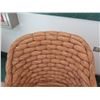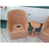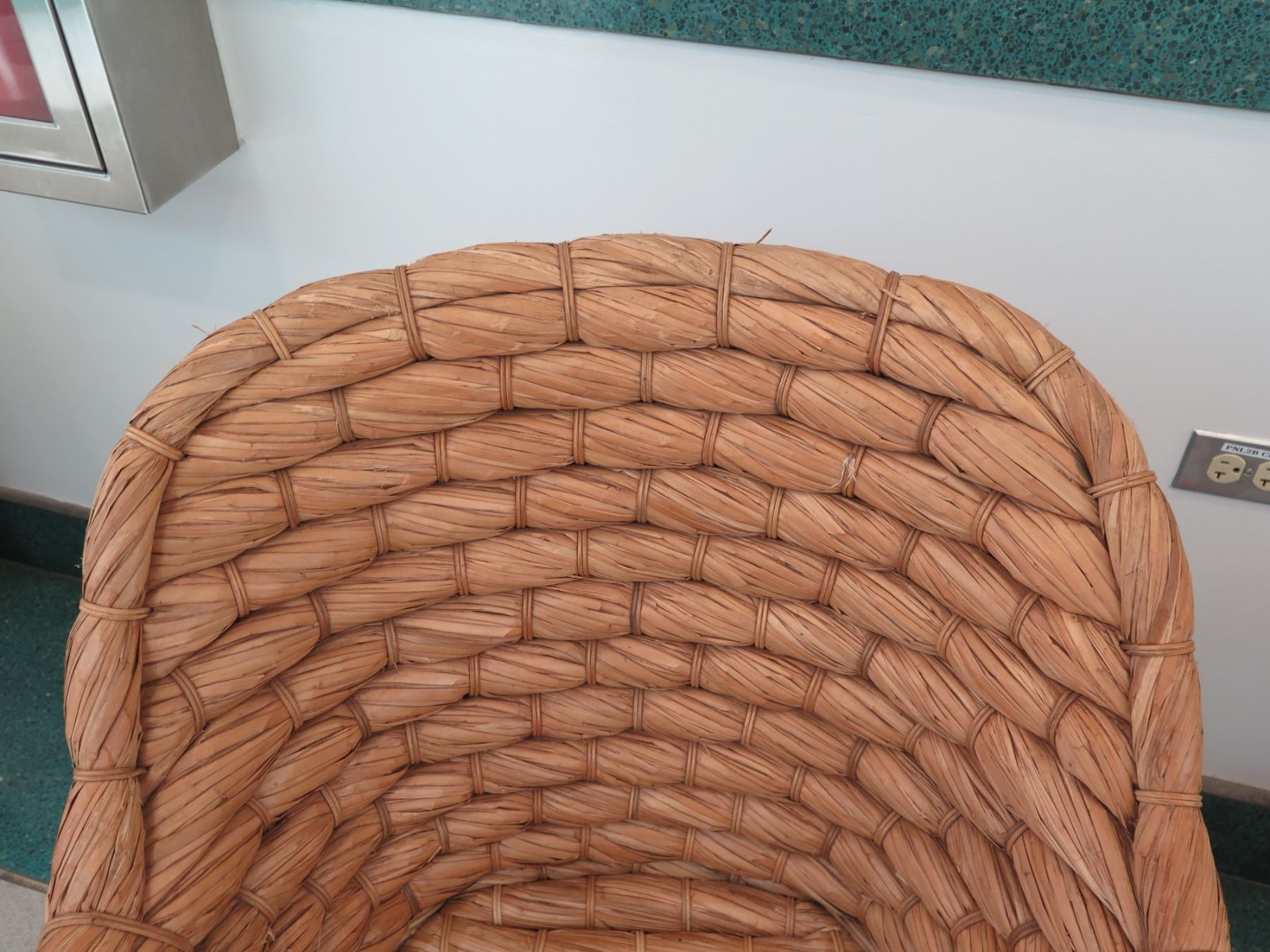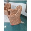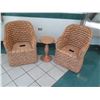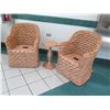 Qty 2 Ralph Lauren Joshua Tree Woven Barrel-Back Chairs w/ Accent Table (14" Dia, 23"H), Chairs 26"W x 20" x 34" back height. Please refer to all the pictures in this listing to see general wear and tear on these chairs.