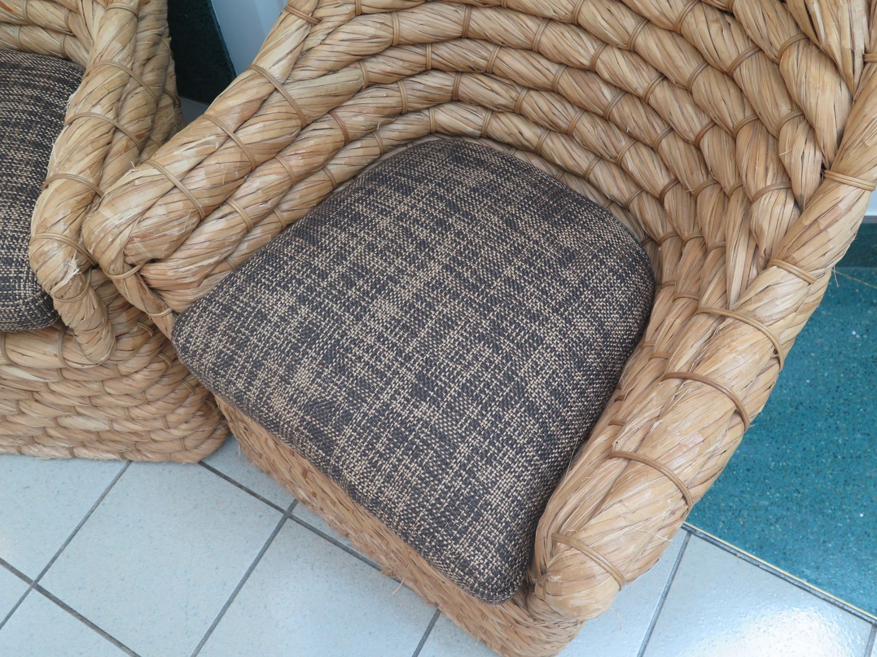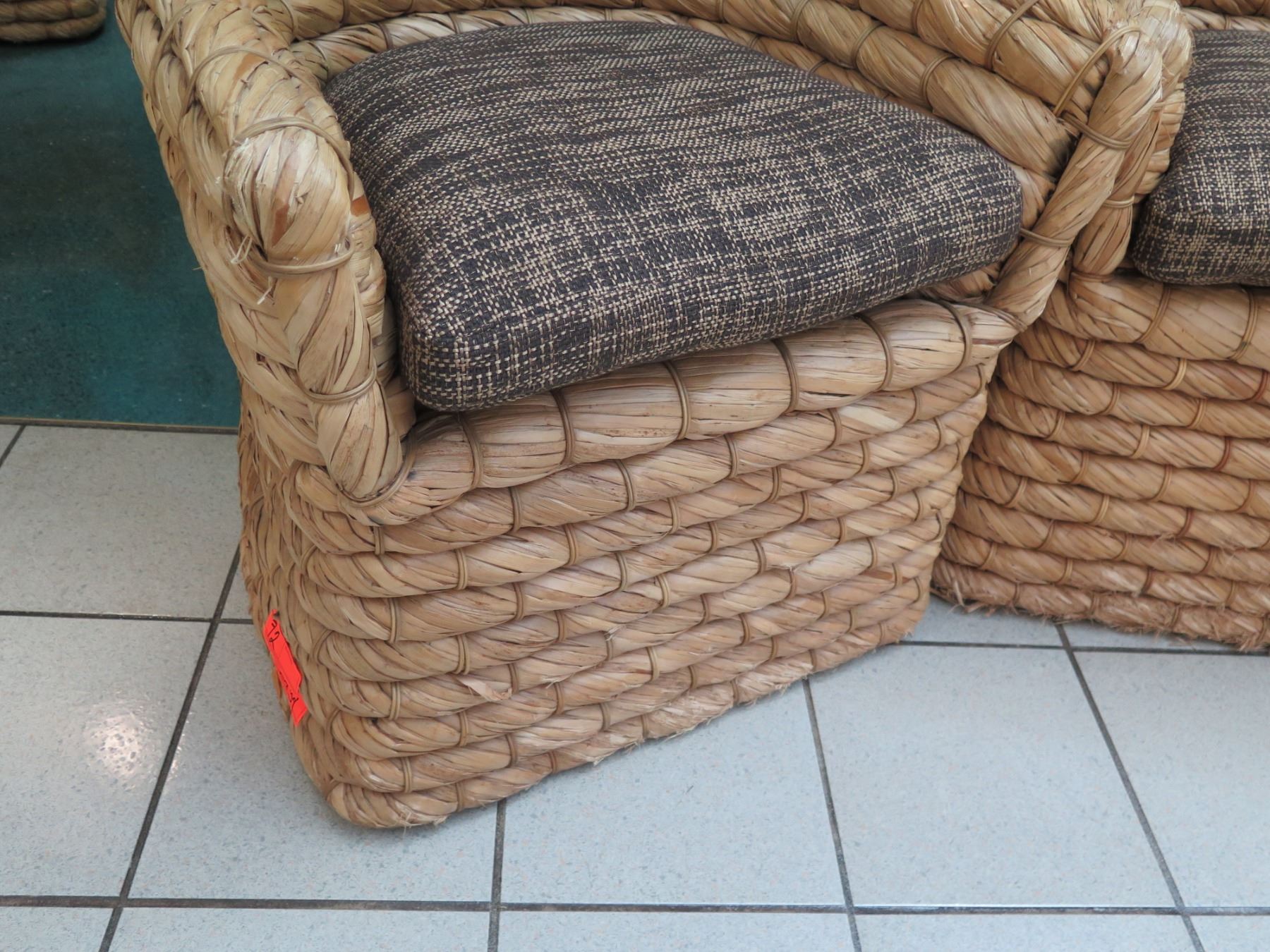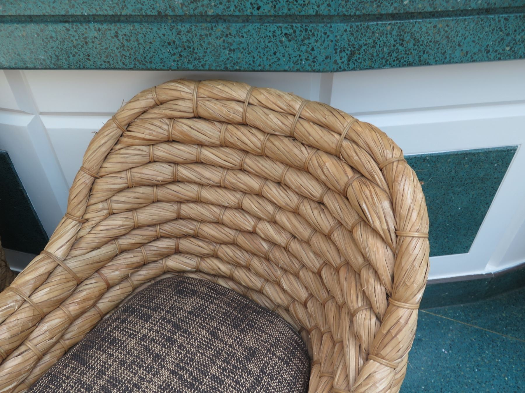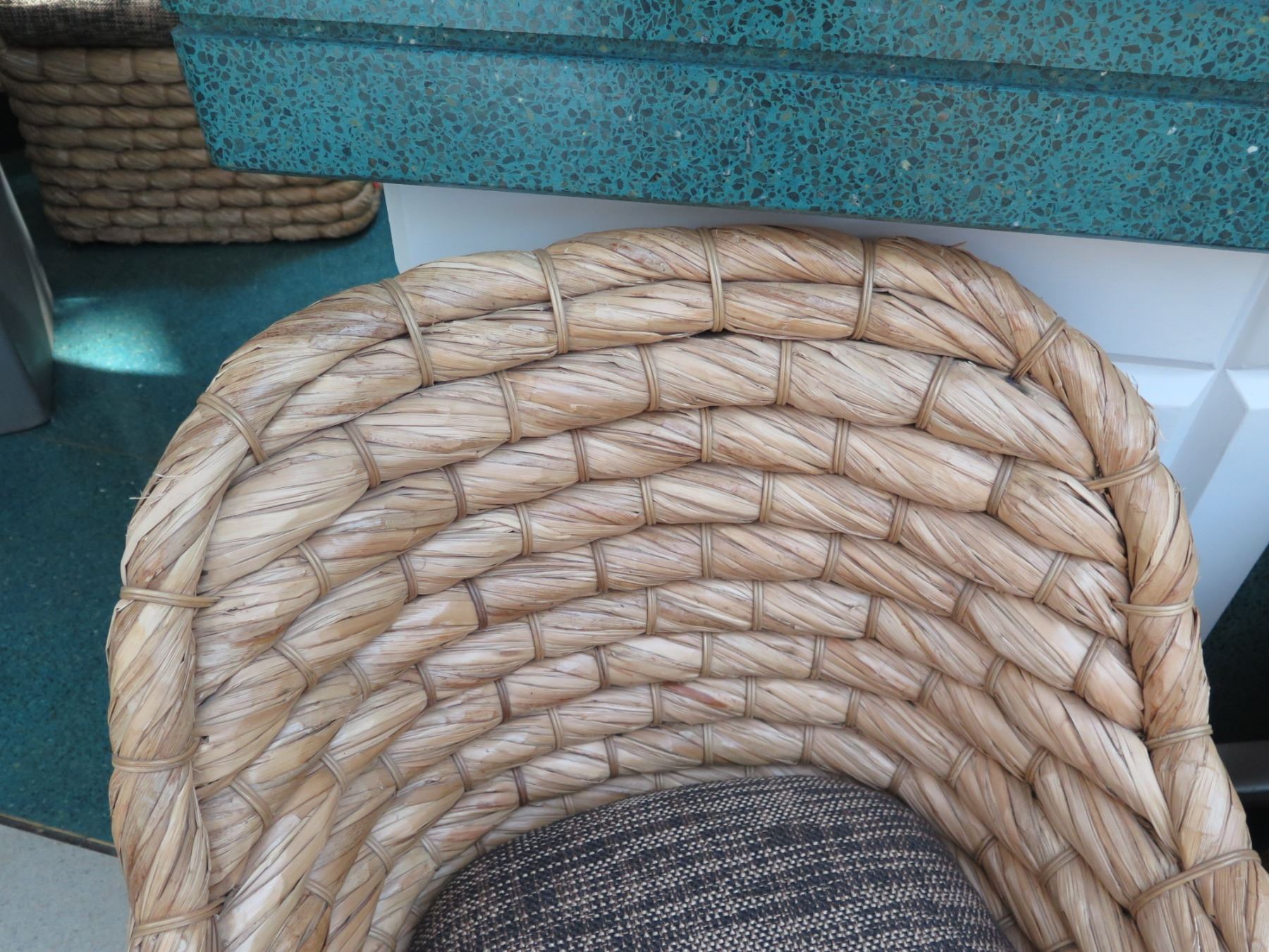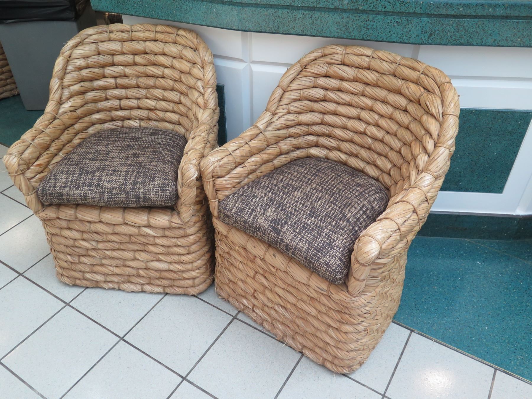 Qty 2 Ralph Lauren Joshua Tree Woven Barrel-Back Chairs w/ Cushions, 26"W x 20" x 34" back height. Please refer to all the pictures in this listing to see general wear and tear on these chairs.
