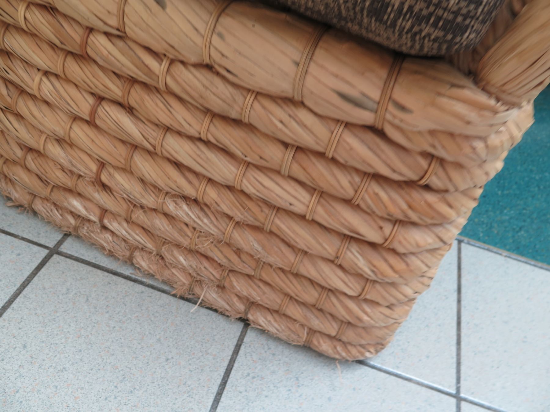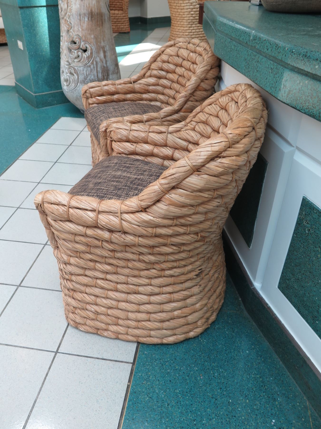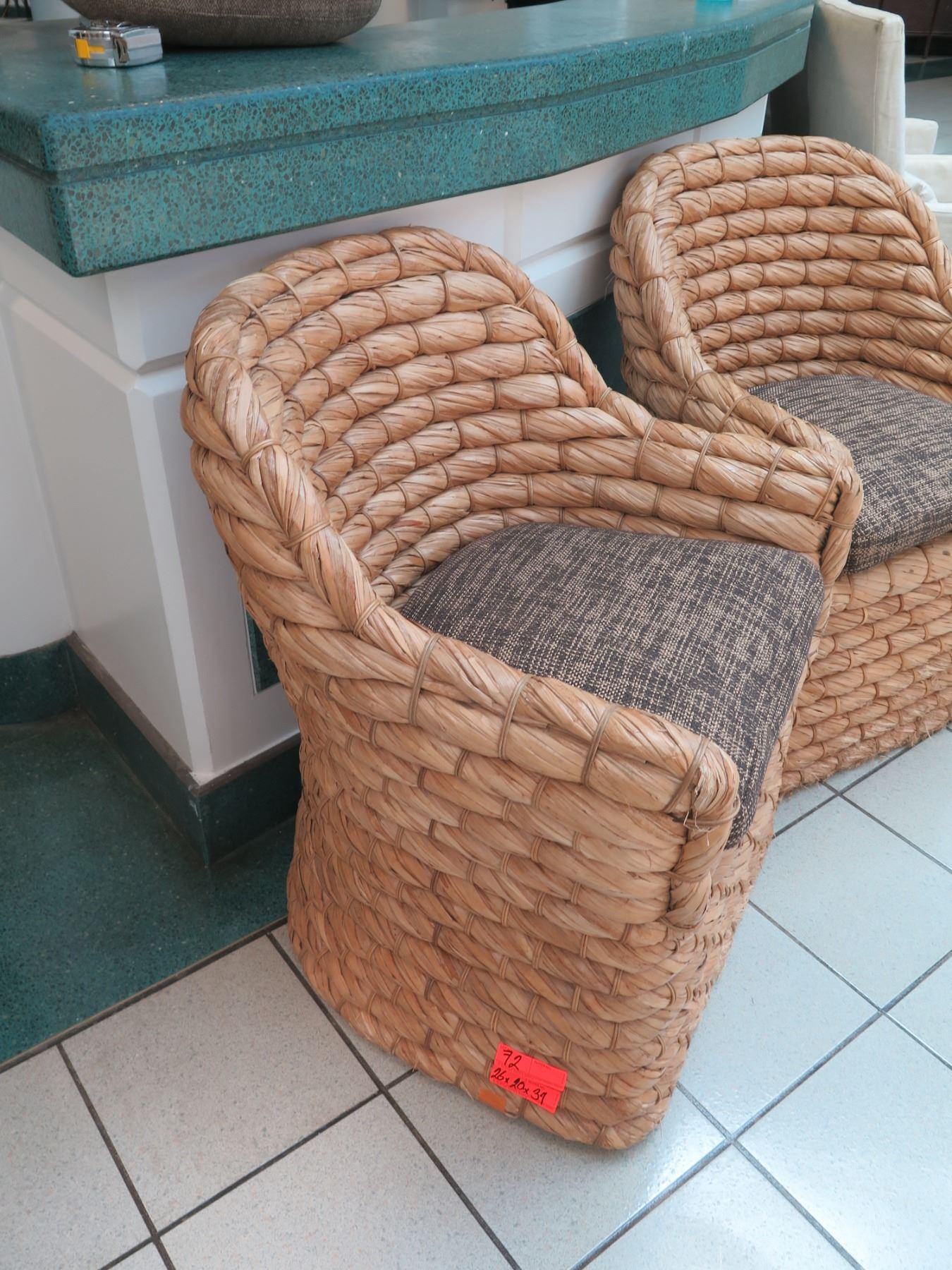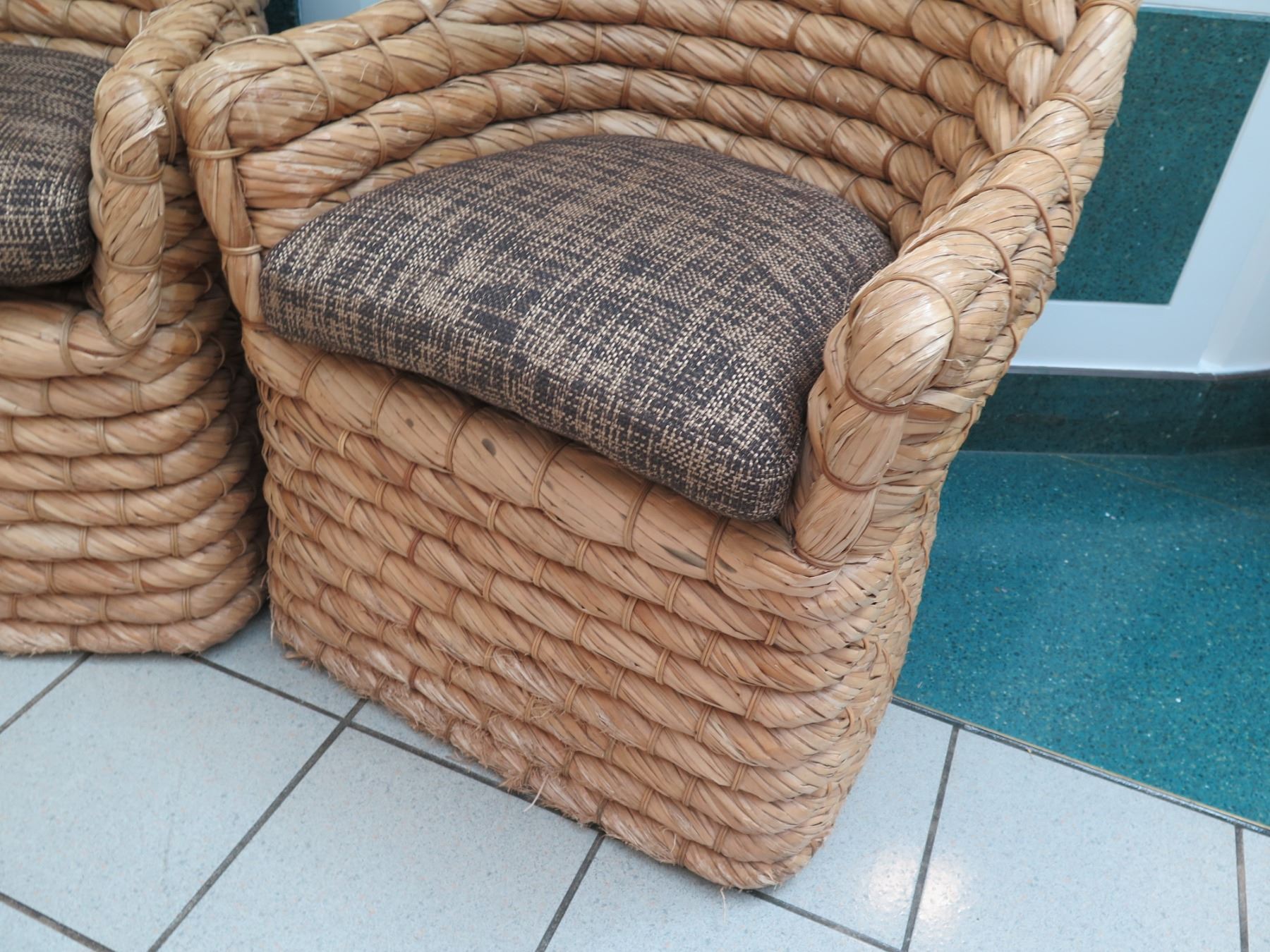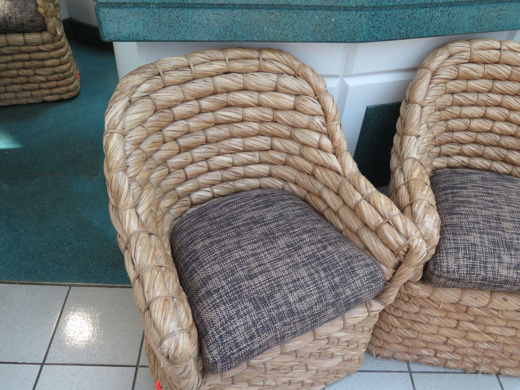 Qty 2 Ralph Lauren Joshua Tree Woven Barrel-Back Chairs w/ Cushions, 26"W x 20" x 34" back height. Please refer to all the pictures in this listing to see general wear and tear on these chairs.