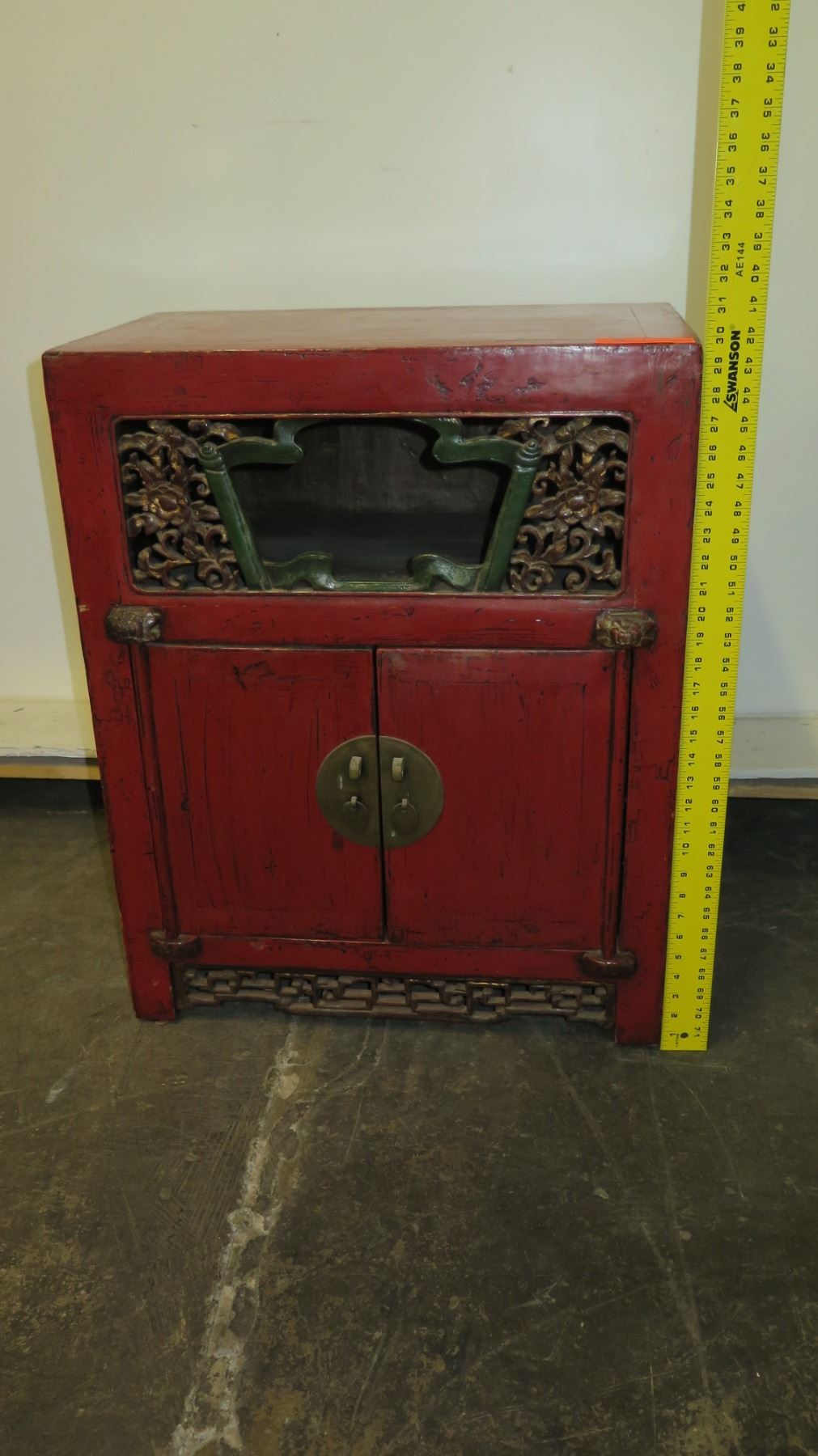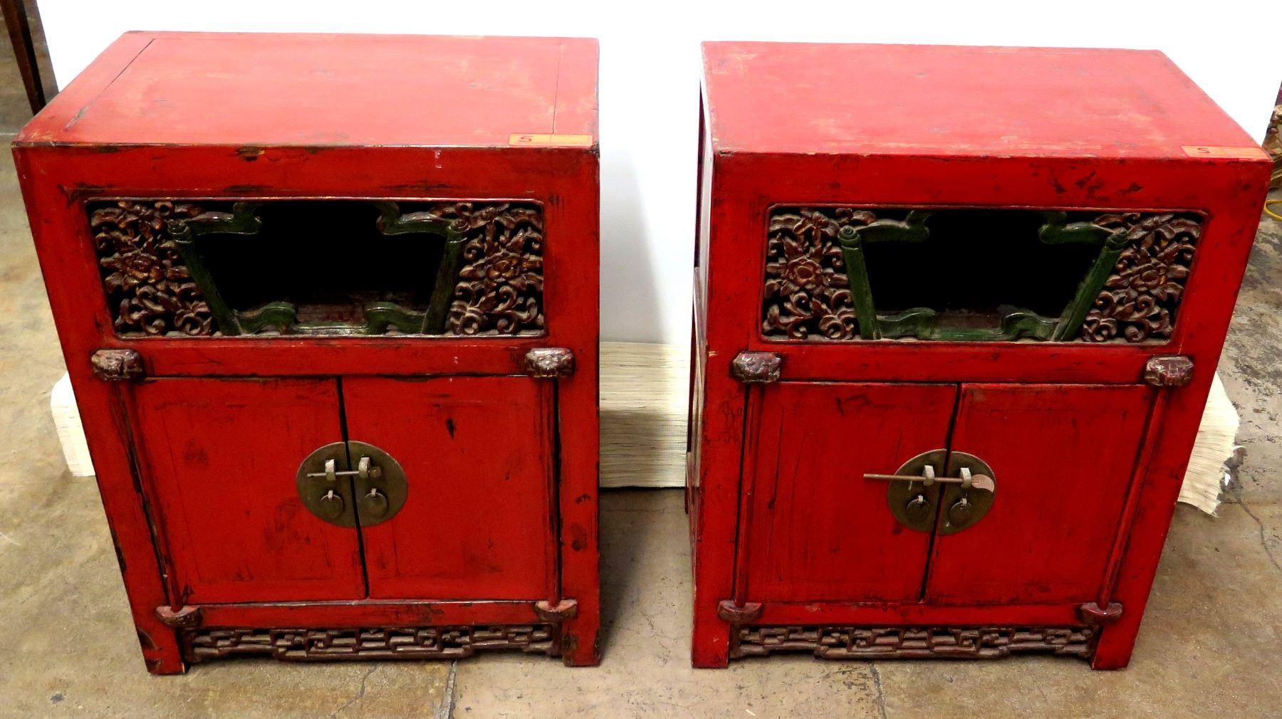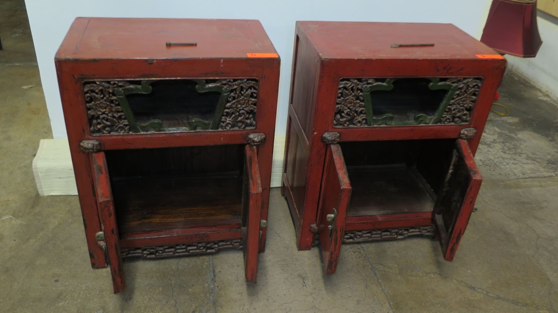 Qty 2 Red Lacquered 2-Door Wooden Oriental Cabinets (End Tables)
