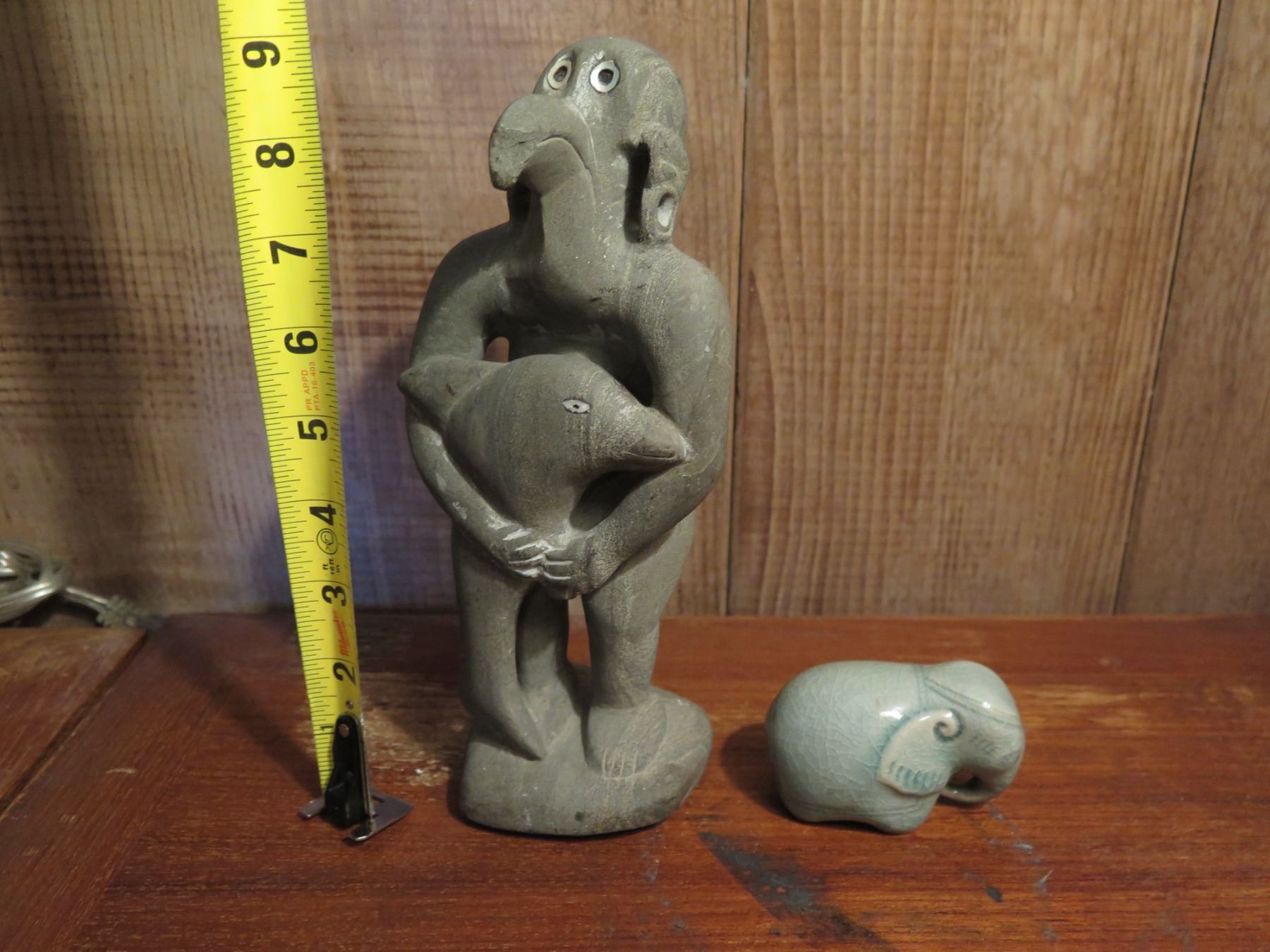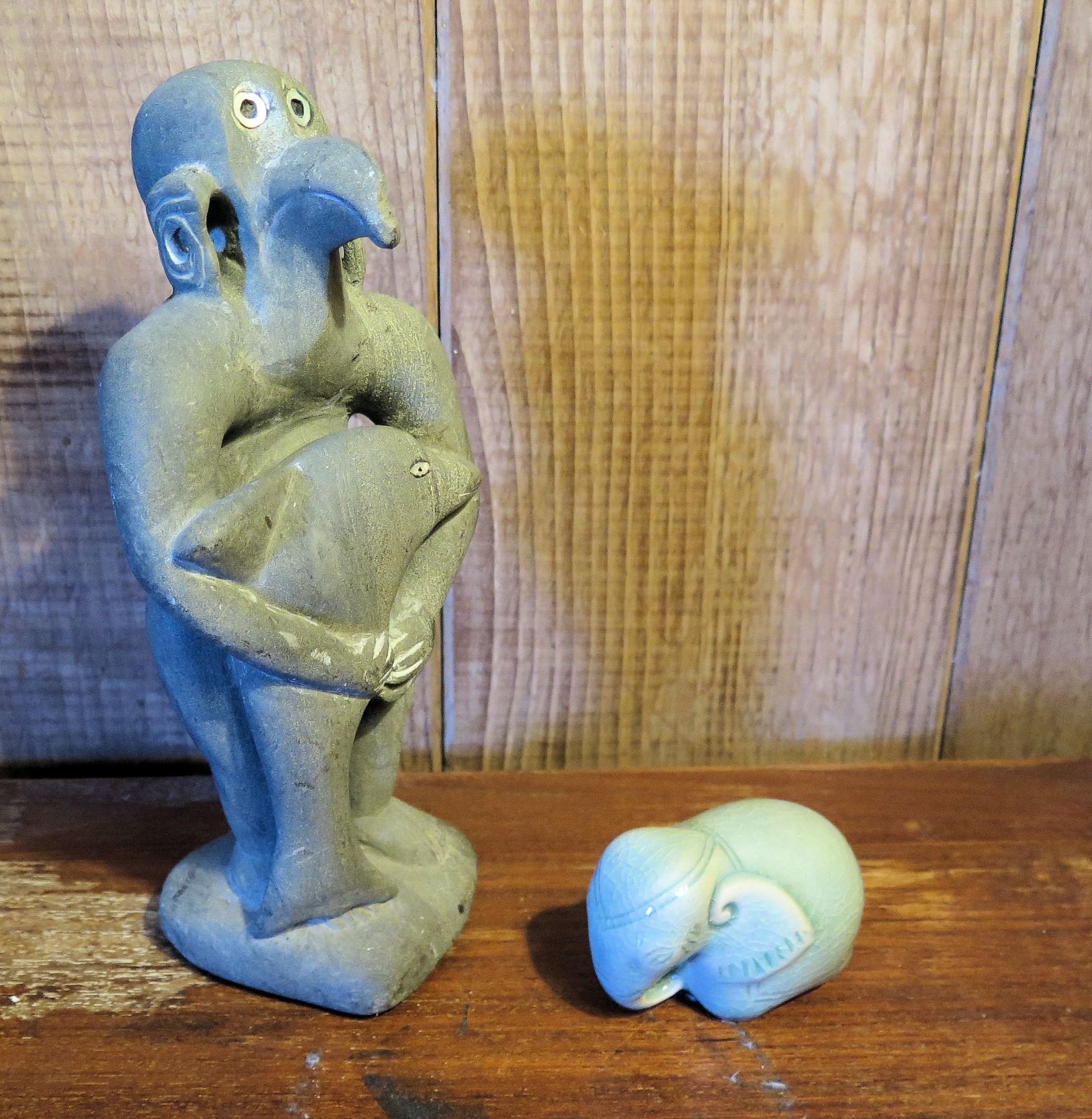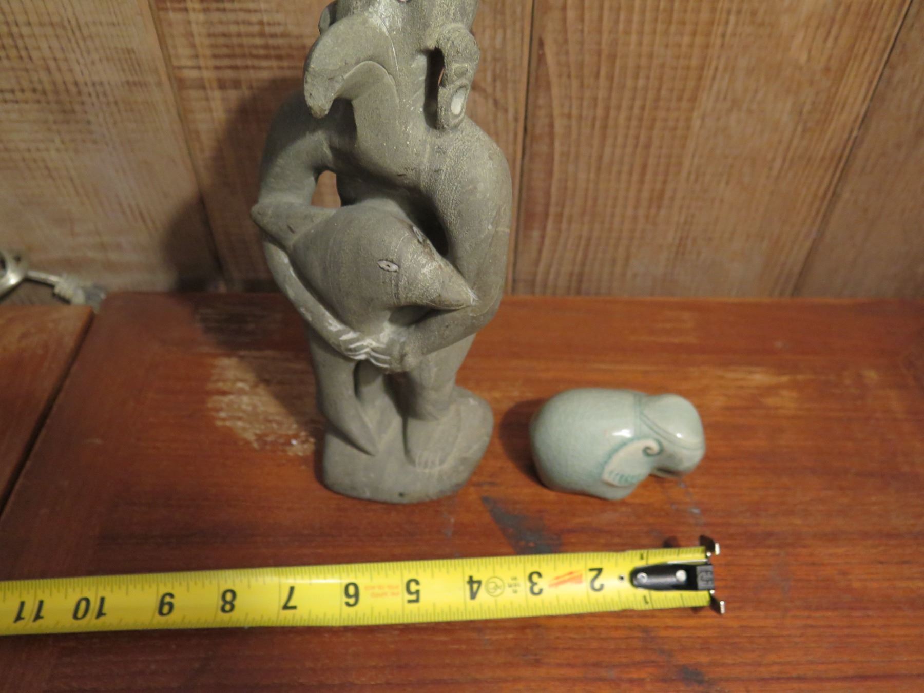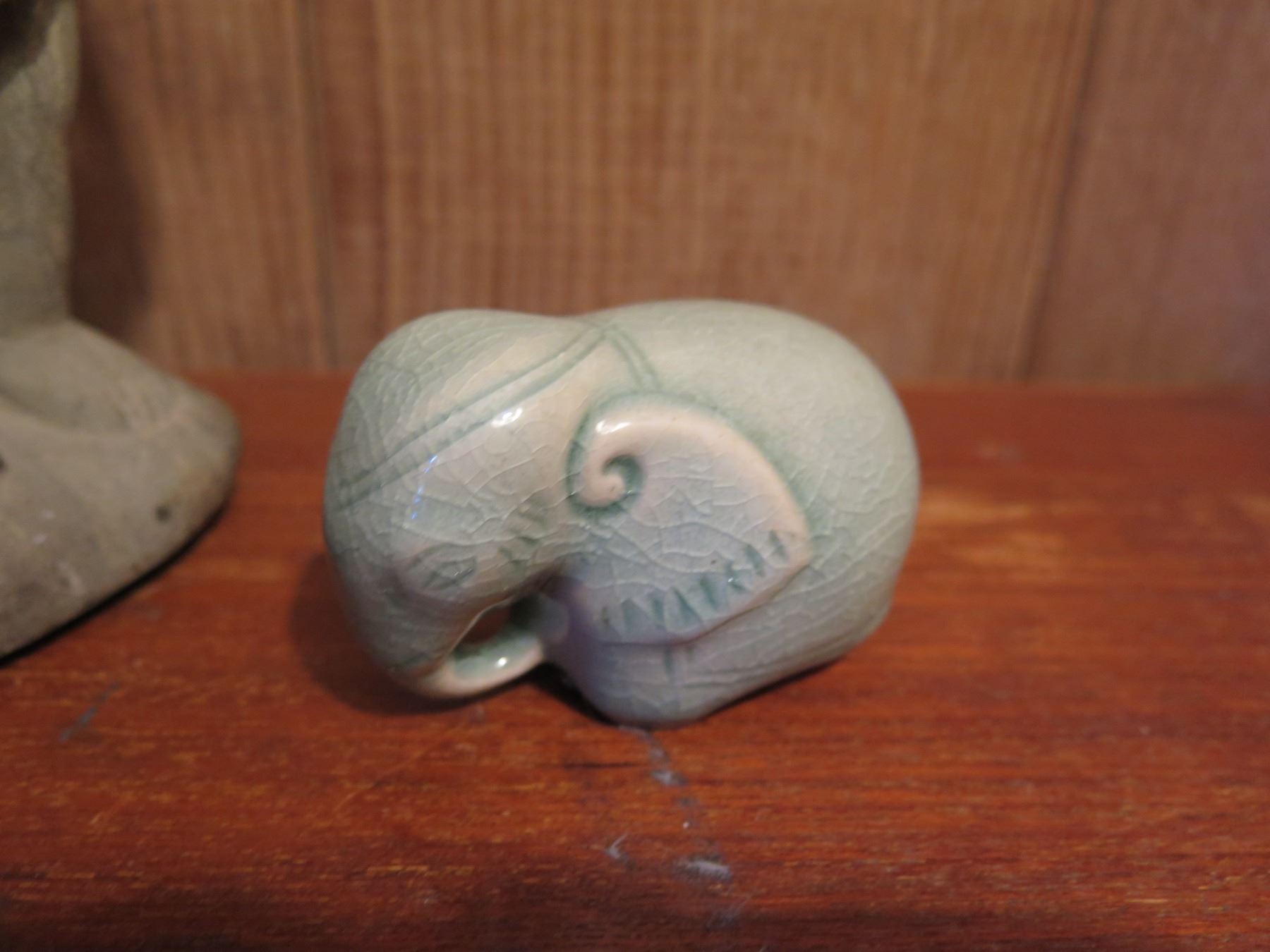 Qty 2 Stone Bird Figurine w/Fish, Glazed Green Elephant