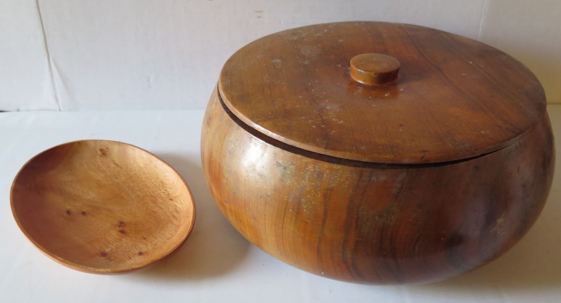 Qty 2 Turned Wooden Bowl w/Lid 13" Dia & Plate 10" Dia