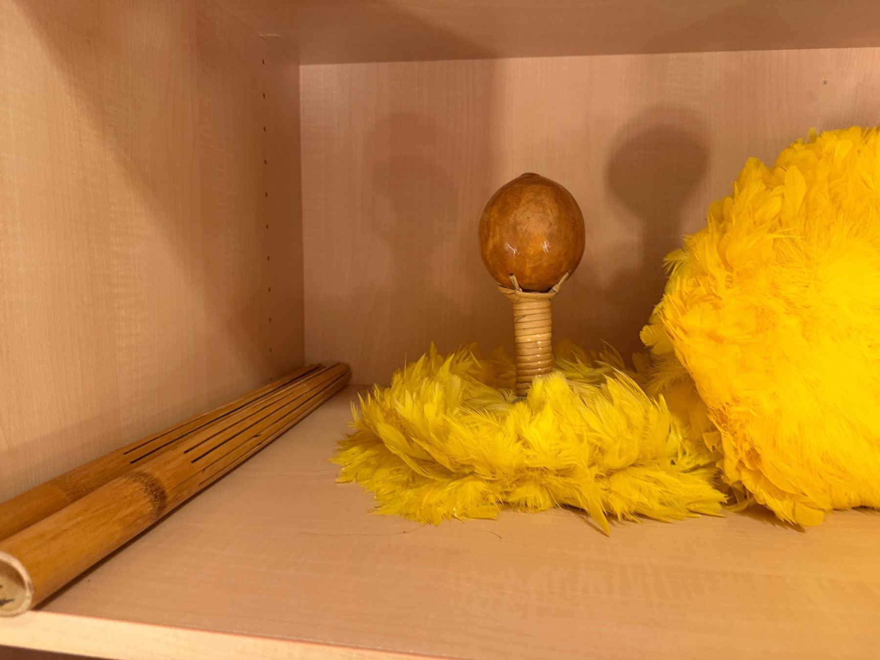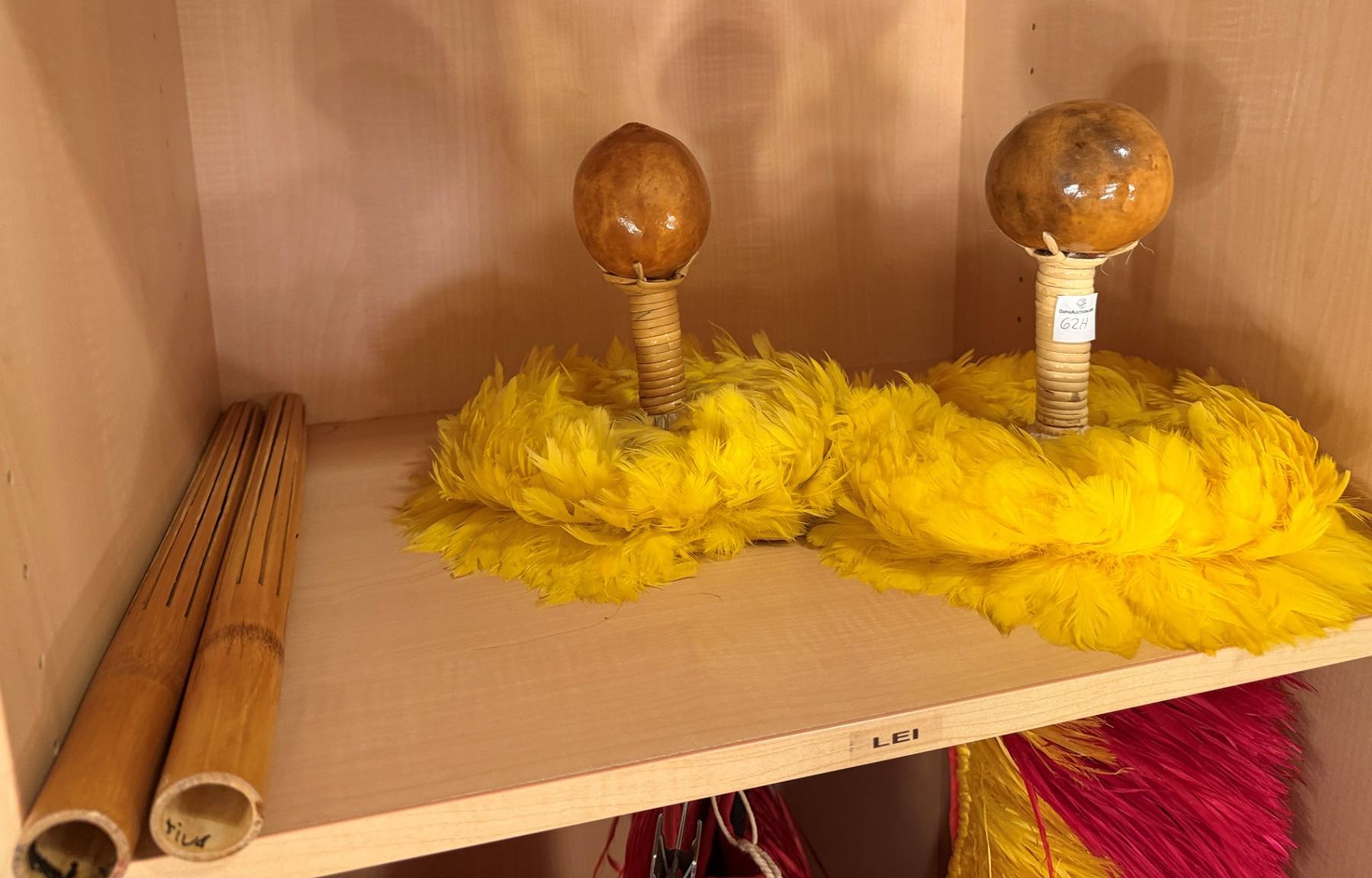 Qty 2 Uli Uli Feathered Gourd Hula Implements & 2 Pu'ili Sticks