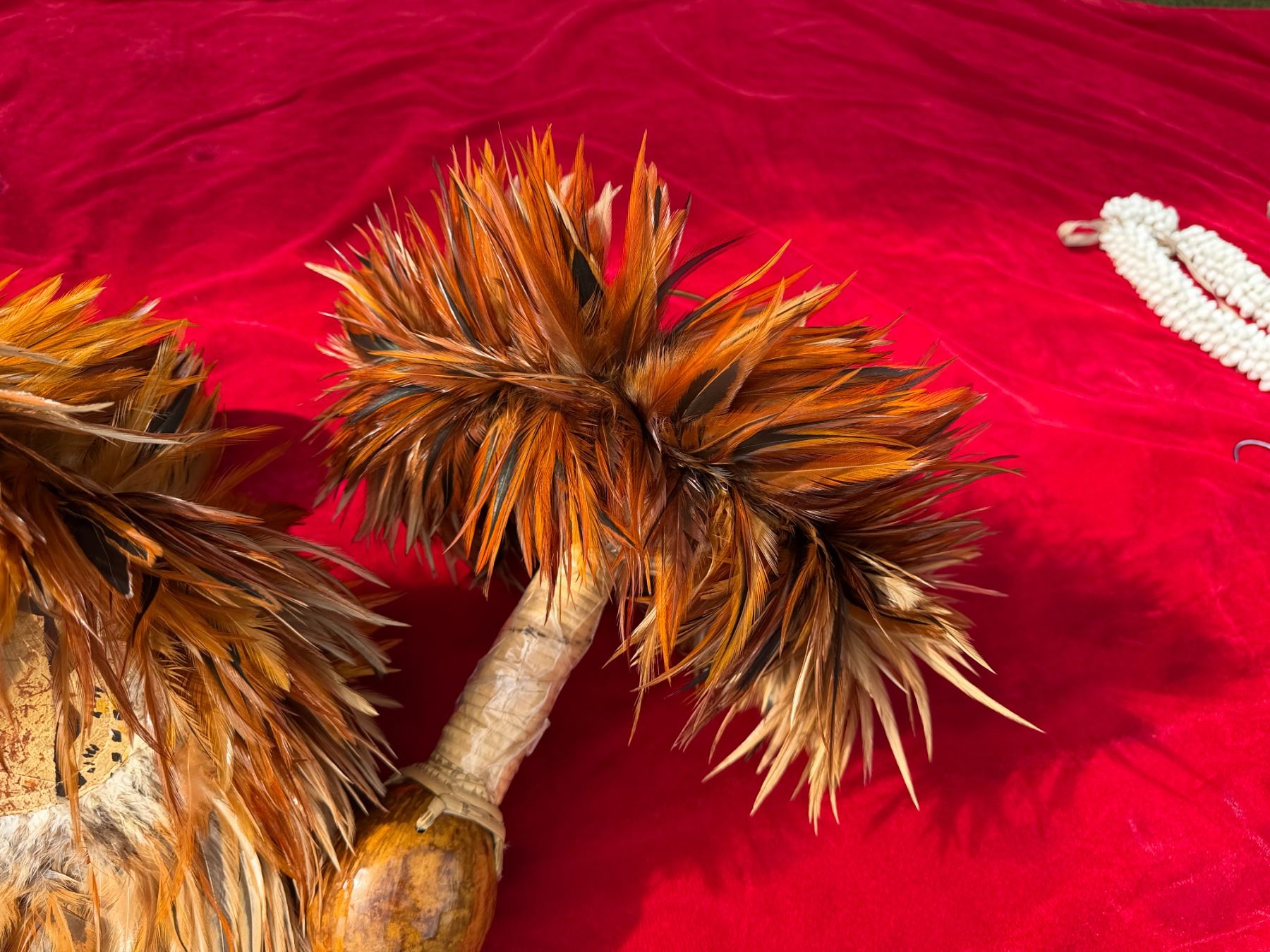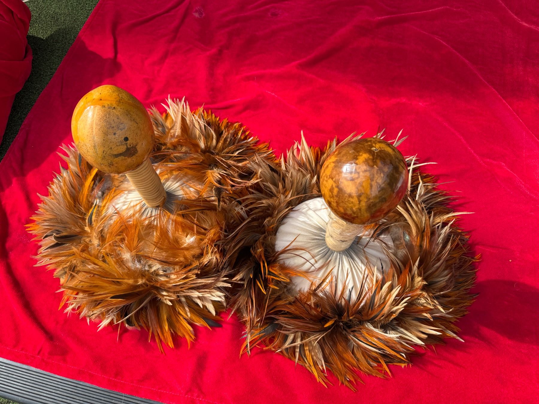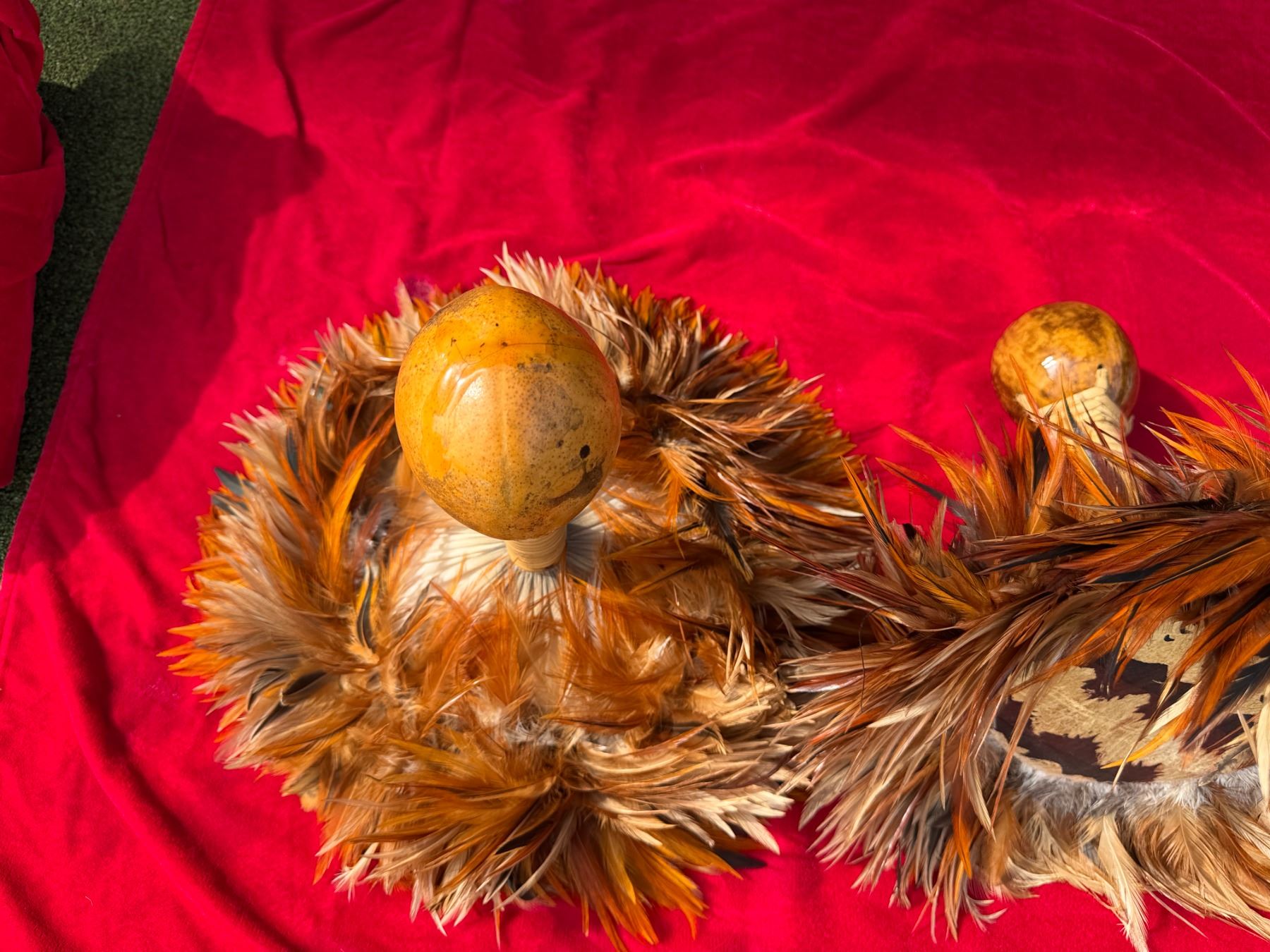 Qty 2 Uli Uli Feathered Gourd Hula Implements w/ Woven Tops